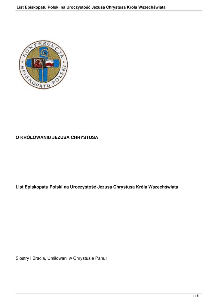 List Episkopatu Polski na Uroczystość Jezusa Chrystusa Króla Wszechświata O KRÓLOWANIU JEZUSA CHRYSTUSA List Episkopatu Polski na Uroczystość Jezusa Chrystusa Króla Wszechświata Siostry i Bracia, Umiłowani w Chrystusie Panu! 1/8 List Episkopatu Polski na Uroczystość Jezusa Chrystusa Króla Wszechświata Dzisiejsza liturgia Słowa ukazuje nam, że prawda o królowaniu Chrystusa ma swe głębokie korzenie biblijne. Przed sądem Piłata Jezus wyznaje: „Tak, jestem królem” (J 18,37). Wcześniej powiedział: „Królestwo moje nie jest z tego świata, […] nie jest stąd” (J 18,36). W ten sposób każe nam uważniej spojrzeć na swoje królowanie. Nie było bowiem problemu z samym uznaniem w Jezusie króla. Wymownym świadectwem tego są pełne zachwytu słowa Natanaela: „Rabbi, Ty jesteś Synem Bożym, Ty jesteś Królem Izraela!” (J 1,49). Niestety, od samego początku brakowało głębszego rozumienia królewskiej godności Chrystusa. Św. Jan Ewangelista przekazuje, jak po cudownym rozmnożeniu chleba chciano Jezusa z Nazaretu obwołać królem (J 6,14-15), aby jeść chleb do sytości i spokojnie żyć. Podobny brak głębszego spojrzenia na prawdę o królowaniu Chrystusa ujawnia się też obecnie. Dlatego w dzisiejszą Uroczystość Jezusa Chrystusa Króla Wszechświata chcemy przypomnieć podstawowe elementy biblijnego orędzia o Jego królowaniu. 1. Królowanie Boga w świecie i pośród ludu Przymierza Psalmy wysławiają Boga, który panuje nad światem stworzeń: „Pan jest Królem – umocnił świat, by się nie poruszył” (Ps 96,10). Autor Psalmu 22. mówi o panowaniu Boga nad dziejami ludów: „wrócą do Pana wszystkie krańce ziemi i oddadzą Mu pokłon wszystkie szczepy pogańskie, bo władza królewska należy do Pana i On panuje nad narodami” (w. 28n). 2/8 List Episkopatu Polski na Uroczystość Jezusa Chrystusa Króla Wszechświata Stary Testament objawia Boga jako obecnego w życiu Izraelitów na podobieństwo Króla: wyprowadził ich z krainy pogan, bronił ich przed głodem i wrogami, ocalił od zagłady w Egipcie, zawarł Przymierze, przeprowadził przez pustynię i wprowadził do Ziemi Obiecanej. Gdy wybudowali Mu w Jerozolimie świątynię, objawiał w niej swoją chwałę. Tak mówi o tym prorok Izajasz: „ujrzałem Pana siedzącego na wysokim i wyniosłym tronie, a tren Jego szaty wypełniał świątynię. Serafiny stały ponad Nim; każdy z nich miał po sześć skrzydeł... I wołał jeden do drugiego: «Święty, Święty, Święty jest Pan Zastępów. Cała ziemia jest pełna Jego chwały». […] Oczy moje oglądały Króla, Pana Zastępów!»” (Iz 6,1-5). W świątyni więc, a nie w pałacu, Bóg wysłuchiwał modlitw o przebaczenie grzechów, uzdrowienie z choroby, ocalenie od niesprawiedliwości, wyzwolenie spod ucisku prześladowców (por. 1 Krl 8,23-60). Bożą pomoc i wsparcie, w tym wielkie zwycięstwa nad wrogami, Izraelici przeżywali jako wydarzenia religijne, a równocześnie jako wezwanie nie do budowania potęgi militarnej, politycznej czy gospodarczej, lecz do odnowienia przymierza z Bogiem i bardziej wiernego wypełniania Bożego Prawa. 2. Zapowiedzi Mesjasza jako idealnego Króla Prorocy Starego Testamentu głosili, że na końcu czasów Bóg da swemu ludowi Mesjasza – Króla, który zaprowadzi w świecie panowanie Boga. Prorok Zachariasz wołał: „Raduj się wielce, Córo Syjonu, wołaj radośnie Córo Jeruzalem! Oto twój Król idzie do ciebie, sprawiedliwy i zwycięski. Pokorny – jedzie na osiołku, na oślątku, źrebięciu oślicy” (Za 9,9n). Izajasz wyjaśniał, na czym będzie polegać królowanie Mesjasza. Namaszczony Duchem Świętym „rozsądzi biednych sprawiedliwie i pokornym w kraju wyda słuszny wyrok. Rózgą swoich ust uderzy gwałtownika, tchnieniem swoich warg uśmierci bezbożnego. Sprawiedliwość będzie mu pasem na biodrach, a wierność przepasaniem lędźwi” (Iz 11,4-5). 3/8 List Episkopatu Polski na Uroczystość Jezusa Chrystusa Króla Wszechświata Natomiast zasadniczym dziełem Mesjasza – Króla będzie uwolnienie ludu z jarzma grzechów i śmierci: „wyda swe życie na ofiarę za grzechy, […] usprawiedliwi wielu, ich nieprawości On sam dźwigać będzie” (Iz 53,10-11). W tym prorockim programie misji idealnego Króla nie ma żadnej aluzji do ziemskiego panowania. Mowa jest o tym, że Mesjasz-Król objawi narodom wolę Boga (por. Iz 42,1-6) oraz pokaże ubogim i pokornym, jak ją wypełniać; że sam posłuszny Bogu usunie bunt, grzech Adama i dokona przemiany człowieka, jednając go z Bogiem. 3. Królestwo Boże przychodzi w Jezusie Pan Jezus rozpoczął swą misję od znamiennych słów: „Czas się już wypełnił. Przybliżyło się do was królestwo Boże! Nawracajcie się i wierzcie w Ewangelię” (Mk 1,14-15). W ten sposób zwiastuje początek królowania Boga wewnątrz dziejów świata i rodzaju ludzkiego, poprzez zamieszkania Boga pośród nas. „Zapytany przez faryzeuszów, kiedy przyjdzie królestwo Boże, odpowiedział im: «Królestwo Boże nie przyjdzie dostrzegalnie; i nie powiedzą: ‘Oto tu jest’ albo: ‘Tam’. Oto bowiem królestwo Boże pośród was jest»” (Łk 17,20-21). Chodzi tu o Jego własną Osobę – Mesjasza-Króla i Jego działanie, w którym objawiała się moc i miłość Boga. Bożą mocą Jezus uzdrawiał chorych i wypędzał złe duchy. Miłością miłosierną Boga przemieniał grzeszników i celników, odpuszczając im nawet najcięższe grzechy. Natomiast Janowi Chrzcicielowi, który przez uczniów pytał z więzienia, czy królowanie Boga już przyszło, 4/8 List Episkopatu Polski na Uroczystość Jezusa Chrystusa Króla Wszechświata odpowiedział: „Idźcie i oznajmijcie Janowi to, co słyszycie i na co patrzycie: niewidomi wzrok odzyskują, chromi chodzą, trędowaci doznają oczyszczenia, głusi słyszą, umarli zmartwychwstają, ubogim głosi się Ewangelię” (Mt 11,2-5). Tak oznajmia, że panowanie Boga je