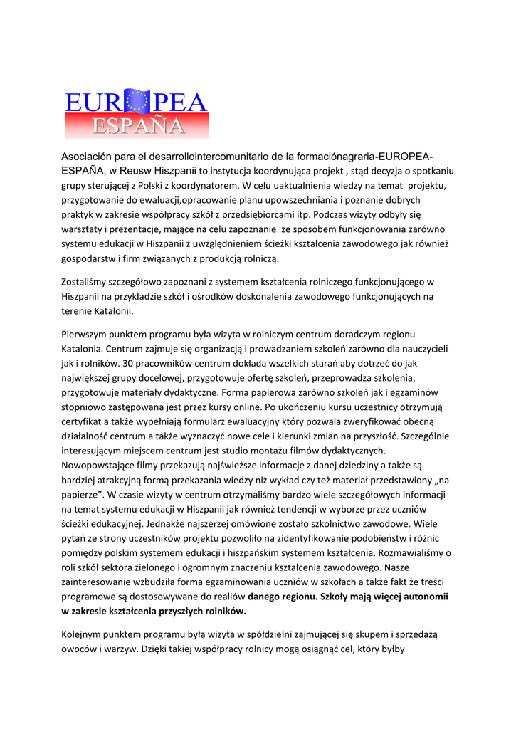 EUR PEA ESPAÑA Asociación para el desarrollointercomunitario de la formaciónagraria-EUROPEAESPAÑA, w Reusw Hiszpanii to instytucja koordynująca projekt , stąd decyzja o spotkaniu grupy sterującej z Polski z koordynatorem. W celu uaktualnienia wiedzy na temat projektu, przygotowanie do ewaluacji,opracowanie planu upowszechniania i poznanie dobrych praktyk w zakresie współpracy szkół z przedsiębiorcami itp. Podczas wizyty odbyły się warsztaty i prezentacje, mające na celu zapoznanie ze sposobem funkcjonowania zarówno systemu edukacji w Hiszpanii z uwzględnieniem ścieżki kształcenia zawodowego jak również gospodarstw i firm związanych z produkcją rolniczą. Zostaliśmy szczegółowo zapoznani z systemem kształcenia rolniczego funkcjonującego w Hiszpanii na przykładzie szkół i ośrodków doskonalenia zawodowego funkcjonujących na terenie Katalonii. Pierwszym punktem programu była wizyta w rolniczym centrum doradczym regionu Katalonia. Centrum zajmuje się organizacją i prowadzaniem szkoleń zarówno dla nauczycieli jak i rolników. 30 pracowników centrum dokłada wszelkich starań aby dotrzeć do jak największej grupy docelowej, przygotowuje ofertę szkoleń, przeprowadza szkolenia, przygotowuje materiały dydaktyczne. Forma papierowa zarówno szkoleń jak i egzaminów stopniowo zastępowana jest przez kursy online. Po ukończeniu kursu uczestnicy otrzymują certyfikat a także wypełniają formularz ewaluacyjny który pozwala zweryfikować obecną działalność centrum a także wyznaczyć nowe cele i kierunki zmian na przyszłość. Szczególnie interesującym miejscem centrum jest studio montażu filmów dydaktycznych. Nowopowstające filmy przekazują najświeższe informacje z danej dziedziny a także są bardziej atrakcyjną formą przekazania wiedzy niż wykład czy też materiał przedstawiony „na papierze”. W czasie wizyty w centrum otrzymaliśmy bardzo wiele szczegółowych informacji na temat systemu edukacji w Hiszpanii jak również tendencji w wyborze przez uczniów ścieżki edukacyjnej. Jednakże najszerzej omówione zostało szkolnictwo zawodowe. Wiele pytań ze strony uczestników projektu pozwoliło na zidentyfikowanie podobieństw i różnic pomiędzy polskim systemem edukacji i hiszpańskim systemem kształcenia. Rozmawialiśmy o roli szkół sektora zielonego i ogromnym znaczeniu kształcenia zawodowego. Nasze zainteresowanie wzbudziła forma egzaminowania uczniów w szkołach a także fakt że treści programowe są dostosowywane do realiów danego regionu. Szkoły mają więcej autonomii w zakresie kształcenia przyszłych rolników. Kolejnym punktem programu była wizyta w spółdzielni zajmującej się skupem i sprzedażą owoców i warzyw. Dzięki takiej współpracy rolnicy mogą osiągnąć cel, który byłby nieosiągalny działając w pojedynkę. Mogliśmy obejrzeć proces od momentu zakupu produktu od rolnika do momentu jego zapakowania w celu sprzedaży. Z dużym zaciekawieniem śledziliśmy proces produkcji oliwy z oliwek. Istniała również możliwość zakupu oliwy z oliwek, samych oliwek czy też świeżych owoców i warzyw. Bardzo interesująca dla uczestników projektu była wizyta w szkole rolniczej o specjalności architektura krajobrazu. Podziwialiśmy 4ty w Europie ogród usytuowany w budynku szkoły. Ciekawe i inspirujące były klasopracownie a w jednej z nich ściana kwiatowa zaprojektowana, wykonana i pielęgnowana przez uczniów. Imponujące było również zaplecze dydaktyczne wokół budynku szkoły w postaci 4 szklarni, budynku mechanizacji, boiska szkolnego, na którym trenowały dzieci – Mogliśmy podziwiać śródziemnomorską roślinność i ciekawe rozwiązania architektoniczne. Na tak dużym terenie znajduje się również miejsce gdzie młodzież wykonuje prace zaliczeniowe z elementów udostępnionych im na ten cel. Na pewno wiele rozwiązań dyrektorzy szkół mogą wykorzystać w swoich szkołach. Mimo iż o ten teren dba tylko 2 pracowników i młodzież w czasie zajęć, jest on bardzo dobrze utrzymany. Dyrektor placówki zachęcał do współpracy międzynarodowej. Obecnie szkoła współpracuje ze szkołami we Francji. 20 letnia winnica położona na urokliwym wzgórzu była kolejnym miejscem które odwiedziliśmy. Gospodarz oprowadził nas po plantacji winorośli opowiadając o procesie produkcji wina od momentu zerwania owocu aż do momentu butelkowania wina. Byliśmy również w piwniczce gdzie wino jest przechowywane. Właściciel winnicy wskazywał na różnice w produkcji wina dla supermarketów a także, tak jak jest to w jego przypadku, dla indywidualnych odbiorców. W ramach wyjazdu odbyły się także wycieczki krajoznawcze a także kulturoznawcze. Szczegółowo zostaliśmy również zapoznani ze specyfiką rolnictwa hiszpańskiego ze szczególnym zwrócenie uwagi na rolnictwo i przetwórstwo funkcjonujące w Katalonii. Informacje i obserwacje które poczyniliśmy w ramach tego wyjazdu są bardzo ciekawe i dają możliwość porównania systemu kształcenia i doskonalenia zawodowego w obu krajach, pozwala na wyciągnięcie bardzo ciekawych wniosków jak również pozwala na korzystanie z doświadczeń, które są już zdobyte i zastosowe z powadzeniem w Hiszpanii. System kształcenia rolniczego w Hiszpanii jest systemem ogólnokrajowym ściśle powiązanym i jednolitym, jest to bardzo ważna uwaga gdyż w Polsce ciągle występuje system dwutorowy szkoły prowadzone przez Ministerstwo Rolnictwa rozwijające się dobrze i dobrze skonsolidowane oraz rolnicze szkoły prowadzone przez powiaty które są niedoinwestowane a ich szeroki zakres kształcenia (zawody rolnicze i inne) nie pozwala na osiąganie odpowiednich standardów kształcenia. W Hiszpanii ilość szkół jest ograniczona liczebnie i dostosowana do potrzeb rynku oraz wszystkie placówki rolnicze podlegają ministerstwu rolnictwa. Zapoznając się z ich funkcjonowanie można jednoznacznie stwierdzić, że ten system sp