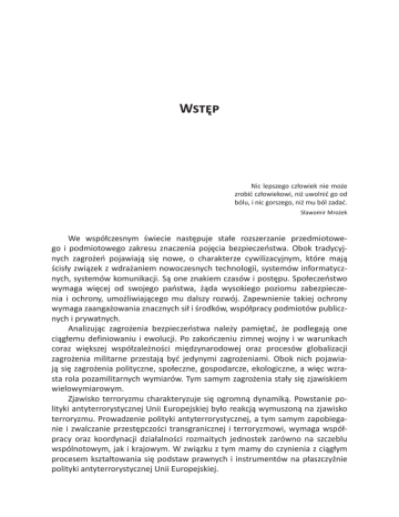 Wstęp Nic lepszego człowiek nie może zrobić człowiekowi, niż uwolnić go od bólu, i nic gorszego, niż mu ból zadać. Sławomir Mrożek We współczesnym świecie następuje stałe rozszerzanie przedmiotowego i podmiotowego zakresu znaczenia pojęcia bezpieczeństwa. Obok tradycyjnych zagrożeń pojawiają się nowe, o charakterze cywilizacyjnym, które mają ścisły związek z wdrażaniem nowoczesnych technologii, systemów informatycznych, systemów komunikacji. Są one znakiem czasów i postępu. Społeczeństwo wymaga więcej od swojego państwa, żąda wysokiego poziomu zabezpieczenia i ochrony, umożliwiającego mu dalszy rozwój. Zapewnienie takiej ochrony wymaga zaangażowania znacznych sił i środków, współpracy podmiotów publicznych i prywatnych. Analizując zagrożenia bezpieczeństwa należy pamiętać, że podlegają one ciągłemu definiowaniu i ewolucji. Po zakończeniu zimnej wojny i w warunkach coraz większej współzależności międzynarodowej oraz procesów globalizacji zagrożenia militarne przestają być jedynymi zagrożeniami. Obok nich pojawiają się zagrożenia polityczne, społeczne, gospodarcze, ekologiczne, a więc wzrasta rola pozamilitarnych wymiarów. Tym samym zagrożenia stały się zjawiskiem wielowymiarowym. Zjawisko terroryzmu charakteryzuje się ogromną dynamiką. Powstanie polityki antyterrorystycznej Unii Europejskiej było reakcją wymuszoną na zjawisko terroryzmu. Prowadzenie polityki antyterrorystycznej, a tym samym zapobieganie i zwalczanie przestępczości transgranicznej i terroryzmowi, wymaga współpracy oraz koordynacji działalności rozmaitych jednostek zarówno na szczeblu wspólnotowym, jak i krajowym. W związku z tym mamy do czynienia z ciągłym procesem kształtowania się podstaw prawnych i instrumentów na płaszczyźnie polityki antyterrorystycznej Unii Europejskiej. 10 Wstęp Chociaż na rynku wydawniczym istnieje wiele pozycji mających za przedmiot analizę problematyki bezpieczeństwa, w tym terroryzmu, to celem pracy jest analiza polityki antyterrorystycznej Unii Europejskiej, gdzie Unia jest podmiotem jako organizacja międzynarodowa, a przedmiotem sama polityka antyterrorystyczna. Ponadto istotne będzie wykazanie zależności polityki antyterrorystycznej od poziomu integracji państw członkowskich, a także związku funkcjonalnego zachodzącego pomiędzy harmonizacją przepisów prawa krajowego z prawem wspólnotowym w dziedzinie bezpieczeństwa, dlatego że proces ten nie został zakończony i trwa nadal. Tylko dzięki analizie porównawczej aktów prawnych o charakterze wewnętrznym w wybranych państwach członkowskich UE można będzie dostrzec, na jakim etapie zachodzi harmonizacja prawa Unii Europejskiej z prawem wybranych państw członkowskich oraz ustalić, czy skuteczność polityki antyterrorystycznej zależy od sposobu prowadzenia polityki migracyjnej przez dane państwo członkowskie. Należy podkreślić, że praca ma przede wszystkim charakter analizy prawnoinstytucjonalnej. Celem publikacji jest również przybliżenie kwestii związanych z polityką bezpieczeństwa Unii Europejskiej i poszczególnych państw członkowskich. Ochrona bezpieczeństwa przed wszelkimi zagrożeniami, a w szczególności przed terroryzmem, wymaga od poszczególnych członków społeczeństwa zrzeczenia się części swojej osobistej wolności i swobody dla wspólnego dobra i zapewnienia sobie oraz pozostałym jednostkom bezpiecznych warunków egzystencji oraz umożliwienia realizacji swoich własnych życiowych celów. Autorka zagadnienia wychodzi naprzeciw potrzebie ustalenia i usystematyzowania zagadnień związanych z tak ważną problematyką. Badanie będzie miało na celu określenie zależności pomiędzy bezpieczeństwem wewnętrznym UE, a tym samym polityką antyterrorystyczną, a poziomem integracji państw członkowskich oraz zakresem funkcji ochronnych, jakie bezpieczeństwo ma realizować. To pozwoli uzyskać wstępną odpowiedź na pytania, czym jest zjawisko terroryzmu oraz do jakich celów powinna zmierzać współczesna polityka antyterrorystyczna na gruncie prawa wspólnotowego. To z kolei umożliwi poznanie odpowiedzi, w jakim zakresie prowadzenie polityki antyterrorystycznej wymaga współpracy oraz koordynacji działalności rozmaitych jednostek. Dwie wcześniejsze odpowiedzi doprowadzą do głównego celu badawczego, którym jest znalezienie odpowiedzi na pytania, w jakim zakresie integracja europejska wpłynęła na poziom harmonizacji polityki antyterrorystycznej i czy prawo krajowe na przykładzie wybranych państw jest na dzień dzisiejszy w pełni zharmonizowane z prawem Unii Europejskiej w zakresie polityki antyterrorystycznej. Analiza genezy i istoty polityki antyterrorystycznej UE, której podmiotem jest Unia, pozwoli na wykazanie, że istnieje polityka antyterrorystyczna UE, która podlega ciągłej ewolucji oraz że mamy do czynienia z procesem, który nie został Wstęp 11 zakończony i trwa nadal. W celu określenia przedmiotu polityki antyterrorystycznej UE, czyli zagrożenia terroryzmem, trzeba będzie wykonać badanie wstępne, polegające na zdefiniowaniu istoty i zakresu terroryzmu, uwarunkowania zagrożeń terrorystycznych w Unii Europejskiej oraz przeanalizować działania organizacji terrorystycznych. Określenie przyczyny zaistnienia zjawiska terroryzmu w Unii Europejskiej (czynniki wewnętrzne i czynniki zewnętrzne) pozwoli na stwierdzenie, jaki wpływ zjawisko terroryzmu wywiera na politykę Unii Europejskiej, oraz wykaże, że przyczyną powstania polityki jest również brak istnienia odpowiednich mechanizmów i regulacji w tym zakresie, w związku z czym mamy do czynienia z procesem instytucjonalizacji. Analiza podstaw normatywnych pozwoli na wykazanie zależności polityki antyterrorystycznej od poziomu integracji państw członkowskich, a także związku funkcjonalnego zachodzącego pomiędzy harmonizacją przepisów prawa krajowego (na wybranych przykładach