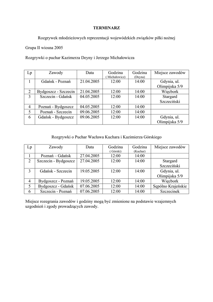 TERMINARZ Rozgrywek młodzieżowych reprezentacji wojewódzkich związków piłki nożnej Grupa II wiosna 2005 Rozgrywki o puchar Kazimerza Deyny i Jerzego Michałowicza Lp Zawody Data Godzina Godzina ( Michałowicz) (Deyna) 1 Gdańsk - Poznań 21.04.2005 12:00 14:00 2 3 Bydgoszcz - Szczecin Szczecin - Gdańsk 21.04.2005 04.05.2005 12:00 12:00 14:00 14:00 4 5 6 Poznań - Bydgoszcz Poznań - Szczecin Gdańsk - Bydgoszcz 04.05.2005 09.06.2005 09.06.2005 12:00 12:00 12:00 14:00 14:00 14:00 Miejsce zawodów Gdynia, ul. Olimpijska 5/9 Więcbork Stargard Szczeciński Gdynia, ul. Olimpijska 5/9 Rozgrywki o Puchar Wacława Kuchara i Kazimierza Górskiego Lp Zawody Data Godzina Godzina ( Górski) (Kuchar) 1 2 Poznań – Gdańsk Szczecin - Bydgoszcz 27.04.2005 27.04.2005 12:00 12:00 14:00 14:00 3 Gdańsk - Szczecin 19.05.2005 12:00 14:00 4 5 6 Bydgoszcz - Poznań Bydgoszcz - Gdańsk Szczecin - Poznań 19.05.2005 07.06.2005 07.06.2005 12:00 12:00 12:00 14:00 14:00 14:00 Miejsce zawodów Stargard Szczeciński Gdynia, ul. Olimpijska 5/9 Więcbork Sępólno Krajeńskie Szczecinek Miejsce rozegrania zawodów i godziny mogą być zmienione na podstawie wzajemnych uzgodnień i zgody prowadzących zawody.