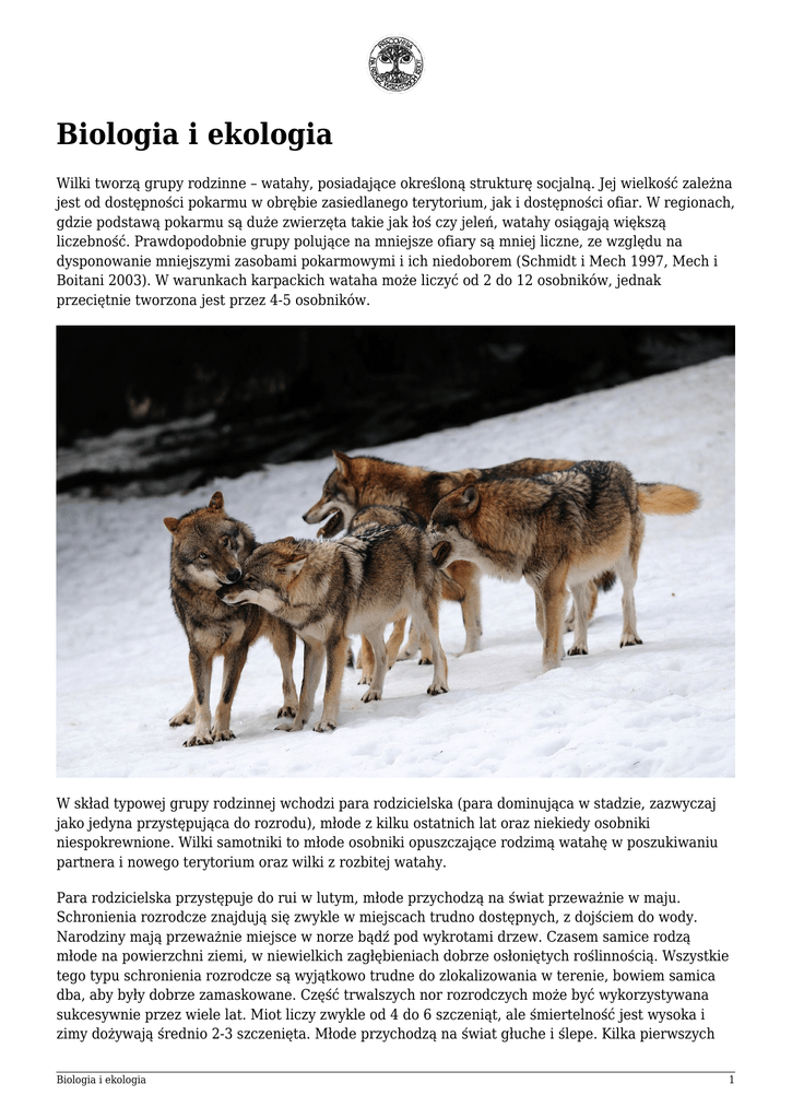 Biologia i ekologia Wilki tworzą grupy rodzinne – watahy, posiadające określoną strukturę socjalną. Jej wielkość zależna jest od dostępności pokarmu w obrębie zasiedlanego terytorium, jak i dostępności ofiar. W regionach, gdzie podstawą pokarmu są duże zwierzęta takie jak łoś czy jeleń, watahy osiągają większą liczebność. Prawdopodobnie grupy polujące na mniejsze ofiary są mniej liczne, ze względu na dysponowanie mniejszymi zasobami pokarmowymi i ich niedoborem (Schmidt i Mech 1997, Mech i Boitani 2003). W warunkach karpackich wataha może liczyć od 2 do 12 osobników, jednak przeciętnie tworzona jest przez 4-5 osobników. W skład typowej grupy rodzinnej wchodzi para rodzicielska (para dominująca w stadzie, zazwyczaj jako jedyna przystępująca do rozrodu), młode z kilku ostatnich lat oraz niekiedy osobniki niespokrewnione. Wilki samotniki to młode osobniki opuszczające rodzimą watahę w poszukiwaniu partnera i nowego terytorium oraz wilki z rozbitej watahy. Para rodzicielska przystępuje do rui w lutym, młode przychodzą na świat przeważnie w maju. Schronienia rozrodcze znajdują się zwykle w miejscach trudno dostępnych, z dojściem do wody. Narodziny mają przeważnie miejsce w norze bądź pod wykrotami drzew. Czasem samice rodzą młode na powierzchni ziemi, w niewielkich zagłębieniach dobrze osłoniętych roślinnością. Wszystkie tego typu schronienia rozrodcze są wyjątkowo trudne do zlokalizowania w terenie, bowiem samica dba, aby były dobrze zamaskowane. Część trwalszych nor rozrodczych może być wykorzystywana sukcesywnie przez wiele lat. Miot liczy zwykle od 4 do 6 szczeniąt, ale śmiertelność jest wysoka i zimy dożywają średnio 2-3 szczenięta. Młode przychodzą na świat głuche i ślepe. Kilka pierwszych Biologia i ekologia 1 tygodni młode spędzają w norze bądź innym schronieniu, pod baczną opieką grupy rodzinnej. Karmione są mlekiem przez matkę, a po kilku tygodniach zwykle przenoszone do innej kryjówki. Młode po opuszczeniu schronienia (zwykle w lipcu bądź sierpniu) poprzez zabawy w sąsiedztwie nory, pod opieką osobników dorosłych, zaczynają proces socjalizacji. Pokarm mleczny zastępowany jest mięsnym, przynoszonym w żołądkach i zwracanym przez członków grupy rodzinnej. Nauka polowania rozpoczyna się dopiero w 7 miesiącu życia. Przemierzają wówczas z resztą stada znaczne odległości i zaczynają z czasem coraz bardziej aktywnie uczestniczyć w polowaniach. Młodociane pozostają z rodziną od 10 do 54 miesięcy (średnio przez okres 22 miesięcy). Głównym czynnikiem warunkującym długość okresu pozostawania młodych w stadzie jest dostępność pokarmu i możliwość wykarmienia większej grupy (Wierzbowska 2010). Po opuszczeniu rodziny migrują w poszukiwaniu własnego terytorium bądź przyłączają się do innej grupy. Zwykle młodociane samce migrują na większe odległości niż samice. Najdłuższa odnotowana odległość pokonana przez osobnika w czasie dyspersji wyniosła ponad 900 km. Zakłada się, że bardziej istotnym czynnikiem warunkującym osiedlanie się migrujących osobników są szanse osiągnięcia sukcesu rozrodczego aniżeli dostępność pokarmu (Mech i Boitani 2003). Biologia i ekologia 2
