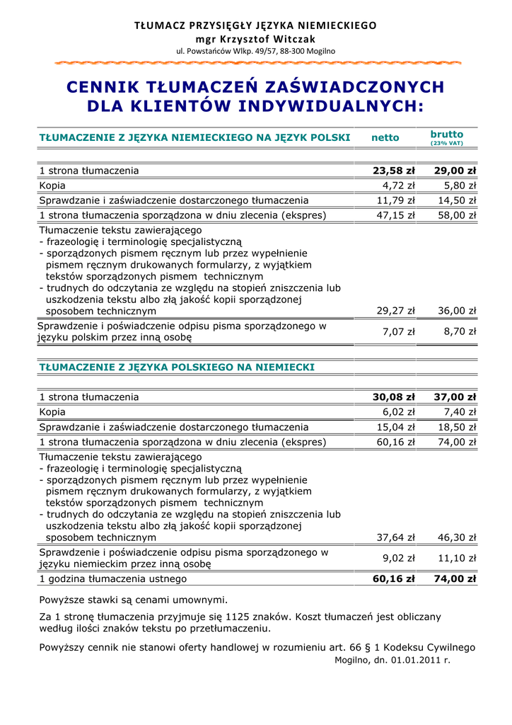 TŁUMACZ PRZYSIĘGŁY JĘZYKA NIEMIECKIEGO mgr Krzysztof Witczak ul. Powstańców Wlkp. 49/57, 88‐300 Mogilno CENNIK TŁUMACZEŃ ZAŚWIADCZONYCH DLA KLIENTÓW INDYWIDUALNYCH: brutto TŁUMACZENIE Z JĘZYKA NIEMIECKIEGO NA JĘZYK POLSKI netto 1 strona tłumaczenia 23,58 zł 29,00 zł 4,72 zł 5,80 zł Sprawdzanie i zaświadczenie dostarczonego tłumaczenia 11,79 zł 14,50 zł 1 strona tłumaczenia sporządzona w dniu zlecenia (ekspres) 47,15 zł 58,00 zł Tłumaczenie tekstu zawierającego - frazeologię i terminologię specjalistyczną - sporządzonych pismem ręcznym lub przez wypełnienie pismem ręcznym drukowanych formularzy, z wyjątkiem tekstów sporządzonych pismem technicznym - trudnych do odczytania ze względu na stopień zniszczenia lub uszkodzenia tekstu albo złą jakość kopii sporządzonej sposobem technicznym 29,27 zł 36,00 zł 7,07 zł 8,70 zł 30,08 zł 37,00 zł 6,02 zł 7,40 zł Sprawdzanie i zaświadczenie dostarczonego tłumaczenia 15,04 zł 18,50 zł 1 strona tłumaczenia sporządzona w dniu zlecenia (ekspres) 60,16 zł 74,00 zł Tłumaczenie tekstu zawierającego - frazeologię i terminologię specjalistyczną - sporządzonych pismem ręcznym lub przez wypełnienie pismem ręcznym drukowanych formularzy, z wyjątkiem tekstów sporządzonych pismem technicznym - trudnych do odczytania ze względu na stopień zniszczenia lub uszkodzenia tekstu albo złą jakość kopii sporządzonej sposobem technicznym 37,64 zł 46,30 zł 9,02 zł 11,10 zł 60,16 zł 74,00 zł Kopia Sprawdzenie i poświadczenie odpisu pisma sporządzonego w języku polskim przez inną osobę (23% VAT) TŁUMACZENIE Z JĘZYKA POLSKIEGO NA NIEMIECKI 1 strona tłumaczenia Kopia Sprawdzenie i poświadczenie odpisu pisma sporządzonego w języku niemieckim przez inną osobę 1 godzina tłumaczenia ustnego Powyższe stawki są cenami umownymi. Za 1 stronę tłumaczenia przyjmuje się 1125 znaków. Koszt tłumaczeń jest obliczany według ilości znaków tekstu po przetłumaczeniu. Powyższy cennik nie stanowi oferty handlowej w rozumieniu art. 66 § 1 Kodeksu Cywilnego Mogilno, dn. 01.01.2011 r. TŁUMACZ PRZYSIĘGŁY JĘZYKA NIEMIECKIEGO mgr Krzysztof Witczak ul. Powstańców Wlkp. 49/57, 88‐300 Mogilno CENNIK TŁUMACZEŃ ZWYKŁYCH DLA KLIENTÓW INDYWIDUALNYCH: brutto TŁUMACZENIE Z JĘZYKA NIEMIECKIEGO NA JĘZYK POLSKI netto 1 strona tłumaczenia 30,08 zł 37,00 zł 1 strona tłumaczenia sporządzona w dniu zlecenia (ekspres) 45,12 zł 55,50 zł Tłumaczenie tekstu zawierającego - frazeologię i terminologię specjalistyczną - sporządzonych pismem ręcznym lub przez wypełnienie pismem ręcznym drukowanych formularzy, z wyjątkiem tekstów sporządzonych pismem technicznym - trudnych do odczytania ze względu na stopień zniszczenia lub uszkodzenia tekstu albo złą jakość kopii sporządzonej sposobem technicznym 37,40 zł 46,00 zł 34,96 zł 43,00 zł 1 strona tłumaczenia sporządzona w dniu zlecenia (ekspres) 52,44 zł 64,50 zł Tłumaczenie tekstu zawierającego - frazeologię i terminologię specjalistyczną - sporządzonych pismem ręcznym lub przez wypełnienie pismem ręcznym drukowanych formularzy, z wyjątkiem tekstów sporządzonych pismem technicznym - trudnych do odczytania ze względu na stopień zniszczenia lub uszkodzenia tekstu albo złą jakość kopii sporządzonej sposobem technicznym 43,74 zł 53,80 zł 60,16 zł 74,00 zł (23% VAT) TŁUMACZENIE Z JĘZYKA POLSKIEGO NA NIEMIECKI 1 strona tłumaczenia 1 godzina tłumaczenia ustnego Powyższe stawki są cenami umownymi. Za 1 stronę tłumaczenia przyjmuje się 1800 znaków. Koszt tłumaczeń jest obliczany według ilości znaków tekstu po przetłumaczeniu. Powyższy cennik nie stanowi oferty handlowej w rozumieniu art. 66 § 1 Kodeksu Cywilnego Mogilno, dn. 01.01.2011 r.