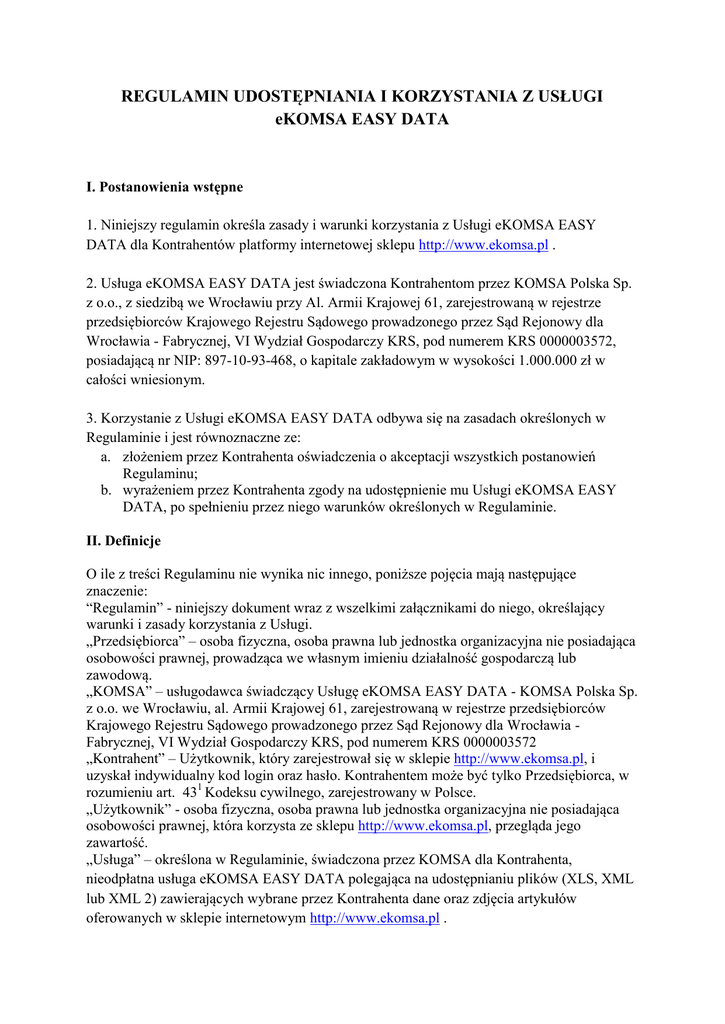 REGULAMIN UDOSTĘPNIANIA I KORZYSTANIA Z USŁUGI eKOMSA EASY DATA I. Postanowienia wstępne 1. Niniejszy regulamin określa zasady i warunki korzystania z Usługi eKOMSA EASY DATA dla Kontrahentów platformy internetowej sklepu http://www.ekomsa.pl . 2. Usługa eKOMSA EASY DATA jest świadczona Kontrahentom przez KOMSA Polska Sp. z o.o., z siedzibą we Wrocławiu przy Al. Armii Krajowej 61, zarejestrowaną w rejestrze przedsiębiorców Krajowego Rejestru Sądowego prowadzonego przez Sąd Rejonowy dla Wrocławia - Fabrycznej, VI Wydział Gospodarczy KRS, pod numerem KRS 0000003572, posiadającą nr NIP: 897-10-93-468, o kapitale zakładowym w wysokości 1.000.000 zł w całości wniesionym. 3. Korzystanie z Usługi eKOMSA EASY DATA odbywa się na zasadach określonych w Regulaminie i jest równoznaczne ze: a. złożeniem przez Kontrahenta oświadczenia o akceptacji wszystkich postanowień Regulaminu; b. wyrażeniem przez Kontrahenta zgody na udostępnienie mu Usługi eKOMSA EASY DATA, po spełnieniu przez niego warunków określonych w Regulaminie. II. Definicje O ile z treści Regulaminu nie wynika nic innego, poniższe pojęcia mają następujące znaczenie: “Regulamin” - niniejszy dokument wraz z wszelkimi załącznikami do niego, określający warunki i zasady korzystania z Usługi. „Przedsiębiorca” – osoba fizyczna, osoba prawna lub jednostka organizacyjna nie posiadająca osobowości prawnej, prowadząca we własnym imieniu działalność gospodarczą lub zawodową. „KOMSA” – usługodawca świadczący Usługę eKOMSA EASY DATA - KOMSA Polska Sp. z o.o. we Wrocławiu, al. Armii Krajowej 61, zarejestrowaną w rejestrze przedsiębiorców Krajowego Rejestru Sądowego prowadzonego przez Sąd Rejonowy dla Wrocławia Fabrycznej, VI Wydział Gospodarczy KRS, pod numerem KRS 0000003572 „Kontrahent” – Użytkownik, który zarejestrował się w sklepie http://www.ekomsa.pl, i uzyskał indywidualny kod login oraz hasło. Kontrahentem może być tylko Przedsiębiorca, w rozumieniu art. 431 Kodeksu cywilnego, zarejestrowany w Polsce. „Użytkownik” - osoba fizyczna, osoba prawna lub jednostka organizacyjna nie posiadająca osobowości prawnej, która korzysta ze sklepu http://www.ekomsa.pl, przegląda jego zawartość. „Usługa” – określona w Regulaminie, świadczona przez KOMSA dla Kontrahenta, nieodpłatna usługa eKOMSA EASY DATA polegająca na udostępnianiu plików (XLS, XML lub XML 2) zawierających wybrane przez Kontrahenta dane oraz zdjęcia artykułów oferowanych w sklepie internetowym http://www.ekomsa.pl . „Check Lista” – lista, w której Kontrahent określa jaki plik i w jakim formacie chce pobierać w ramach Usługi. III. Ogólne zasady korzystania z Usługi 1. Do korzystania z Usługi niezbędny jest dostęp do Internetu oraz przeglądarka internetowa akceptująca pliki typu cookie: a/ Internet Explorer w wersji nie starszej niż IE 6, b/ Mozilla Firefox w wersji nie starszej niż 2.0, c/ Google Chrome w wersji nie starszej niż 2.0, d/ Opera w wersji nie starszej niż 8.0 2. Warunkiem korzystania z Usługi jest akceptacja przez Kontrahenta Regulaminu Easy Data dostępnego na stronie www.ekomsa.pl zakładka Pomoc Warunki korzystania z Usługi Easy Data Regulamin Easy Data. Treść Regulaminu może być w każdej chwili nieodpłatnie pozyskana, odtworzona i utrwalona przez Kontrahenta 3.Warunkiem skorzystania z Usługi jest zalogowanie się w systemie sklepu http://www.ekomsa.pl/. W przypadku, kiedy Kontrahent jeszcze nie ma dostępu do platformy ekomsa.pl, może wystąpić do Komsa z wnioskiem o udzielenie dostępu zgodnie z regulaminem internetowego portalu ekomsa.pl. 4.Usługa zostaje uruchomiona w terminie 7 (siedem) dni od dnia otrzymania przez KOMSA podpisanego zamówienia Usługi wraz z prawidłowo wypełnioną Check Listą. 5. Włączona Usługa jest nieodpłatna pod warunkiem realizacji z KOMSA co najmniej jednej transakcji na dowolną kwotę. 6.Kontrahent, który w ciągu 2 miesięcy od dnia włączenia Usługi nie zrealizował z KOMSA co najmniej jednej transakcji na dowolną kwotę traci prawo do korzystania z Usługi, którą KOMSA ma prawo wyłączyć bez konieczności uprzedniego poinformowania Kontrahenta. 7. Zawarcie umowy o świadczenie Usługi następuje z chwilą uruchomienia Usługi przez KOMSA na podstawie przesłanego przez Kontrahenta pocztą (kurierem) bądź email podpisanego zamówienia Usługi wraz z prawidłowo wypełnioną Check Listą. 8. Umowa zostaje zawarta na czas nieokreślony i może zostać wypowiedziana w każdym czasie. Wypowiedzenie może zostać dokonane poprzez przesłanie stosownego oświadczenia do KOMSA drogą mailową na adres : [email protected] 9. KOMSA może wypowiedzieć umowę ze skutkiem natychmiastowym w szczególności, gdy: - Kontrahent nie wypracuje dowolnego obrotu w danym miesiącu, - naruszenia przez Kontrahenta postanowień Regulaminu; - w odniesieniu do Kontrahenta zostanie wszczęte postępowanie upadłościowe lub sądowe postępowanie układowe (naprawcze) lub otwarcie takiego postępowania nie będzie możliwe z powodu braku majątku; - w przypadku, gdy Kontrahent podejmie konkurencyjną w stosunku do KOMSA działalność w tej samej branży 10. Wyłączenie Usługi jest równoznaczne z wypowiedzeniem umowy o świadczenie Usługi i zostanie potwierdzone przez KOMSA na piśmie w terminie 7 dni od chwili wyłączenia. 11. Z chwilą rozwiązania umowy Kontrahent traci prawo do wykorzystywania w kontaktach z osobami trzecimi danych oraz zdjęć artykułów uzyskanych w ramach Usługi. IV. Prawa i obowiązki 1. KOMSA zobowiązuje się zapewnić dostępność danych i zdjęć zamówionych przez Kontrahenta w oparciu o Check Listę. Dane będą udostępnione Kontrahentowi po zalogowaniu się na platformie internetowej sklepu http://www.ekomsa.pl/. 2. Dane i zdjęcia artykułów udostępnione przez KOMSA w ramach Usługi mogą być wykorzystywane przez Kontrahenta wyłącznie do działaln