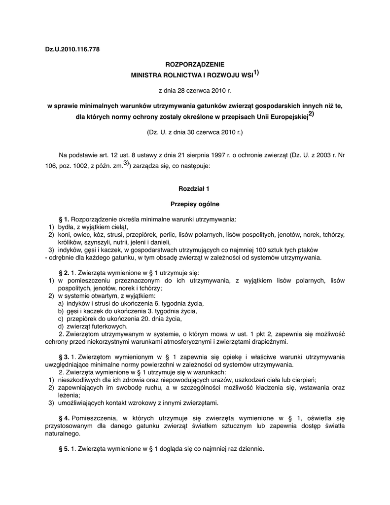Dz.U.2010.116.778 ROZPORZĄDZENIE MINISTRA ROLNICTWA I ROZWOJU WSI1) z dnia 28 czerwca 2010 r. w sprawie minimalnych warunków utrzymywania gatunków zwierząt gospodarskich innych niż te, dla których normy ochrony zostały określone w przepisach Unii Europejskiej2) (Dz. U. z dnia 30 czerwca 2010 r.) Na podstawie art. 12 ust. 8 ustawy z dnia 21 sierpnia 1997 r. o ochronie zwierząt (Dz. U. z 2003 r. Nr 106, poz. 1002, z późn. zm.3)) zarządza się, co następuje: Rozdział 1 Przepisy ogólne § 1. Rozporządzenie określa minimalne warunki utrzymywania: 1) bydła, z wyjątkiem cieląt, 2) koni, owiec, kóz, strusi, przepiórek, perlic, lisów polarnych, lisów pospolitych, jenotów, norek, tchórzy, królików, szynszyli, nutrii, jeleni i danieli, 3) indyków, gęsi i kaczek, w gospodarstwach utrzymujących co najmniej 100 sztuk tych ptaków - odrębnie dla każdego gatunku, w tym obsadę zwierząt w zależności od systemów utrzymywania. § 2. 1. Zwierzęta wymienione w § 1 utrzymuje się: 1) w pomieszczeniu przeznaczonym do ich utrzymywania, z wyjątkiem lisów polarnych, lisów pospolitych, jenotów, norek i tchórzy; 2) w systemie otwartym, z wyjątkiem: a) indyków i strusi do ukończenia 6. tygodnia życia, b) gęsi i kaczek do ukończenia 3. tygodnia życia, c) przepiórek do ukończenia 20. dnia życia, d) zwierząt futerkowych. 2. Zwierzętom utrzymywanym w systemie, o którym mowa w ust. 1 pkt 2, zapewnia się możliwość ochrony przed niekorzystnymi warunkami atmosferycznymi i zwierzętami drapieżnymi. § 3. 1. Zwierzętom wymienionym w § 1 zapewnia się opiekę i właściwe warunki utrzymywania uwzględniające minimalne normy powierzchni w zależności od systemów utrzymywania. 2. Zwierzęta wymienione w § 1 utrzymuje się w warunkach: 1) nieszkodliwych dla ich zdrowia oraz niepowodujących urazów, uszkodzeń ciała lub cierpień; 2) zapewniających im swobodę ruchu, a w szczególności możliwość kładzenia się, wstawania oraz leżenia; 3) umożliwiających kontakt wzrokowy z innymi zwierzętami. § 4. Pomieszczenia, w których utrzymuje się zwierzęta wymienione w § 1, oświetla się przystosowanym dla danego gatunku zwierząt światłem sztucznym lub zapewnia dostęp światła naturalnego. § 5. 1. Zwierzęta wymienione w § 1 dogląda się co najmniej raz dziennie. 2. W celu umożliwienia kontroli pomieszczeń, w których utrzymuje się zwierzęta wymienione w § 1, i doglądania umieszczonych w nich zwierząt o każdej porze pomieszczenia te wyposaża się w stałe lub przenośne oświetlenie sztuczne. § 6. 1. Pomieszczenia, w których utrzymuje się zwierzęta wymienione w § 1, ich wyposażenie oraz sprzęt używany przy utrzymywaniu tych zwierząt: 1) wykonuje się z materiałów nieszkodliwych dla zdrowia zwierząt oraz nadających się do czyszczenia i odkażania; 2) czyści się i odkaża. 2. Odchody zwierząt wymienionych w § 1 oraz niezjedzone resztki paszy usuwa się z pomieszczeń, w których utrzymuje się te zwierzęta, tak często, aby uniknąć wydzielania się nieprzyjemnych woni i zanieczyszczenia paszy lub wody. Pomieszczenia te zabezpiecza się przed muchami i gryzoniami. 3. Wyposażenie i sprzęt przeznaczone do karmienia i pojenia zwierząt wymienionych w § 1 umieszcza się w taki sposób, aby zminimalizować ryzyko zanieczyszczenia paszy lub wody oraz ułatwić bezkonfliktowy dostęp tych zwierząt do paszy i wody. 4. Wyposażenie i sprzęt, o którym mowa w ust. 1: 1) powinny być tak skonstruowane, umieszczone, obsługiwane i utrzymywane, aby nie powodowały nadmiernego hałasu; 2) sprawdza się co najmniej raz dziennie, a wykryte usterki niezwłocznie usuwa. 5. Podłoga w pomieszczeniach, w których utrzymuje się zwierzęta wymienione w § 1, powinna być twarda, równa i stabilna, a jej powierzchnia gładka i nieśliska. § 7. 1. W pomieszczeniach, w których utrzymuje się zwierzęta wymienione w § 1, obieg powietrza, stopień zapylenia, temperaturę, względną wilgotność powietrza i stężenie gazów utrzymuje się na poziomie nieszkodliwym dla zwierząt. 2. W przypadku wyposażenia pomieszczeń, w których utrzymuje się zwierzęta wymienione w § 1, w mechaniczny lub automatyczny system wentylacji system ten łączy się z: 1) systemem alarmowym sygnalizującym awarię systemu wentylacyjnego; 2) systemem wentylacji awaryjnej. § 8. 1. Bydłu, owcom, kozom, indykom, gęsiom, kaczkom, strusiom, przepiórkom, perlicom, lisom polarnym, lisom pospolitym, jenotom, norkom, tchórzom, królikom, szynszylom, nutriom, jeleniom i danielom zapewnia się stały dostęp do wody. 2. Konie poi się wodą co najmniej trzy razy dziennie. 3. Urządzenia do pojenia instaluje się w sposób zabezpieczający wodę przed wylewaniem się. § 9. 1. Bydło, konie, owce, kozy, króliki, szynszyle, nutrie karmi się co najmniej dwa razy dziennie paszą dostosowaną do ich gatunku, wieku, masy ciała i stanu fizjologicznego. 2. Jelenie, daniele, indyki, gęsi, kaczki, strusie, przepiórki, perlice, lisy polarne, lisy pospolite, jenoty, norki i tchórze karmi się co najmniej raz dziennie paszą dostosowaną do ich gatunku, wieku, masy ciała i stanu fizjologicznego. § 10. 1. Chore lub ranne zwierzęta wymienione w § 1 niezwłocznie otacza się opieką, a w razie potrzeby izoluje. 2. Jeżeli wymaga tego stan zdrowia chorego lub rannego zwierzęcia wymienionego w § 1, zwierzę to utrzymuje się na ściółce. Rozdział 2 Minimalne warunki utrzymywania bydła § 11. 1. Bydło, z wyjątkiem cieląt, utrzymywane w systemie, o którym mowa w § 2 ust. 1 pkt 1, utrzymuje się: 1) na uwięzi; 2) bez uwięzi wolnostanowiskowo: a) z wydzielonymi legowiskami, z wyjątkiem bydła opasowego i buhajów, b) bez wydzielonych legowisk na ściółce, c) bez wydzielonych legowisk i ściółki, z wyjątkiem buhajów, krów i jałówek cielnych powyżej 7. miesiąca ciąży. 2. W systemie utrzymywania bydła, o którym mowa w ust. 1 pkt 1, wymiary stanowiska po