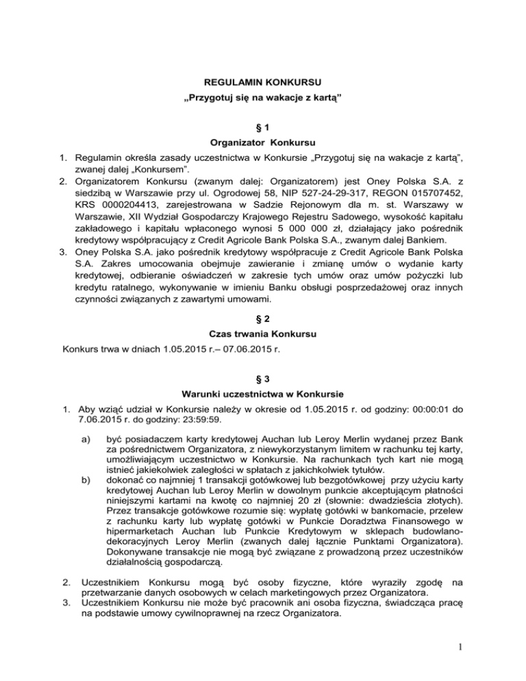 REGULAMIN KONKURSU „Przygotuj się na wakacje z kartą” §1 Organizator Konkursu 1. Regulamin określa zasady uczestnictwa w Konkursie „Przygotuj się na wakacje z kartą”, zwanej dalej „Konkursem”. 2. Organizatorem Konkursu (zwanym dalej: Organizatorem) jest Oney Polska S.A. z siedzibą w Warszawie przy ul. Ogrodowej 58, NIP 527-24-29-317, REGON 015707452, KRS 0000204413, zarejestrowana w Sadzie Rejonowym dla m. st. Warszawy w Warszawie, XII Wydział Gospodarczy Krajowego Rejestru Sadowego, wysokość kapitału zakładowego i kapitału wpłaconego wynosi 5 000 000 zł, działający jako pośrednik kredytowy współpracujący z Credit Agricole Bank Polska S.A., zwanym dalej Bankiem. 3. Oney Polska S.A. jako pośrednik kredytowy współpracuje z Credit Agricole Bank Polska S.A. Zakres umocowania obejmuje zawieranie i zmianę umów o wydanie karty kredytowej, odbieranie oświadczeń w zakresie tych umów oraz umów pożyczki lub kredytu ratalnego, wykonywanie w imieniu Banku obsługi posprzedażowej oraz innych czynności związanych z zawartymi umowami. §2 Czas trwania Konkursu Konkurs trwa w dniach 1.05.2015 r.– 07.06.2015 r. §3 Warunki uczestnictwa w Konkursie 1. Aby wziąć udział w Konkursie należy w okresie od 1.05.2015 r. od godziny: 00:00:01 do 7.06.2015 r. do godziny: 23:59:59. a) b) 2. 3. być posiadaczem karty kredytowej Auchan lub Leroy Merlin wydanej przez Bank za pośrednictwem Organizatora, z niewykorzystanym limitem w rachunku tej karty, umożliwiającym uczestnictwo w Konkursie. Na rachunkach tych kart nie mogą istnieć jakiekolwiek zaległości w spłatach z jakichkolwiek tytułów. dokonać co najmniej 1 transakcji gotówkowej lub bezgotówkowej przy użyciu karty kredytowej Auchan lub Leroy Merlin w dowolnym punkcie akceptującym płatności niniejszymi kartami na kwotę co najmniej 20 zł (słownie: dwadzieścia złotych). Przez transakcje gotówkowe rozumie się: wypłatę gotówki w bankomacie, przelew z rachunku karty lub wypłatę gotówki w Punkcie Doradztwa Finansowego w hipermarketach Auchan lub Punkcie Kredytowym w sklepach budowlanodekoracyjnych Leroy Merlin (zwanych dalej łącznie Punktami Organizatora). Dokonywane transakcje nie mogą być związane z prowadzoną przez uczestników działalnością gospodarczą. Uczestnikiem Konkursu mogą być osoby fizyczne, które wyraziły zgodę na przetwarzanie danych osobowych w celach marketingowych przez Organizatora. Uczestnikiem Konkursu nie może być pracownik ani osoba fizyczna, świadcząca pracę na podstawie umowy cywilnoprawnej na rzecz Organizatora. 1 4. 5. 6. 7. 8. Wszystkie transakcje dokonane w jednym dniu, jedną kartą w tym samym punkcie akceptującym płatności kartą kredytową Auchan lub Leroy Merlin, traktowane są jako jedna transakcja, niezależnie od ich liczby i wysokości. Z Konkursu wyłączone są transakcje, w których dokonano zwrotu towaru lub usługi, które zostały odrzucone, zwrócone lub transakcje nieautoryzowane. Przez transakcje zwrócone należy rozumieć również takie transakcje, co do których Uczestnik Konkursu dokonał płatności za zakup towarów lub usług przy użyciu karty kredytowej Auchan lub Leroy Merlin, a następnie otrzymał zwrot chociażby części kwoty transakcji, na rachunek tej karty lub w gotówce. Z Konkursu wyłączone są transakcje bezgotówkowe w punktach prowadzących działalność sklasyfikowaną, jako zakłady bukmacherskie, kasyna (kod MCC 7995). Liczba płatności dokonanych przez Uczestników posiadających kartę kredytową Leroy Merlin i kartę kredytową Auchan nie podlega sumowaniu (dla jednego Uczestnika liczba transakcji dokonanych przy użyciu obu kart będzie sumowana oddzielnie). Transakcje dokonane kartą dodatkową, traktowane są, jak transakcje dokonane kartą główną (dotyczy kart, o których mowa w § 3 ust 1 pkt a). §4 Nagrody 1. Zwycięzcami Konkursu jest 1000 (słownie: tysiąc) Uczestników, którzy dokonają największej liczby transakcji kartą kredytową zgodnie z warunkami opisanymi w § 3 Regulaminu i w terminie określonym w § 2 Regulaminu. Nagrody, w zależności od liczby dokonanych transakcji, będą przyznawane kolejno 1000 (słownie: tysiącu) Uczestnikom. 2. Dwóch Uczestników, którzy w czasie trwania Konkursu dokonają największej liczby transakcji w terminie określonym w § 2 Regulaminu i na warunkach określonych w § 3 Regulaminu otrzyma od Organizatora voucher wycieczkowy o wartości 2000 zł każdy do zrealizowania w portalu www.wakacje.pl, wraz z dodatkową nagrodą pieniężną w wysokości 222 zł z zastrzeżeniem ust. 13 3. Pięciu kolejnych Uczestników, którzy dokonają największej liczby transakcji w terminie określonym w § 2 Regulaminu i na warunkach określonych w § 3 Regulaminu otrzyma od Organizatora rower o wartości 1000 zł, wraz z dodatkową nagrodą pieniężną w wysokości 111 zł z zastrzeżeniem ust. 13 4. 200 kolejnych Uczestników, którzy dokonają największej liczby transakcji w terminie określonym w § 2 Regulaminu i na warunkach określonych w § 3 Regulaminu otrzyma od Organizatora zestaw piknikowy dla dwóch osób o wartości 43 zł, 5. 300 kolejnych Uczestników, którzy dokonają największej liczby transakcji w terminie określonym w § 2 Regulaminu i na warunkach określonych w § 3 Regulaminu otrzyma od Organizatora kosze zakupowe o wartości 24,75 zł, 6. 493 kolejnych Uczestników, którzy dokonają największej liczby transakcji w terminie określonym w § 2 Regulaminu i na warunkach określonych w § 3 Regulaminu otrzyma od Organizatora termosy o wartości 22,20 zł, 7. W przypadku, gdy dwóch lub więcej Uczestników dokona takiej samej liczby transakcji kartą, nagrody będą przyznawane kolejno Uczestnikom, których łączne sumy kwot transakcji dokonanych kartą w terminie określonym w § 2 Regulaminu i na warunkach określonych w § 3 Regulaminu będą wyższe. 8. Zwycięzcy nagród, o których mowa w § 4 pkt. 2 i 3 zostaną po