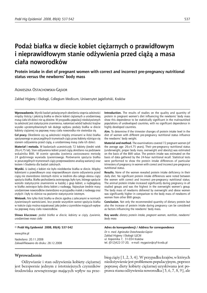 Probl Ostachowska-Gąsior Hig Epidemiol A. 2008, Podaż 89(4): białka 537-542 w diecie kobiet ciężarnych o prawidłowym i nieprawidłowym stanie odżywienia ... 537 Podaż białka w diecie kobiet ciężarnych o prawidłowym i nieprawidłowym stanie odżywienia przed ciążą a masa ciała noworodków Protein intake in diet of pregnant women with correct and incorrect pre-pregnancy nutritional status versus the newborns’ body mass AGNIESZKA OSTACHOWSKA-GĄSIOR Zakład Higieny i Ekologii, Collegium Medicum, Uniwersytet Jagielloński, Kraków Wprowadzenie. Wyniki badań poświęconych określeniu stopnia zależności między ilością i jakością białka w diecie kobiet ciężarnych a urodzeniową masą ciała ich dzieci nie są zbieżne. W przypadku populacji niedożywionych ta zależność jest statystycznie znamienna, natomiast wśród ludności krajów wysoko uprzemysłowionych tak dużego wpływu podaży białka w diecie kobiety ciężarnej na poprawę masy ciała noworodka nie stwierdza się. Cel pracy. Określenie czy są zależności między zmianami w ilości białka spożywanego w poszczególnych trymetrach ciąży przez kobiety różniące się stanem odżywienia przed ciążą, a urodzeniową masą ciała ich dzieci. Materiał i metoda. W badaniach uczestniczyły 72 kobiety (średni wiek 26±4,75 lat). Stan odżywienia kobiet przed ciążą określano na podstawie wskaźnika BMI. W ocenie sposobu żywienia zastosowano metodę 24 godzinnego wywiadu żywieniowego. Porównanie spożycia białka w poszczególnych trymestrach ciąży przeprowadzono analizą wariancji oraz testem t-Studenta dla badań zależnych. Wyniki. U żadnej z kobiet nie było niedoborów białka w diecie. Między kobietami o prawidłowym oraz nieprawidłowym stanie odżywienia przed ciążą nie stwierdzono istotnych różnic w średnim dla całego okresu ciąży spożyciu białka. Białko pochodzenia zwierzęcego, było tym, którego spożycie wzrosło statystycznie znamiennie w każdej z grup kobiet, a najbogatszą w białko zwierzęce była dieta kobiet z nadwagą. Najwyższe średnie masy urodzeniowe noworodków stwierdzono w przypadku matek z nadwagą oraz otyłych i były to różnice na poziomie statystycznie istotnym. Wniosek. Nie tylko ilość białka w diecie zgodna z zalecanymi w normach żywieniowych wartościami, lecz przede wszystkim wzrost spożycia białka w trakcie ciąży można rozpatrywać jako jeden z czynników mających wpływ na poprawę masy ciała noworodków. Introduction. The results of studies on the quality and quantity of protein in pregnant women’s diet influencing the newborns’ body mass show this dependence to be statistically significant in the malnourished populations of undeveloped countries, with no significant dependence in highly developed countries. Aim. To determine if the trimester changes of protein intake level in the diet of women with different pre-pregnancy nutritional status influence the newborns’ body weight. Material and method. The examinations covered 72 pregnant women (of the average age: 26±4.75 years). Their pre-pregnancy nutritional status (underweight, proper body mass, overweight and obesity) was estimated on the basis of the BMI value. The protein intake was estimated on the basis of data gathered by the 24-hour nutritional recall. Statistical tests were performed to show the protein intake differences of particular trimesters of pregnancy in women with correct and incorrect pre-pregnancy nutritional status. Results. None of the women revealed protein intake deficiency in their daily diet. No significant protein intake differences were noted between the women with correct and incorrect pre-pregnancy nutritional status. The animal protein intake increased significantly during pregnancy in all studied groups and was the highest in the overweight women’s group. The body mass of newborns delivered by overweight and obese women was significantly higher in comparison to the body mass of newborns of women from other BMI groups. Conclusion. Not only the recommended quantity of dietary protein but also the increase of protein intake during pregnancy can be considered as factors influencing the newborns’ body mass. Słowa kluczowe: podaż białka w diecie, kobiety w ciąży, żywienie, urodzeniowa masa ciała Key words: dietary protein intake, pregnant women, nutrition, newborns’ body mass © Probl Hig Epidemiol 2008, 89(4): 537-542 Adres do korespondencji / Address for correspondence www.phie.pl Nadesłano: 20.11.2008 Zakwalifikowano do druku: 28.12.2008 Wprowadzenie Odżywianie i stan odżywienia kobiety ciężarnej jest bezspornie jednym z istotniejszych czynników środowiska zewnętrznego mających wpływ na prze- Dr n. med. Agnieszka Ostachowska-Gąsior Zakład Higieny i Ekologii UJCM ul. Kopernika 7, 31-034 Kraków tel. (012)422-37-20, e-mail: [email protected] bieg ciąży [1, 2, 3, 4]. W przypadku krajów, w których niedożywienie jest problemem populacyjnym, poprzez poprawę diety kobiety ciężarnej uzyskiwana jest poprawa stanu odżywienia noworodka [5, 6, 7, 8, 9], ale 538 w odniesieniu do krajów wysokorozwiniętych wpływ odżywiania kobiety ciężarnej na masę urodzeniową jej potomstwa nie zawsze jest statystycznie znamienny. Niektóre z badań sugerują brak związku między zawartością składników odżywczych w diecie kobiet ciężarnych, a parametrami antropometrycznymi noworodków [10, 11]. Inne z kolei wskazują, że nie tylko przyrost masy ciała kobiety w trakcie ciąży, ale również urodzeniowa masa ciała noworodków są zależne od sposobu żywienia kobiety ciężarnej, a w szczególności od tego jak odżywia się w pierwszej połowie ciąży [10, 12, 13], a nawet od tego jak odżywia się w okresie okołokoncepcyjnym [14]. Czynnikiem, który ma wpływ na masę urodzeniową noworodka bez względu na rejon świata jest stan odżywienia kobiety przed ciążą, gdyż niedożywienie matki sprzyja niedożywieniu 