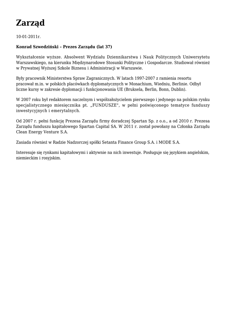 Zarząd 10-01-2011r. Konrad Szwedziński – Prezes Zarządu (lat 37) Wykształcenie wyższe. Absolwent Wydziału Dziennikarstwa i Nauk Politycznych Uniwersytetu Warszawskiego, na kierunku Międzynarodowe Stosunki Polityczne i Gospodarcze. Studiował również w Prywatnej Wyższej Szkole Biznesu i Administracji w Warszawie. Były pracownik Ministerstwa Spraw Zagranicznych. W latach 1997-2007 z ramienia resortu pracował m.in. w polskich placówkach dyplomatycznych w Monachium, Wiedniu, Berlinie. Odbył liczne kursy w zakresie dyplomacji i funkcjonowania UE (Bruksela, Berlin, Bonn, Dublin). W 2007 roku był redaktorem naczelnym i współzałożycielem pierwszego i jedynego na polskim rynku specjalistycznego miesięcznika pt. „FUNDUSZE", w pełni poświęconego tematyce funduszy inwestycyjnych i emerytalnych. Od 2007 r. pełni funkcję Prezesa Zarządu firmy doradczej Spartan Sp. z o.o., a od 2010 r. Prezesa Zarządu funduszu kapitałowego Spartan Capital SA. W 2011 r. został powołany na Członka Zarządu Clean Energy Venture S.A. Zasiada również w Radzie Nadzorczej spółki Setanta Finance Group S.A. i MODE S.A. Interesuje się rynkami kapitałowymi i aktywnie na nich inwestuje. Posługuje się językiem angielskim, niemieckim i rosyjskim.