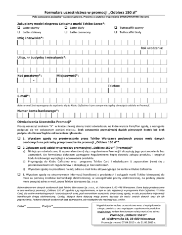 Formularz uczestnictwa w promocji „Odbierz 150 zł" Pola oznaczone gwiazdką* są obowiązkowe. Prosimy o czytelne wypełnianie DRUKOWANYMI literami. Zakupiony model ekspresu Cafissimo marki Tchibo Saeco*: Latte czarny Latte stalowy Latte biały Latte czerwony Tuttocaffè czarny Tuttocaffè biały Imię i nazwisko*: Rok urodzenia: Ulica, nr budynku i mieszkania*: Kod pocztowy*: Miejscowość*: ̶ Telefon: E-mail*: Adres e-mail jest wymagany do zapisania się do Klubu Cafissimo i tym samym niezbędny do wzięcia udziału w Promocji. Numer konta bankowego*: Oświadczenia Uczestnika Promocji* Proszę oznaczyć znakiem "X" w kratce z lewej strony treści oświadczeń, na które wyraża Pani/Pan zgodę, a następnie podpisać się we wskazanym poniżej miejscu. Brak oznaczenia przynajmniej dwóch pierwszych kratek lub brak podpisu skutkować będzie odrzuceniem zgłoszenia. 1. Wyrażam zgodę na przetwarzanie przez Tchibo Warszawa podanych przeze mnie danych osobowych na potrzeby przeprowadzenia promocji „Odbierz 150 zł”*. 2. Zgłaszam swój udział w sprzedaży promocyjnej „Odbierz 150 zł” (Promocja)* a) Niniejszym oświadczam, iż zapoznałam (-em) się z regulaminem Promocji i akceptuję jego postanowienia bez zastrzeżeń. Do formularza dołączam wymagane Regulaminem: kopię dowodu zakupu produktu i oryginał kodu kreskowego wyciętego z opakowania produktu. b) Przystępuję do Klubu Cafissimo oraz programu Tchibo Card i oświadczam iż zapoznałam (-em) się z postanowieniami ich regulaminów i akceptuję je bez zastrzeżeń. c) Wyrażam zgodę na przesłanie na mój adres e-mail linku aktywacyjnego do konta w Klubie Cafissimo. 3. Wyrażam zgodę na otrzymywanie informacji handlowej o produktach i usługach marki Tchibo kierowanej do mnie za pomocą środków komunikacji elektronicznej, w szczególności poczty elektronicznej, na podany przeze mnie powyżej adres e-mail, przez Tchibo Warszawa Sp. z o.o. Administratorem danych osobowych jest Tchibo Warszawa Sp. z o.o., ul. Fabryczna 5, 00-446 Warszawa. Dane będą przetwarzane w celu realizacji promocji „Odbierz 150 zł” zgodnie z jej regulaminem, w tym w celu rejestracji w programie Klub Cafissimo i Tchibo Card, dla celów marketingowych i statystycznych oraz, pod warunkiem wyrażenia dodatkowej zgody, w celu przesyłania informacji handlowych drogą elektroniczną. Osoby, których dane dotyczą mają prawo dostępu do treści swoich danych oraz do ich poprawiania. Podanie danych osobowych jest dobrowolne, ale niezbędne do realizacji ww. celów. Data* ________ Podpis* _____________________ Wypełniony formularz uczestnictwa wraz z kopią dowodu zakupu produktu oraz wyciętym z opakowania produktu oryginalnym kodem kreskowym należy wysłać na adres: str. 1 Promocja „Odbierz 150 zł" ul. Wolbromska 38, 03-680 Warszawa Promocja trwa od 07.04.2015 r. do 21.06.2015 r.