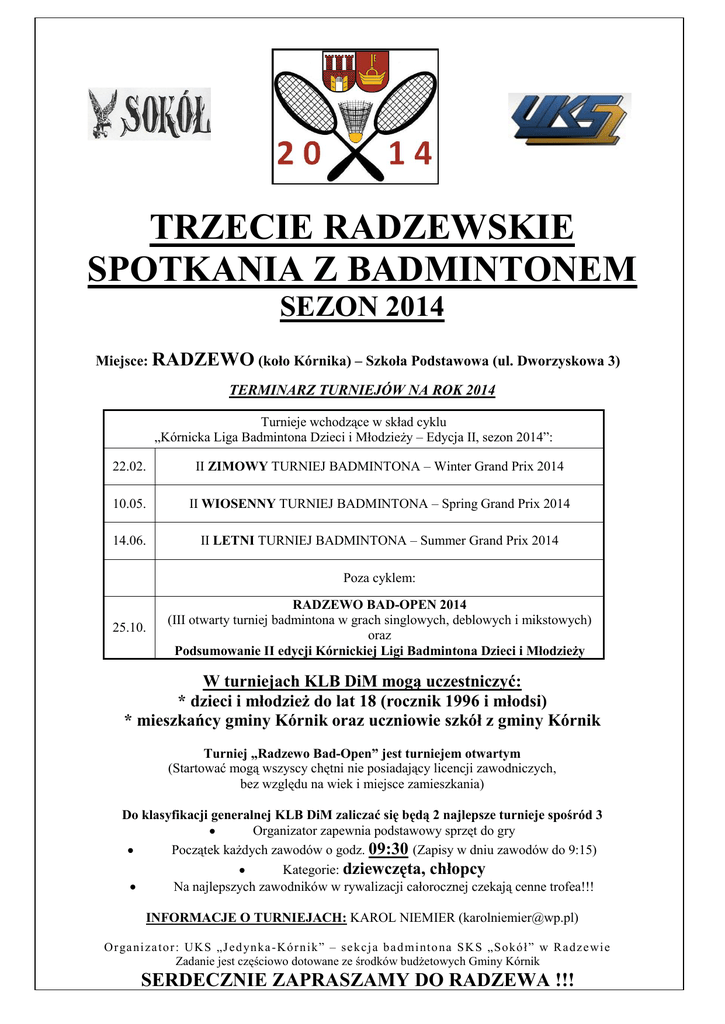 TRZECIE RADZEWSKIE SPOTKANIA Z BADMINTONEM SEZON 2014 Miejsce: RADZEWO (koło Kórnika) – Szkoła Podstawowa (ul. Dworzyskowa 3) TERMINARZ TURNIEJÓW NA ROK 2014 Turnieje wchodzące w skład cyklu „Kórnicka Liga Badmintona Dzieci i Młodzieży – Edycja II, sezon 2014”: 22.02. II ZIMOWY TURNIEJ BADMINTONA – Winter Grand Prix 2014 10.05. II WIOSENNY TURNIEJ BADMINTONA – Spring Grand Prix 2014 14.06. II LETNI TURNIEJ BADMINTONA – Summer Grand Prix 2014 Poza cyklem: 25.10. RADZEWO BAD-OPEN 2014 (III otwarty turniej badmintona w grach singlowych, deblowych i mikstowych) oraz Podsumowanie II edycji Kórnickiej Ligi Badmintona Dzieci i Młodzieży W turniejach KLB DiM mogą uczestniczyć: * dzieci i młodzież do lat 18 (rocznik 1996 i młodsi) * mieszkańcy gminy Kórnik oraz uczniowie szkół z gminy Kórnik Turniej „Radzewo Bad-Open” jest turniejem otwartym (Startować mogą wszyscy chętni nie posiadający licencji zawodniczych, bez względu na wiek i miejsce zamieszkania) Do klasyfikacji generalnej KLB DiM zaliczać się będą 2 najlepsze turnieje spośród 3 Organizator zapewnia podstawowy sprzęt do gry Początek każdych zawodów o godz. 09:30 (Zapisy w dniu zawodów do 9:15) Kategorie: dziewczęta, chłopcy Na najlepszych zawodników w rywalizacji całorocznej czekają cenne trofea!!! INFORMACJE O TURNIEJACH: KAROL NIEMIER ([email protected]) Or ga ni za to r : UK S „J ed y n ka - Kó r n i k” – se k cj a b a d mi nto na S K S „So kó ł ” w R ad z e wi e Zadanie jest częściowo dotowane ze środków budżetowych Gminy Kórnik SERDECZNIE ZAPRASZAMY DO RADZEWA !!!