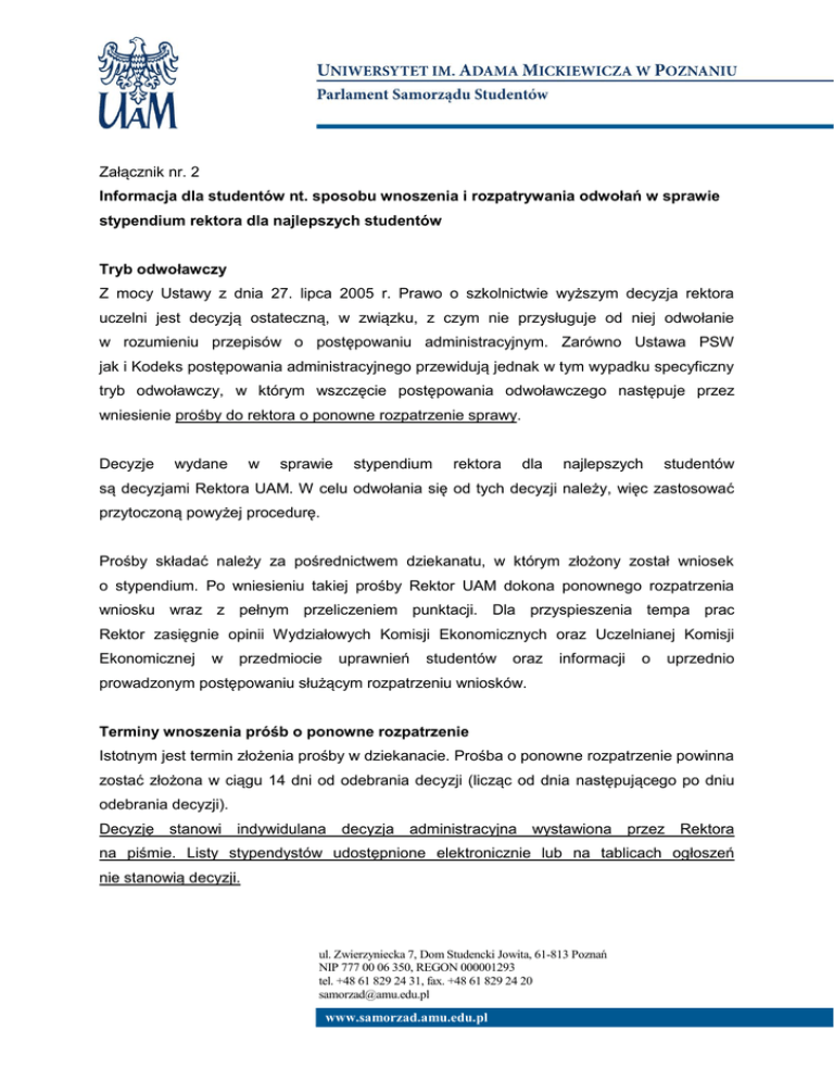 Załącznik nr. 2 Informacja dla studentów nt. sposobu wnoszenia i rozpatrywania odwołań w sprawie stypendium rektora dla najlepszych studentów Tryb odwoławczy Z mocy Ustawy z dnia 27. lipca 2005 r. Prawo o szkolnictwie wyższym decyzja rektora uczelni jest decyzją ostateczną, w związku, z czym nie przysługuje od niej odwołanie w rozumieniu przepisów o postępowaniu administracyjnym. Zarówno Ustawa PSW jak i Kodeks postępowania administracyjnego przewidują jednak w tym wypadku specyficzny tryb odwoławczy, w którym wszczęcie postępowania odwoławczego następuje przez wniesienie prośby do rektora o ponowne rozpatrzenie sprawy. Decyzje wydane w sprawie stypendium rektora dla najlepszych studentów są decyzjami Rektora UAM. W celu odwołania się od tych decyzji należy, więc zastosować przytoczoną powyżej procedurę. Prośby składać należy za pośrednictwem dziekanatu, w którym złożony został wniosek o stypendium. Po wniesieniu takiej prośby Rektor UAM dokona ponownego rozpatrzenia wniosku wraz z pełnym przeliczeniem punktacji. Dla przyspieszenia tempa prac Rektor zasięgnie opinii Wydziałowych Komisji Ekonomicznych oraz Uczelnianej Komisji Ekonomicznej w przedmiocie uprawnień studentów oraz informacji o uprzednio prowadzonym postępowaniu służącym rozpatrzeniu wniosków. Terminy wnoszenia próśb o ponowne rozpatrzenie Istotnym jest termin złożenia prośby w dziekanacie. Prośba o ponowne rozpatrzenie powinna zostać złożona w ciągu 14 dni od odebrania decyzji (licząc od dnia następującego po dniu odebrania decyzji). Decyzję stanowi indywidulana decyzja administracyjna wystawiona przez Rektora na piśmie. Listy stypendystów udostępnione elektronicznie lub na tablicach ogłoszeń nie stanowią decyzji. ul. Zwierzyniecka 7, Dom Studencki Jowita, 61-813 Poznań NIP 777 00 06 350, REGON 000001293 tel. +48 61 829 24 31, fax. +48 61 829 24 20 [email protected] www.samorzad.amu.edu.pl Wszelkie prośby i odwołania złożone przed odebraniem decyzji nie mogą z mocy prawa, zostać rozpatrzone pozytywnie, ze względu na brak podstawy prawnej, którą stanowi decyzja. Nie można odwoływać się od decyzji, która nie została odebrana w dziekanacie lub dostarczona pocztą na adres wskazany we wniosku. Prośby (odwołania) złożone po upływie 14 dni od daty odbioru decyzji nie mogą z mocy prawa zostać rozpatrzone pozytywnie, ze względu na uchybienie terminu przysługującego na ich złożenie. Informacje taką zawiera również pouczenie umieszczone w wydanych decyzjach. Forma odwołania Odwołania winny być kierowane do Rektora UAM, jako prośby o ponowne rozpatrzenie sprawy, jednakże każdego typu odwołanie, niezależnie od formy, treści i adresata zostanie przyjęte przez dziekanat, przekazane Rektorowi i uwzględnione w postępowaniu odwoławczym, o ile spełnia wymagania przepisów Prawa o szkolnictwie wyższym, Kodeksu postępowania administracyjnego i Regulaminu stypendium rektora dla najlepszych studentów. Jeżeli zamiast prośby o ponowne rozpatrzenie złożony został nowy wniosek o stypendium należy go wycofać i złożyć prośbę we właściwej formie. W przypadku wymiany takich wniosków za datę złożenia odwołania przyjęty zostanie data złożenia nowego wniosku, jeżeli wniosek ten został złożony w terminie właściwym dla złożenia prośby. W przypadku, kiedy nowy wniosek został złożony przed odbiorem decyzji i wymieniony zostanie w terminie przysługującym na złożenie prośby, przyjęta zostanie data wymiany wniosku na prośbę. Jeżeli nie nastąpi wymiana nowego wniosku na prośbę o ponowne rozpatrzenie, wniosek zostanie poddany rozpatrzeniu przez Uczelnianą Komisję Ekonomiczną w normalnym trybie jak dla wniosków (nie odwoławczym). ul. Zwierzyniecka 7, Dom Studencki Jowita, 61-813 Poznań NIP 777 00 06 350, REGON 000001293 tel. +48 61 829 24 31, fax. +48 61 829 24 20 [email protected] www.samorzad.amu.edu.pl Dokumenty potwierdzające osiągnięcia Ponowne rozpatrzenie sprawy, zgodnie z przepisami o postępowaniu administracyjnym w zakresie prowadzenia postępowania odwoławczego, nastąpi na podstawie pełnej dokumentacji złożonej wraz z wnioskiem o stypendium. Studentowi przysługuje prawo załączenia do prośby dowolnych dokumentów, jednakże nie ma możliwości uwzględnienia w postępowaniu: nowych zaświadczeń, certyfikatów, potwierdzeń, nowych osiągnięć nowych wykazów osiągnięć i potwierdzeń Dopuszczalne jest uwzględnienie wyłącznie korekt załączników (poza wykazami) złożonych wraz z wnioskiem o stypendium, które dotyczą sprecyzowania terminów i rang wykazanych osiągnięć, m.in: terminów, rang i zasięgów zawodów, konkursów, konferencji etc., terminów publikacji artykułów, referatów, dzieł artystycznych, etc. terminów realizacji grantów i projektów badawczych, etc. ul. Zwierzyniecka 7, Dom Studencki Jowita, 61-813 Poznań NIP 777 00 06 350, REGON 000001293 tel. +48 61 829 24 31, fax. +48 61 829 24 20 [email protected] www.samorzad.amu.edu.pl