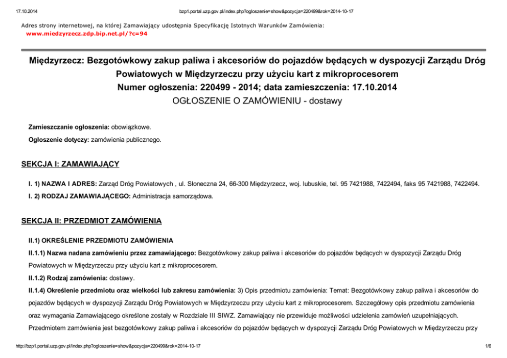 17.10.2014 bzp1.portal.uzp.gov.pl/index.php?ogloszenie=show&pozycja=220499&rok=2014-10-17 Adres strony internetowej, na której Zamawiający udostępnia Specyfikację Istotnych Warunków Zamówienia: www.miedzyrzecz.zdp.bip.net.pl/?c=94 Międzyrzecz: Bezgotówkowy zakup paliwa i akcesoriów do pojazdów będących w dyspozycji Zarządu Dróg Powiatowych w Międzyrzeczu przy użyciu kart z mikroprocesorem Numer ogłoszenia: 220499 - 2014; data zamieszczenia: 17.10.2014 OGŁOSZENIE O ZAMÓWIENIU - dostawy Zamieszczanie ogłoszenia: obowiązkowe. Ogłoszenie dotyczy: zamówienia publicznego. SEKCJA I: ZAMAWIAJĄCY I. 1) NAZWA I ADRES: Zarząd Dróg Powiatowych , ul. Słoneczna 24, 66-300 Międzyrzecz, woj. lubuskie, tel. 95 7421988, 7422494, faks 95 7421988, 7422494. I. 2) RODZAJ ZAMAWIAJĄCEGO: Administracja samorządowa. SEKCJA II: PRZEDMIOT ZAMÓWIENIA II.1) OKREŚLENIE PRZEDMIOTU ZAMÓWIENIA II.1.1) Nazwa nadana zamówieniu przez zamawiającego: Bezgotówkowy zakup paliwa i akcesoriów do pojazdów będących w dyspozycji Zarządu Dróg Powiatowych w Międzyrzeczu przy użyciu kart z mikroprocesorem. II.1.2) Rodzaj zamówienia: dostawy. II.1.4) Określenie przedmiotu oraz wielkości lub zakresu zamówienia: 3) Opis przedmiotu zamówienia: Temat: Bezgotówkowy zakup paliwa i akcesoriów do pojazdów będących w dyspozycji Zarządu Dróg Powiatowych w Międzyrzeczu przy użyciu kart z mikroprocesorem. Szczegółowy opis przedmiotu zamówienia oraz wymagania Zamawiającego określone zostały w Rozdziale III SIWZ. Zamawiający nie przewiduje możliwości udzielenia zamówień uzupełniających. Przedmiotem zamówienia jest bezgotówkowy zakup paliwa i akcesoriów do pojazdów będących w dyspozycji Zarządu Dróg Powiatowych w Międzyrzeczu przy http://bzp1.portal.uzp.gov.pl/index.php?ogloszenie=show&pozycja=220499&rok=2014-10-17 1/6 17.10.2014 bzp1.portal.uzp.gov.pl/index.php?ogloszenie=show&pozycja=220499&rok=2014-10-17 użyciu kart z mikroprocesorem. Przedmiot zamówienia dotyczy bezgotówkowego zakupu na stacjach benzynowych paliwa (benzyna bezołowiowa PB 95 i olej napędowy ON), akcesoriów do pojazdów (płyny do spryskiwaczy, żarówki, bezpieczniki itp.) przy użyciu kart z mikroprocesorem. W wyposażeniu Zamawiającego obecnie znajduje się 11 pojazdów oraz 2 zestawy sprzętowe. Przedmiotem postępowania są sukcesywne, w miarę pojawiających się potrzeb, zakupy paliwa płynnego spełniającego wymagania określone w Rozporządzeniu Ministra Gospodarki i Pracy z dnia 9 grudnia 2008 r. w sprawie wymagań jakościowych dla paliw ciekłych (Dz. U. z 2013 r. poz. 1058 j.t.) zgodnego z normą PN - EN 228 oraz PN - EN 590 w szacunkowych ilościach przedstawionych poniżej: a) benzyna bezołowiowa PB 95 - 6 111 l, b) olej napędowy ON - 19 106 l, a także akcesoriów samochodowych o szacunkowej wartości nie przekraczającej progu stosowania ustawy - Prawo zamówień publicznych określonego w art. 4 pkt 8. II.1.6) Wspólny Słownik Zamówień (CPV): 09.10.00.00-0, 09.13.21.00-4, 09.13.41.00-8. II.1.7) Czy dopuszcza się złożenie oferty częściowej: nie. II.1.8) Czy dopuszcza się złożenie oferty wariantowej: nie. II.2) CZAS TRWANIA ZAMÓWIENIA LUB TERMIN WYKONANIA: Zakończenie: 30.11.2015. SEKCJA III: INFORMACJE O CHARAKTERZE PRAWNYM, EKONOMICZNYM, FINANSOWYM I TECHNICZNYM III.1) WADIUM Informacja na temat wadium: Zamawiający nie wymaga od Wykonawcy wniesienia wadium III.2) ZALICZKI III.3) WARUNKI UDZIAŁU W POSTĘPOWANIU ORAZ OPIS SPOSOBU DOKONYWANIA OCENY SPEŁNIANIA TYCH WARUNKÓW III. 3.1) Uprawnienia do wykonywania określonej działalności lub czynności, jeżeli przepisy prawa nakładają obowiązek ich posiadania Opis sposobu dokonywania oceny spełniania tego warunku Działalność prowadzona na potrzeby wykonania przedmiotu niniejszego zamówienia wymaga posiadania specjalnych uprawnień - koncesji, o której mowa w art. 32 ust. 1 pkt 4 ustawy z dnia 10 kwietnia 1997 r. Prawo energetyczne (Dz. U. z 2012 r. poz. 1059 j. t.) w zakresie obrotu paliwami objętymi niniejszym zamówieniem, tj. benzyną bezołowiową oraz olejem napędowym III.3.2) Wiedza i doświadczenie Opis sposobu dokonywania oceny spełniania tego warunku http://bzp1.portal.uzp.gov.pl/index.php?ogloszenie=show&pozycja=220499&rok=2014-10-17 2/6 17.10.2014 bzp1.portal.uzp.gov.pl/index.php?ogloszenie=show&pozycja=220499&rok=2014-10-17 - wykaz wykonanych, a w przypadku świadczeń okresowych lub ciągłych również wykonywanych, głównych dostaw, w okresie ostatnich trzech lat przed upływem terminu składania ofert, a jeżeli okres prowadzenia działalności jest krótszy - w tym okresie, wraz z podaniem ich wartości, przedmiotu, dat wykonania i podmiotów, na rzecz których dostawy zostały wykonane, oraz załączeniem dowodów, czy zostały wykonane lub są wykonywane należycie III.3.3) Potencjał techniczny Opis sposobu dokonywania oceny spełniania tego warunku Zamawiający odstępuje od opisu sposobu dokonywania oceny spełniania warunków w tym zakresie. Zamawiający dokona oceny spełniania warunków udziału w postępowaniu w tym zakresie na podstawie oświadczenia o spełnianiu warunków udziału w postępowaniu III.3.4) Osoby zdolne do wykonania zamówienia Opis sposobu dokonywania oceny spełniania tego warunku Zamawiający odstępuje od opisu sposobu dokonywania oceny spełniania warunków w tym zakresie. Zamawiający dokona oceny spełniania warunków udziału w postępowaniu w tym zakresie na podstawie oświadczenia o spełnianiu warunków udziału w postępowaniu III.3.5) Sytuacja ekonomiczna i finansowa Opis sposobu dokonywania oceny spełniania tego warunku - przedłożą opłaconą polisę, a w przypadku jej braku inny dokument potwierdzający, że wykonawca jest ubezpieczony od odpowiedzialności cywilnej w zakresie prowadzonej działalności związanej z przedmiotem zamówienia. Jeżeli przedstawiona polisa nie została opłacona w dniu jej zawarcia, celem udokumentowania jej o