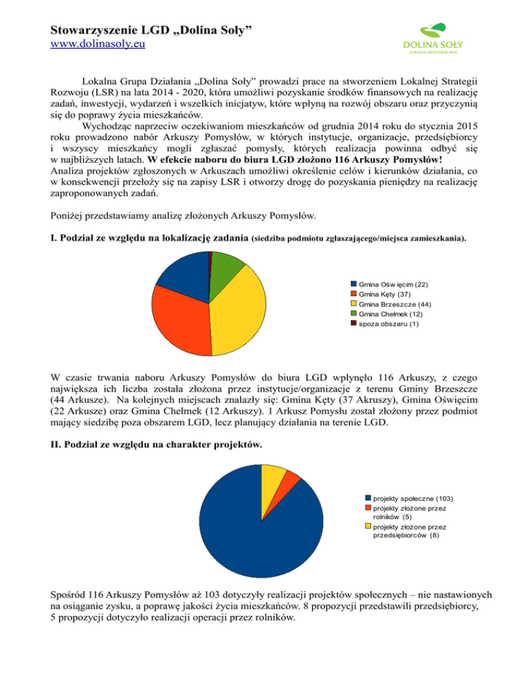 Stowarzyszenie LGD „Dolina Soły” www.dolinasoly.eu Lokalna Grupa Działania „Dolina Soły” prowadzi prace na stworzeniem Lokalnej Strategii Rozwoju (LSR) na lata 2014 - 2020, która umożliwi pozyskanie środków finansowych na realizację zadań, inwestycji, wydarzeń i wszelkich inicjatyw, które wpłyną na rozwój obszaru oraz przyczynią się do poprawy życia mieszkańców. Wychodząc naprzeciw oczekiwaniom mieszkańców od grudnia 2014 roku do stycznia 2015 roku prowadzono nabór Arkuszy Pomysłów, w których instytucje, organizacje, przedsiębiorcy i wszyscy mieszkańcy mogli zgłaszać pomysły, których realizacja powinna odbyć się w najbliższych latach. W efekcie naboru do biura LGD złożono 116 Arkuszy Pomysłów! Analiza projektów zgłoszonych w Arkuszach umożliwi określenie celów i kierunków działania, co w konsekwencji przełoży się na zapisy LSR i otworzy drogę do pozyskania pieniędzy na realizację zaproponowanych zadań. Poniżej przedstawiamy analizę złożonych Arkuszy Pomysłów. I. Podział ze względu na lokalizację zadania (siedziba podmiotu zgłaszającego/miejsca zamieszkania). Gmina Ośw ięcim (22) Gmina Kęty (37) Gmina Brzeszcze (44) Gmina Chełmek (12) spoza obszaru (1) W czasie trwania naboru Arkuszy Pomysłów do biura LGD wpłynęło 116 Arkuszy, z czego największa ich liczba została złożona przez instytucje/organizacje z terenu Gminy Brzeszcze (44 Arkusze). Na kolejnych miejscach znalazły się: Gmina Kęty (37 Akruszy), Gmina Oświęcim (22 Arkusze) oraz Gmina Chełmek (12 Arkuszy). 1 Arkusz Pomysłu został złożony przez podmiot mający siedzibę poza obszarem LGD, lecz planujący działania na terenie LGD. II. Podział ze względu na charakter projektów. projekty społeczne (103) projekty złożone przez rolników (5) projekty złożone przez przedsiębiorców (8) Spośród 116 Arkuszy Pomysłów aż 103 dotyczyły realizacji projektów społecznych – nie nastawionych na osiąganie zysku, a poprawę jakości życia mieszkańców. 8 propozycji przedstawili przedsiębiorcy, 5 propozycji dotyczyło realizacji operacji przez rolników. Stowarzyszenie LGD „Dolina Soły” www.dolinasoly.eu III. Podział ze względu na tematykę projektów. Projekty „społeczne”, czyli nie nastawione na osiągnięcie zysku, stanowiły 89% Arkuszy Pomysłów przekazanych do biura LGD. Ze względu na tematykę projektów podzielono je na projekty dot. infrastruktury, projekty z zakresu sportu i rekreacji oraz projekty z dziedziny edukacji, kultury i szeroko pojętego dziedzictwa regionu. 50 40 30 20 10 0 infrastruktura (42) edukacja, kultura i dziedzictw o regionu (39) sport i rekreacja (22) III.1 Podział projektów ze względu na lokalizację – infrastruktura. W kategorii „infrastruktura” złożono 42 Arkusze Pomysłów. Największa ich liczba dotyczyły projektów zaproponowanych do realizacji w Gminie Brzeszcze – 22 Arkusze. W pozostałych gminach należących do LGD wartości te przedstawiały się następująco: Gmina Kęty – 11 pomysłow, Gmina Oświęcim – 7 pomysłów oraz Gmina Chełmek – 2 pomysły. 25 20 15 Gmina Ośw ięcim (7) Gmina Kęty (11) 10 Gmina Brzeszcze (22) Gmina Chełmek (2) 5 0 III.2 Podział projektów ze względu na lokalizację – sport i rekreacja. Z zakresu sportu i rekreacji złożono 22 Arkusze Pomysłów, które przedstawiały propozycje projektów do zrealizowania na terenie LGD. 8 pomysłów zostało zgłoszonych przez mieszkańców oraz organizacje z terenu Gminy Brzeszcze, 7 projektów z Gminy Kęty, 5 pomysłów z Gminy Oświęcim oraz 1 z terenu Gminy Chełmek. Do LGD złożony został także 1 Arkusz Pomysłu przez osobę spoza obszaru LGD, która jednak byłaby zainteresowana realizacją w naszym regionie zadania z zakresu sportu i rekreacji. 9 8 7 6 5 4 3 2 1 0 Gmina Ośw ięcim (5) Gmina Kęty (7) Gmina Brzeszcze (8) Gmina Chełmek (1) spoza obszaru (1) Stowarzyszenie LGD „Dolina Soły” www.dolinasoly.eu III.3 Podział projektów ze względu na lokalizację – edukacja, kultura i dziedzictwo regionu. Z zakresu edukacji, kultury i dziedzictwa regionu zaproponowano 39 projektów. Największa ich liczba wpłynęła z Gminy Brzeszcze – 13 projektów. Po 9 pomysłów zgłoszono z terenu Gminy Kęty oraz Gminy Chełmek. 8 propozycji nadesłano z Gminy Oświęcim. 14 12 10 Gmina Ośw ięcim (8) 8 Gmina Kęty (9) 6 Gmina Brzeszcze (13) 4 Chełmek (9) 2 0 IV. Charakterystyka projektó komercyjnych, nastawionych na osiągnięcie zysku. 13 Arkuszy Pomysłów dotyczy realizacji zadań zaplanowanych przez rolników oraz przedsiębiorców. Projekty „rolnicze” dotyczą tylko Gminy Kęty. Natomiast operacje zaproponowane przez przedsiębiorców dotyczą 5 realizacji w Gminie Kęty, 2 w Gminie Oświęcim oraz 1 w Gminie Brzeszcze. 6 5 4 Gmina Ośw ięcim (0) 3 Gmina Kęty (5) Gmina Brzeszcze (0) 2 Gmina Chełmek (0) 1 0 rolnicy 6 5 4 Gmina Ośw ięcim (2) 3 Gmina Kęty (5) Gmina Brzeszcze (1) 2 Gmina Chełmek (0) 1 0 przedsiębiorcy Stowarzyszenie LGD „Dolina Soły” www.dolinasoly.eu V. Podział ze względu na status podmiotu zgłaszającego – sektor społeczny i publiczny. 103 Arkusze Pomysłów dotyczące propozycji realizacji zadań „społecznych” zostały złożone zarówno przez podmioty z zakresu sektora finansów publicznych, sektora gospodarczego, jak i organizacje pozarządowe oraz mieszkańców (osoby niezrzeszone). sektor publiczny (58) NGO (17) mieszkańcy/os.fizyczne (24) sektor gospodarczy (4) Źródło: opracowanie własne LGD „Dolina Soły” Stowarzyszenie LGD „Dolina Soły” www.dolinasoly.eu Przykładowe zadania proponowane do realizacji, przedstawione w Arkuszach Pomysłów: 1. zakup i montaż urządzeń do ćwiczeń/siłownia zewnętrzna 2. wykonanie ścieżko rowerowo-spacerowej 3. rozbudowa placu zabaw wraz z utworzeniem siłowni zewnętrznej 4. rozbudowa zaplecza sportowo-rekreacyjnego (boisko do koszykówki, do sitakówki plażowej, siłownia 