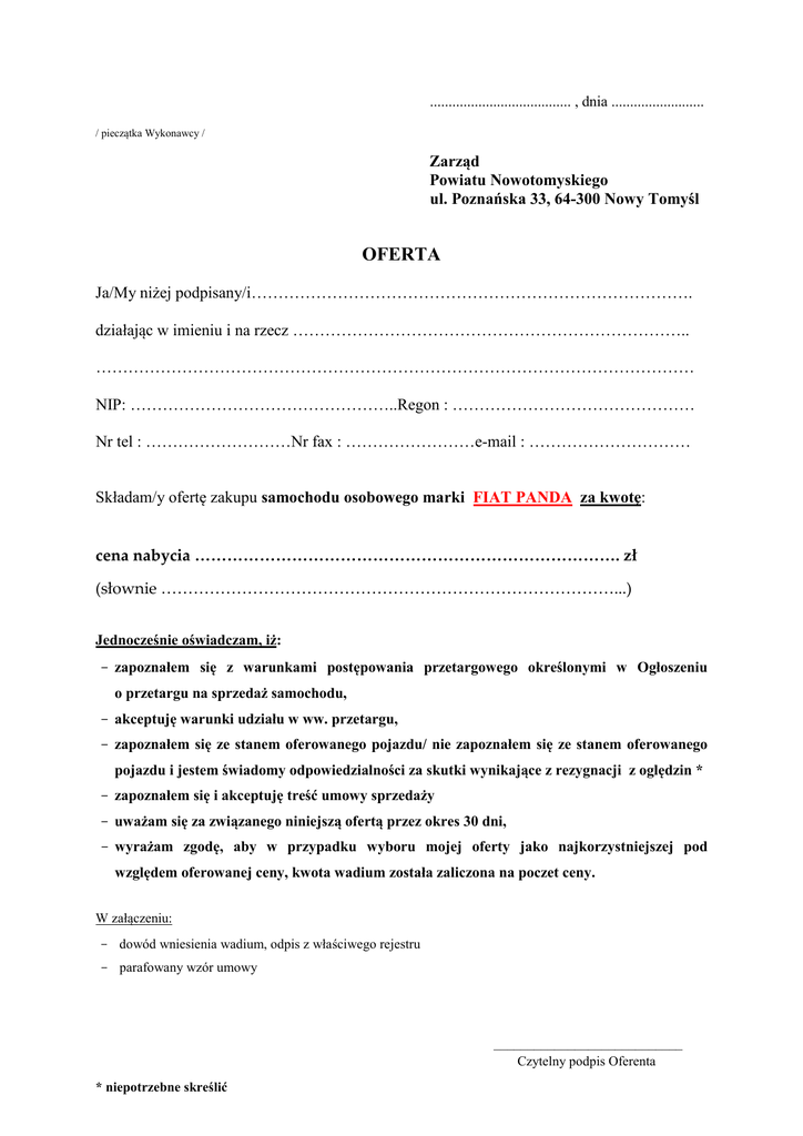 ...................................... , dnia ......................... / pieczątka Wykonawcy / Zarząd Powiatu Nowotomyskiego ul. Poznańska 33, 64-300 Nowy Tomyśl OFERTA Ja/My niżej podpisany/i………………………………………………………………………. działając w imieniu i na rzecz ……………………………………………………………….. ………………………………………………………………………………………………… NIP: …………………………………………..Regon : ……………………………………… Nr tel : ………………………Nr fax : ……………………e-mail : ………………………… Składam/y ofertę zakupu samochodu osobowego marki FIAT PANDA za kwotę: cena nabycia ……………………………………………………………………. zł (słownie …………………………………………………………………………...) Jednocześnie oświadczam, iż: - zapoznałem się z warunkami postępowania przetargowego określonymi w Ogłoszeniu o przetargu na sprzedaż samochodu, - akceptuję warunki udziału w ww. przetargu, - zapoznałem się ze stanem oferowanego pojazdu/ nie zapoznałem się ze stanem oferowanego pojazdu i jestem świadomy odpowiedzialności za skutki wynikające z rezygnacji z oględzin * - zapoznałem się i akceptuję treść umowy sprzedaży - uważam się za związanego niniejszą ofertą przez okres 30 dni, - wyrażam zgodę, aby w przypadku wyboru mojej oferty jako najkorzystniejszej pod względem oferowanej ceny, kwota wadium została zaliczona na poczet ceny. W załączeniu: - dowód wniesienia wadium, odpis z właściwego rejestru - parafowany wzór umowy ____________________________ Czytelny podpis Oferenta * niepotrzebne skreślić