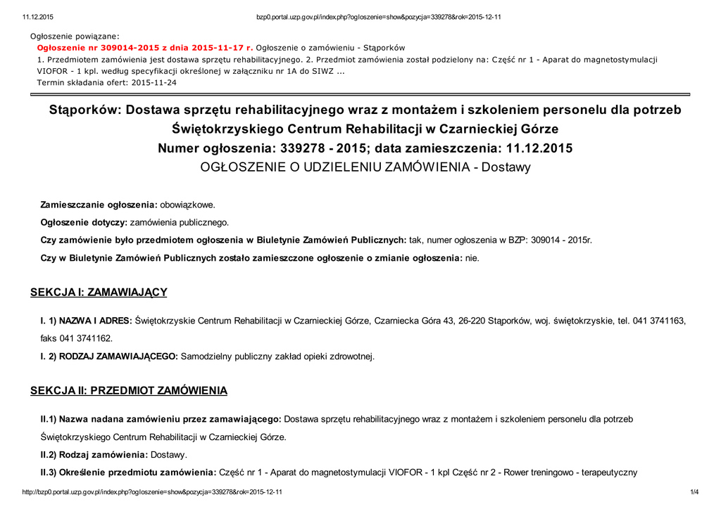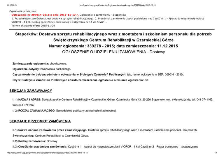 11.12.2015 bzp0.portal.uzp.gov.pl/index.php?ogloszenie=show&pozycja=339278&rok=2015-12-11 Ogłoszenie powiązane: Ogłoszenie nr 309014-2015 z dnia 2015-11-17 r. Ogłoszenie o zamówieniu - Stąporków 1. Przedmiotem zamówienia jest dostawa sprzętu rehabilitacyjnego. 2. Przedmiot zamówienia został podzielony na: C zęść nr 1 - Aparat do magnetostymulacji VIOFOR - 1 kpl. według specyfikacji określonej w załączniku nr 1A do SIWZ ... Termin składania ofert: 2015-11-24 Stąporków: Dostawa sprzętu rehabilitacyjnego wraz z montażem i szkoleniem personelu dla potrzeb Świętokrzyskiego Centrum Rehabilitacji w Czarnieckiej Górze Numer ogłoszenia: 339278 - 2015; data zamieszczenia: 11.12.2015 OGŁOSZENIE O UDZIELENIU ZAMÓWIENIA - Dostawy Zamieszczanie ogłoszenia: obowiązkowe. Ogłoszenie dotyczy: zamówienia publicznego. Czy zamówienie było przedmiotem ogłoszenia w Biuletynie Zamówień Publicznych: tak, numer ogłoszenia w BZP: 309014 - 2015r. Czy w Biuletynie Zamówień Publicznych zostało zamieszczone ogłoszenie o zmianie ogłoszenia: nie. SEKCJA I: ZAMAWIAJĄCY I. 1) NAZWA I ADRES: Świętokrzyskie Centrum Rehabilitacji w Czarnieckiej Górze, Czarniecka Góra 43, 26-220 Stąporków, woj. świętokrzyskie, tel. 041 3741163, faks 041 3741162. I. 2) RODZAJ ZAMAWIAJĄCEGO: Samodzielny publiczny zakład opieki zdrowotnej. SEKCJA II: PRZEDMIOT ZAMÓWIENIA II.1) Nazwa nadana zamówieniu przez zamawiającego: Dostawa sprzętu rehabilitacyjnego wraz z montażem i szkoleniem personelu dla potrzeb Świętokrzyskiego Centrum Rehabilitacji w Czarnieckiej Górze. II.2) Rodzaj zamówienia: Dostawy. II.3) Określenie przedmiotu zamówienia: Część nr 1 - Aparat do magnetostymulacji VIOFOR - 1 kpl Część nr 2 - Rower treningowo - terapeutyczny http://bzp0.portal.uzp.gov.pl/index.php?ogloszenie=show&pozycja=339278&rok=2015-12-11 1/4 11.12.2015 bzp0.portal.uzp.gov.pl/index.php?ogloszenie=show&pozycja=339278&rok=2015-12-11 ERGOMETR - 1 szt Część nr 3 - Stół rehabilitacyjny dwuczęściowy - 4 szt Część nr 4 - Osprzęt do kabiny UGUL - 1kpl Część nr 5 - Stół rehabilitacyjny dwuczęściowy - 6 szt. II.4) Wspólny Słownik Zamówień (CPV): 33.10.00.00-1. SEKCJA III: PROCEDURA III.1) TRYB UDZIELENIA ZAMÓWIENIA: Przetarg nieograniczony III.2) INFORMACJE ADMINISTRACYJNE Zamówienie dotyczy projektu/programu finansowanego ze środków Unii Europejskiej: nie SEKCJA IV: UDZIELENIE ZAMÓWIENIA Część NR: 1 Nazwa: Aparat do magnetostymulacji VIOFOR - 1 kpl. IV.1) DATA UDZIELENIA ZAMÓWIENIA: 01.12.2015. IV.2) LICZBA OTRZYMANYCH OFERT: 1. IV.3) LICZBA ODRZUCONYCH OFERT: 0. IV.4) NAZWA I ADRES WYKONAWCY, KTÓREMU UDZIELONO ZAMÓWIENIA: Med&Life Sp. z.o., ul. M.Dąbrowskiej 45, 05-806 Komorów, kraj/woj. mazowieckie. IV.5) Szacunkowa wartość zamówienia (bez VAT): 8500,00 PLN. IV.6) INFORMACJA O CENIE WYBRANEJ OFERTY ORAZ O OFERTACH Z NAJNIŻSZĄ I NAJWYŻSZĄ CENĄ Cena wybranej oferty: 9250,00 Oferta z najniższą ceną: 9250,00 / Oferta z najwyższą ceną: 9250,00 Waluta: PLN . Część NR: 2 Nazwa: Rower treningowo - terapeutyczny ERGOMETR - 1 szt IV.1) DATA UDZIELENIA ZAMÓWIENIA: 01.12.2015. http://bzp0.portal.uzp.gov.pl/index.php?ogloszenie=show&pozycja=339278&rok=2015-12-11 2/4 11.12.2015 bzp0.portal.uzp.gov.pl/index.php?ogloszenie=show&pozycja=339278&rok=2015-12-11 IV.2) LICZBA OTRZYMANYCH OFERT: 2. IV.3) LICZBA ODRZUCONYCH OFERT: 0. IV.4) NAZWA I ADRES WYKONAWCY, KTÓREMU UDZIELONO ZAMÓWIENIA: Ronomed Sp. z o.o. Sp.k., ul.Przyjażni 52/1U, 53-030 Wrocław, kraj/woj. dolnośląskie. IV.5) Szacunkowa wartość zamówienia (bez VAT): 2800,00 PLN. IV.6) INFORMACJA O CENIE WYBRANEJ OFERTY ORAZ O OFERTACH Z NAJNIŻSZĄ I NAJWYŻSZĄ CENĄ Cena wybranej oferty: 3119,20 Oferta z najniższą ceną: 3119,20 / Oferta z najwyższą ceną: 3412,02 Waluta: PLN . Część NR: 4 Nazwa: Osprzęt do kabiny UGUL - 1kpl IV.1) DATA UDZIELENIA ZAMÓWIENIA: 01.12.2015. IV.2) LICZBA OTRZYMANYCH OFERT: 6. IV.3) LICZBA ODRZUCONYCH OFERT: 0. IV.4) NAZWA I ADRES WYKONAWCY, KTÓREMU UDZIELONO ZAMÓWIENIA: Biuro Handlowe Kinesis Andrzej Boruta, ul.Penara 23, 38-440 Iwonicz Zdrój, kraj/woj. podkarpackie. IV.5) Szacunkowa wartość zamówienia (bez VAT): 3901,48 PLN. IV.6) INFORMACJA O CENIE WYBRANEJ OFERTY ORAZ O OFERTACH Z NAJNIŻSZĄ I NAJWYŻSZĄ CENĄ Cena wybranej oferty: 4309,69 Oferta z najniższą ceną: 4309,69 / Oferta z najwyższą ceną: 6870,78 Waluta: PLN . Część NR: 5 Nazwa: Stół rehabilitacyjny dwuczęściowy - 6 szt IV.1) DATA UDZIELENIA ZAMÓWIENIA: 01.12.2015. IV.2) LICZBA OTRZYMANYCH OFERT: 8. http://bzp0.portal.uzp.gov.pl/index.php?ogloszenie=show&pozycja=339278&rok=2015-12-11 3/4 11.12.2015 bzp0.portal.uzp.gov.pl/index.php?ogloszenie=show&pozycja=339278&rok=2015-12-11 IV.3) LICZBA ODRZUCONYCH OFERT: 0. IV.4) NAZWA I ADRES WYKONAWCY, KTÓREMU UDZIELONO ZAMÓWIENIA: Biuro Handlowe Kinesis Andrzej Boruta, ul. Penara 23, 38-440 Iwonicz Zdrój, kraj/woj. podkarpackie. IV.5) Szacunkowa wartość zamówienia (bez VAT): 10800,00 PLN. IV.6) INFORMACJA O CENIE WYBRANEJ OFERTY ORAZ O OFERTACH Z NAJNIŻSZĄ I NAJWYŻSZĄ CENĄ Cena wybranej oferty: 11664,00 Oferta z najniższą ceną: 11664,00 / Oferta z najwyższą ceną: 15360,00 Waluta: PLN . http://bzp0.portal.uzp.gov.pl/index.php?ogloszenie=show&pozycja=339278&rok=2015-12-11 4/4