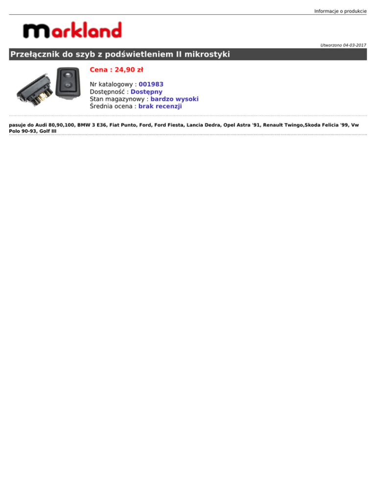 Informacje o produkcie Utworzono 04-03-2017 Przełącznik do szyb z podświetleniem II mikrostyki Cena : 24,90 zł Nr katalogowy : 001983 Dostępność : Dostępny Stan magazynowy : bardzo wysoki Średnia ocena : brak recenzji pasuje do Audi 80,90,100, BMW 3 E36, Fiat Punto, Ford, Ford Fiesta, Lancia Dedra, Opel Astra '91, Renault Twingo,Skoda Felicia '99, Vw Polo 90-93, Golf III
