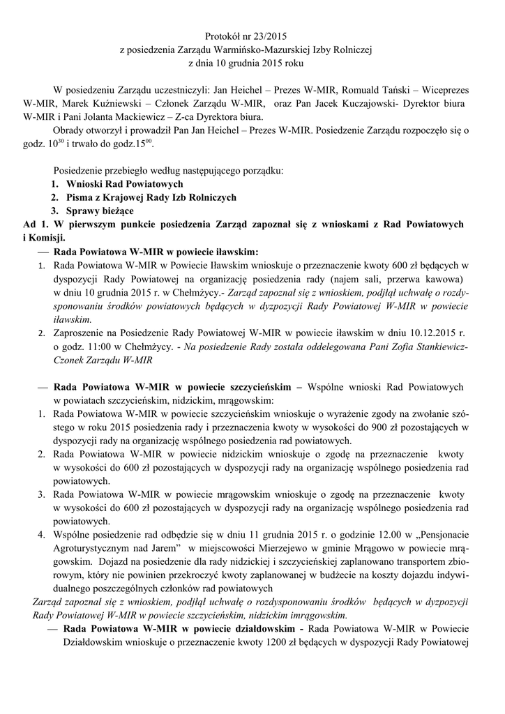 Protokół nr 23/2015 z posiedzenia Zarządu Warmińsko-Mazurskiej Izby Rolniczej z dnia 10 grudnia 2015 roku W posiedzeniu Zarządu uczestniczyli: Jan Heichel – Prezes W-MIR, Romuald Tański – Wiceprezes W-MIR, Marek Kuźniewski – Członek Zarządu W-MIR, oraz Pan Jacek Kuczajowski- Dyrektor biura W-MIR i Pani Jolanta Mackiewicz – Z-ca Dyrektora biura. Obrady otworzył i prowadził Pan Jan Heichel – Prezes W-MIR. Posiedzenie Zarządu rozpoczęło się o godz. 1030 i trwało do godz.1500. Posiedzenie przebiegło według następującego porządku: 1. Wnioski Rad Powiatowych 2. Pisma z Krajowej Rady Izb Rolniczych 3. Sprawy bieżące Ad 1. W pierwszym punkcie posiedzenia Zarząd zapoznał się z wnioskami z Rad Powiatowych i Komisji. Rada Powiatowa W-MIR w powiecie iławskim: 1. Rada Powiatowa W-MIR w Powiecie Iławskim wnioskuje o przeznaczenie kwoty 600 zł będących w dyspozycji Rady Powiatowej na organizację posiedzenia rady (najem sali, przerwa kawowa) w dniu 10 grudnia 2015 r. w Chełmżycy.- Zarząd zapoznał się z wnioskiem, podjłął uchwałę o rozdy sponowaniu środków powiatowych będących w dyzpozycji Rady Powiatowej W-MIR w powiecie iławskim. 2. Zaproszenie na Posiedzenie Rady Powiatowej W-MIR w powiecie iławskim w dniu 10.12.2015 r. o godz. 11:00 w Chełmżycy. - Na posiedzenie Rady została oddelegowana Pani Zofia StankiewiczCzonek Zarządu W-MIR Rada Powiatowa W-MIR w powiecie szczycieńskim – Wspólne wnioski Rad Powiatowych w powiatach szczycieńskim, nidzickim, mrągowskim: 1. Rada Powiatowa W-MIR w powiecie szczycieńskim wnioskuje o wyrażenie zgody na zwołanie szó stego w roku 2015 posiedzenia rady i przeznaczenia kwoty w wysokości do 900 zł pozostających w dyspozycji rady na organizację wspólnego posiedzenia rad powiatowych. 2. Rada Powiatowa W-MIR w powiecie nidzickim wnioskuje o zgodę na przeznaczenie kwoty w wysokości do 600 zł pozostających w dyspozycji rady na organizację wspólnego posiedzenia rad powiatowych. 3. Rada Powiatowa W-MIR w powiecie mrągowskim wnioskuje o zgodę na przeznaczenie kwoty w wysokości do 600 zł pozostających w dyspozycji rady na organizację wspólnego posiedzenia rad powiatowych. 4. Wspólne posiedzenie rad odbędzie się w dniu 11 grudnia 2015 r. o godzinie 12.00 w „Pensjonacie Agroturystycznym nad Jarem” w miejscowości Mierzejewo w gminie Mrągowo w powiecie mrą gowskim. Dojazd na posiedzenie dla rady nidzickiej i szczycieńskiej zaplanowano transportem zbio rowym, który nie powinien przekroczyć kwoty zaplanowanej w budżecie na koszty dojazdu indywi dualnego poszczególnych członków rad powiatowych Zarząd zapoznał się z wnioskiem, podjłął uchwałę o rozdysponowaniu środków będących w dyzpozycji Rady Powiatowej W-MIR w powiecie szczycieńskim, nidzickim imrągowskim. Rada Powiatowa W-MIR w powiecie działdowskim - Rada Powiatowa W-MIR w Powiecie Działdowskim wnioskuje o przeznaczenie kwoty 1200 zł będących w dyspozycji Rady Powiatowej na organizację posiedzenia rady (najem sali, przerwa kawowa) w dniu 16 grudnia 2015 r. w Narzym Kolonia. - Zarząd zapoznał się z wnioskiem, podjłął uchwałę o rozdysponowaniu środ ków będących w dyzpozycji Rady Powiatowej W-MIR w powiecie działdowskim Rada Powiatowa W-MIR w powiecie ełckim: Rada Powiatowa Warmińsko-Mazurskiej Izby Rolniczej w powiecie ełckim zwraca się z prośbą do Zarządu W-MIR o wydatkowanie ze środków własnych Rady kwoty nie przekraczającej 760 zł (sie demset sześćdziesiąt złotych 00/100) na organizację posiedzenia Rady Powiatowej W-MIR w powiecie ełckim w dniu 09 grudnia 2015 r., które odbędzie się w restauracji „ZORZA” ul. Ełcka 1 19-335 Prostki.- Zarząd zapoznał się z wnioskiem, podjłął uchwałę o rozdysponowaniu środków bę dących w dyzpozycji Rady Powiatowej W-MIR w powiecie ełckim. Rada Powiatowa W-MIR w powiecie bartoszyckim: Rady Powiatowe Warmińsko-Mazurskiej Izby Rolniczej w powiecie bartoszyckim, kętrzyńskim i lidzbarskim w celu częściowego sfinansowania zakupu materiałów szkoleniowych na przeprowa dzenie szkolenia nt „Nowoczesne nawożenie roślin, odżywianie nawozami azotowymi – Płynna for muła” zwraca się z prośbą o przeznaczenie na ten cel z puli środków przeznaczonych na statutową działalność Rad do kwoty 700,00 zł: w tym: - ze środków Rady W-MIR w powiecie bartoszyckim - 30, 00 zł - ze środków Rady W-MIR w powiecie kętrzyńskim - 420,00 zł - ze środków Rady W-MIR w powiecie lidzbarskim - 250,00 zł Zarząd zapoznał się z wnioskiem, podjął uchwałę w sprawie wspólorganizacji szkolenia. Rada Powiatowa W-MIR w powiecie węgorzewskim - Wnioski na Walne Zgromadzenie W-MIR: 1. Rada Powiatowa Warmińsko-Mazurskiej Izby Rolniczej w powiecie węgorzewskim zwraca się z prośbą do Zarządu W-MIR o zwiększenie diet za posiedzenia Rad Powiatowych Warmińsko-Ma zurskiej Izby Rolniczej oraz zwiększenie puli środków finansowych będących w dyspozycji Rady Powiatowej Warmińsko-Mazurskiej Izby Rolniczej na działalność statutową Izby (wniosek skierowa ny jest w odniesieniu do wszystkich rad powiatowych województwa warmińsko-mazurskiego).Zgodnie z ustawą o Izbach Rolniczych za gospodarkę finansową izby. Środki na działalność statuto wa w ostatnich latach wzrosły z 50 zł na 200 zł na poszczególnego członka Rady. Z planu budżetu na rok 2016 wynika, że zarówno dochody jak i wydatki bilansują się na zero. W związku z czym Zarząd dbając o prawidłowa gospodarkę finansową W-MIR nie może uwzględnić zwiększenia diet i środków dla rad w budżecie na rok 2016. 2. Rada Powiatowa Warmińsko-Mazurskiej Izby Rolniczej w powiecie węgorzewskim zwraca się z prośbą do Zarządu W-MIR o egzekwowanie terminów wypłat należności od Agencji Rynku Rolne go. Po otrzymaniu decyzji np. za materiał siewny ARR ma termin wypłaty należności w terminie 30 dni. Terminy te nie są przestrzegane i rada wnioskuje o wypła