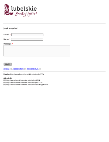 Język Angielski E-mail * Name * Message * Wyślij Drukuj [1] Pobierz PDF [2] Pobierz DOC [3] Źródło: http://www.invest.lubelskie.pl/pl/node/1514 Odnośniki [1] http://www.invest.lubelskie.pl/pl/print/1514 [2] http://www.invest.lubelskie.pl/pl/printpdf/1514 [3] http://www.invest.lubelskie.pl/pl/print/1514?type=doc