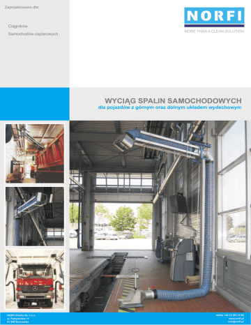Zaprojektowano dla: Ciągników Samochodów ciężarowych MORE THAN A CLEAN SOLUTION WYCIĄG SPALIN SAMOCHODOWYCH dla pojazdów z górnym oraz dolnym układem wydechowym NORFI Polska Sp. z o.o. ul. Partyzantów 11 41-200 Sosnowiec tel/fax +48 32 263 33 88 www.norfi.pl [email protected] Ramię odciagowe AU przeznaczone jest do obsługi pojazdów z górnym układem wydechowym. Samonośna konstrukcja utrzymuje raz zadaną pozycję. Mechanizm obrotu oraz unoszenia ramienia został zaprojektowany w oparciu o przekładnie mechaniczne, co pozwoliło na wyeliminowanie przegubów ciernych, nie gwarantujących wystarczającej stabilności układu. Zamontowanie ramienia na wózku jezdnym pozwala na znaczące zwiększenie jego zasięgu pracy umożliwiając np. obsługę pojazdów wzdłuż kanału przeglądowego. Obrotowa głowica daje możliwość dowolnego pozycjonowania ramienia a dzięki regulacji wysokości można dopasować ssawkę do konkretnego pojazdu. O O Dodatkowo ssawka ma regulowany kąt pracy od 0 - 90 360O 90O regulowana wysokość ~1500 mm Bardziej rozbudowana wersja AU-KOMBI może obsługiwać pojazdy z górną oraz dolna rurą wydechową. Aby ograniczyć ilość odciąganego powietrza, zastosowano przepustnicę odcinającą strumień powietrza od ramienia lub od węża odciągowego. wysokość szyny ok. 4 - 4.5m MORE THAN A CLEAN SOLUTION Pełna obsługa ramienia odbywa się z poziomu podłogi. Oferujemy również wersje zdalnie sterowane. Ramie odciągowe AU jest musi być zamontowane na szynie NORFI typ ALU-250 lub większej. opcja Ramię odciagowe AU Opis dla górnych układów wydechowych Długość Obsługa górnych rur wydechowych. Obsługa dolnych rur wydechowych: Kąt obrotu ramienia Regulacja wysokości Regulacja kata nachylenia ssawki ramienia Pełna obsługa z poziomu podłogi Przepustnica TAK NIE 360O ~1500mm O 0O,45 O ,90 TAK NIE Odporność termiczna Maksymalna wydajność 200OC 3 2.500m /h masa: 1,9 m 2,8 m 75,5 kg 78,5 kg Ramię odc. AU-KOMBI Opis Nr katal. 06-4284-200 06-4284-203 Długość Nr katal. 1,9 m 2,8 m 06-4283-200 06-4283-209 dla gónych i dolnych układów wydech. Obsługa górnych rur wydechowych. Obsługa dolnych rur wydechowych: Kąt obrotu ramienia Regulacja wysokości Regulacja kata nachylenia ssawki ramienia Pełna obsługa z poziomu podłogi Przepustnica TAK TAK 360O ~1500mm O O O 0 ,45 ,90 TAK TAK Odporność termiczna Maksymalna wydajność 200OC 3 2.500m /h masa: NORFI Polska Sp. z o.o. ul. Partyzantów 11 41-200 Sosnowiec 88,7 kg 91,7 kg tel/fax +48 32 263 33 88 www.norfi.pl [email protected]