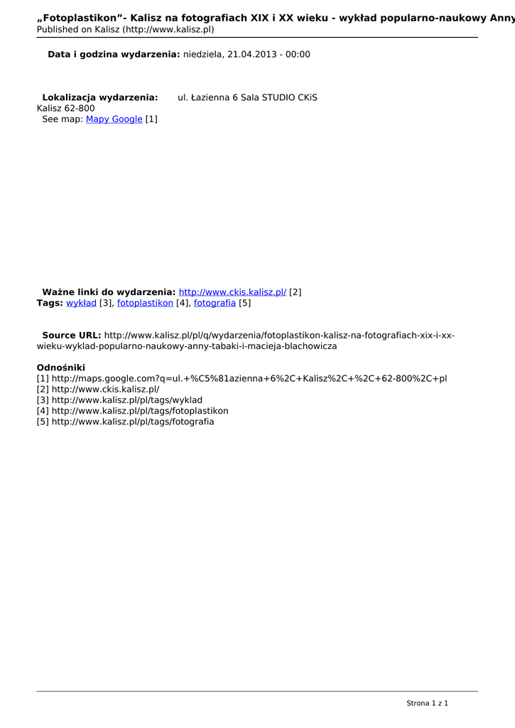 „Fotoplastikon”- Kalisz na fotografiach XIX i XX wieku - wykład popularno-naukowy Anny Published on Kalisz (http://www.kalisz.pl) Data i godzina wydarzenia: niedziela, 21.04.2013 - 00:00 Lokalizacja wydarzenia: Kalisz 62-800 See map: Mapy Google [1] ul. Łazienna 6 Sala STUDIO CKiS Ważne linki do wydarzenia: http://www.ckis.kalisz.pl/ [2] Tags: wykład [3], fotoplastikon [4], fotografia [5] Source URL: http://www.kalisz.pl/pl/q/wydarzenia/fotoplastikon-kalisz-na-fotografiach-xix-i-xxwieku-wyklad-popularno-naukowy-anny-tabaki-i-macieja-blachowicza Odnośniki [1] http://maps.google.com?q=ul.+%C5%81azienna+6%2C+Kalisz%2C+%2C+62-800%2C+pl [2] http://www.ckis.kalisz.pl/ [3] http://www.kalisz.pl/pl/tags/wyklad [4] http://www.kalisz.pl/pl/tags/fotoplastikon [5] http://www.kalisz.pl/pl/tags/fotografia Strona 1 z 1 Powered by TCPDF (www.tcpdf.org)