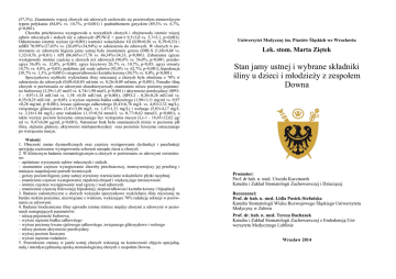 (57,3%). Znamiennie więcej chorych niż zdrowych cechowało się przetrwałym niemowlęcym typem połykania (84,0% vs. 10,7%, p<0,001) i podniebieniem gotyckim (89,3% vs. 6,7%, p<0,001). Choroba próchnicowa występowała u wszystkich chorych i obejmowała istotnie więcej zębów mlecznych i stałych niż u zdrowych (PUW/Z + puw/z 9,5±3,0 vs. 5,7±5,1, p<0,001). Odnotowano istotnie wyższe (p<0,001) wartości wskaźników GI (0,90±0,56 vs. 0,39±0,53) i mSBI 70,99%±27,65% vs. (26,69%±34,94%) w odniesieniu do zdrowych. W chorych w porównaniu ze zdrowymi higiena jamy ustnej była znamiennie gorsza (OHI-S (1,68±0,68 vs. 1,32±0,76, p<0,01) i API (86,66%±17,78 vs. 66,34%±34,33, p<0,001). Zaburzenia zgryzu występowały istotnie częściej u chorych niż zdrowych (96,0% vs. 56,0%, p<0,001; przodozgryz 56,0% vs. 12,0%, p<0,001; zgryz krzyżowy 26,7% vs. 10,7%, p<0,05; zgryz otwarty 14,7% vs. 4,0%, p<0,05), podobnie jak wady zębowe (92,0% vs. 62,7%, p<0,001), hipodoncja (38,7% vs. 1,3%, p<0,001) i nieprawidłowości kształtu korony (30,7% vs. 0,0%, p<0,001). Spoczynkowa szybkość wydzielania śliny mieszanej u chorych była obniżona o 70% w odniesieniu do zdrowych (0,08±0,0,05 ml/min vs. 0,26±0,09 ml/min, p<0,001). Ponadto ślinę chorych w porównaniu ze zdrowymi charakteryzowały znamiennie niższe poziomy pojemności buforowej (3,29±1,43 mol/l vs. 4,74±1,90 mol/l, p<0,001) i aktywności peroksydazy (SPO1 - 0,97±1,18 mlU/ml vs. 1,58 ±0,58 mlU/ml, p<0,001), (SPO-2 - 0,26±0,28 mlU/ml vs. 0,35±0,25 mlU/ml , p<0,05). a wyższe stężenia białka całkowitego (1,90±1,11 mg/ml vs. 0,97 ±0,28 mg/ml, p<0,001), kwasu sjalowego całkowitego (8,43±6,76 mg/L vs. 4,03±2,32 mg/L), związanego glikozydowo (3,41±3,86 mg/L vs. 1,87±1,31 mg/L) i wolnego (5,03±4,17 mg/L vs. 2,16±1,84 mg/L) oraz rodanków (1,15±0,54 mmol/L vs. 0,77±0,62 mmol/L p<0,001), a także wyższy poziom lizozymu oznaczanego bez wytrącenia mucyn (Lz-1 - 18,45±12,62 μg/ ml vs. 9,47±6,04 μg/ml, p<0,001). Natomiast brak było znamiennych różnic w poziomie pH śliny, stężeniu glukozy, aktywności mieloperoksydazy oraz poziomie lizozymu oznaczanego po wytrąceniu mucyn. Wnioski 1. Obecność zmian dysmorficznych oraz częstsze występowanie dysfunkcji i parafunkcji sprzyjają częstszemu występowaniu schorzeń narządu żucia u chorych. 2. W klinicznym badaniu stomatologicznym u chorych w porównaniu ze zdrowymi stwierdzono: – opóźnione wyrzynanie zębów mlecznych i stałych. – znamiennie częstsze występowanie choroby próchnicowej, intensywniejszy jej przebieg i mniejsze zaspokojenie potrzeb leczniczych – gorszy poziom higieny jamy ustnej wyrażony wartościami wskaźników płytki nazębnej – znamiennie częstsze występowanie zapalenia dziąseł i większą jego intensywność – istotnie częstsze występowanie wad zgryzu i wad zębowych – znamiennie częstszą frekwencję hipodoncji, nieprawidłowości kształtu korony i hipoplazji 3. Badanie sialometryczne u chorych wykazało spoczynkowe wydzielanie śliny mieszanej na bardzo niskim poziomie, niezwiązane z wiekiem, wykazujące 70% redukcję sekrecji w porównaniu ze zdrowymi. 4. Badanie biochemiczne śliny ujawniło istotne różnice między chorymi a zdrowymi w poziomach następujących parametrów: – niższą pojemność buforową – wyższe stężenie białka całkowitego – wyższe poziomy kwasu sjalowego całkowitego, związanego glikozydowo i wolnego – niższy poziom aktywności peroksydazy – wyższy poziom lizozymu – wyższe stężenie rodanków. 5. Stwierdzone zmiany w jamie ustnej chorych wskazują na konieczność objęcia specjalną, stałą i interdyscyplinarną opieką stomatologiczną chorych z zespołem Downa. . Uniwersytet Medyczny im. Piastów Śląskich we Wrocławiu Lek. stom. Marta Ziętek Stan jamy ustnej i wybrane składniki śliny u dzieci i młodzieży z zespołem Downa Promotor: Prof. dr hab. n. med. Urszula Kaczmarek Katedra i Zakład Stomatologii Zachowawczej i Dziecięcej Recenzenci: Prof. dr hab. n. med. Lidia Postek-Stefańska Katedra Stomatologii Wieku Rozwojowego Śląskiego Uniwersytetu Medycyny w Zabrzu Prof. dr. hab. n. med. Teresa Bachanek Katedra i Zakład Stomatologii Zachowawczej z Endodoncją Uniwersytetu Medycznego Lublinie Wrocław 2014 Lek. stom. Marta Ziętek Życiorys WYKSZTAŁCENIE 1997-2002 Akademia Medyczna we Wrocławiu – studia na Wy dziale Lekarsko-Stomatologicznym – dyplom lekarza stomatologa PRAKTYKA ZAWODOWA Od 01.12.2003 – Katedra i Zakład Stomatologii Zachowawczej i Dziecięcej Uniwersytetu Medycznego im. Piastów Śląskich we Wrocławiu na stanowisku asystenta DOROBEK NAUKOWY: 9 publikacji w czasopismach naukowych 2 streszczenia zagraniczne prezentowane w formie plakatu na międzynarodowych konferencjach naukowych, opublikowane w materiałach zjazdowych STRESZCZENIE Wprowadzenie. Zespół Downa jest najczęściej spotykaną aberracją chromosomów autosomalnych (47, XX+21/ 47, XY+21). Anomalie jej towarzyszące są wynikiem zaburzonej morfogenezy narządowo-tkankowej, wynikającej z niekompletnej embriogenezy wskutek obecności dodatkowego 21 chromosomu autosomalnego (lub jego ramion długich) w kariotypie. Choroba ta spotykana jest u różnych ras z podobną częstotliwością (1: 600-700 żywych urodzeń). Cechom dysmorficznym i wadom układowym w całym organizmie towarzyszy niepełnosprawność umysłowa różnego stopnia. Charakterystycznymi dla zespołu Downa cechami dysmorficznymi są: mała, skrócona w wymiarze przednio-tylnym i spłaszczona w części potylicznej głowa, rzadkie i proste włosy, okrągła i płaska twarz, nos krótki, płaski o szerokiej nasadzie, małe, nisko osadzone i zdeformowane uszy (górna część małżowiny usznej zawinięta lub bardzo mały płatek uszny bądź jego brak), skośne i wąskie szpary powiekowe ze zmarszczką nakątną, wargi grube i popękane, usta często otwarte z wywiniętą dolną wargą i wysuniętym 