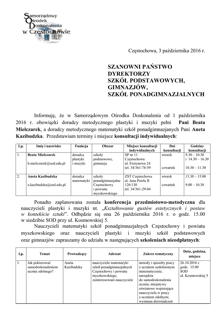 Częstochowa, 3 października 2016 r. SZANOWNI PAŃSTWO DYREKTORZY SZKÓŁ PODSTAWOWYCH, GIMNAZJÓW, SZKÓŁ PONADGIMNAZJALNYCH Informuję, że w Samorządowym Ośrodku Doskonalenia od 1 października 2016 r. obowiązki doradcy metodycznego plastyki i muzyki pełni Pani Beata Mielczarek, a doradcy metodycznego matematyki szkół ponadgimnazjanych Pani Aneta Kazibudzka. Przedstawiam terminy i miejsce konsultacji indywidualnych: Lp. 1. Imię i nazwisko Funkcja Beata Mielczarek [email protected] 2. Aneta Kazibudzka [email protected] doradca plastyki i muzyki Obszar szkoły podstawowe, gimnazja doradca szkoły matematyki ponadgimnazjalne Częstochowy i powiatu myszkowskiego Miejsce konsultacji indywidualnych SP nr 11 Częstochowa ul. Festynowa 24 tel. 34/361-78-59 Dni konsultacji wtorek Godziny konsultacji 9.30 – 10.30 i 14.30 – 16.30 czwartek 10.30 – 11.30 ZST Częstochowa al. Jana Pawła II 126/130 tel. 34/361-29-04 wtorek 13.30 – 15.00 czwartek 9.00 – 10.30 Ponadto zaplanowana została konferencja przedmiotowo-metodyczna dla nauczycieli plastyki i muzyki nt. „Kształtowanie gustów estetycznych i postaw w kontekście sztuki”. Odbędzie się ona 26 października 2016 r. o godz. 15.00 w siedzibie SOD przy ul. Kosmowskiej 5. Nauczycieli matematyki szkół ponadgimnazjalnych Częstochowy i powiatu myszkowskiego oraz nauczycieli plastyki i muzyki szkół podstawowych oraz gimnazjów zapraszamy do udziału w następujących szkoleniach nieodpłatnych: Lp. 1. Temat Jak pokierować samodoskonaleniem ucznia zdolnego? Prowadzący Aneta Kazibudzka Adresat nauczyciele matematyki szkół ponadgimnazjalnych Częstochowy i powiatu myszkowskiego, zainteresowani nauczyciele Zakres tematyczny metody i sposoby pracy z uczniem uzdolnionym matematycznie; narzędzia do samodoskonalenia ucznia; inicjatywy oświatowe wspierające nauczyciela w pracy z uczniem zdolnym; wymiana doświadczeń Data, godzina, miejsce 26.10.2016 r. godz. 15.00 SOD ul. Kosmowskiej 5 2. A do czego to mi się przyda? Zastosowania matematyki w praktyce? Aneta Kazibudzka nauczyciele matematyki szkół ponadgimnazjalnych Częstochowy i powiatu myszkowskiego, zainteresowani nauczyciele Gliniane anioły Beata Mielczarek nauczyciele szkół podstawowych, gimnazjów oraz zainteresowani nauczyciele Klimaty Bożego Narodzenia Beata Mielczarek nauczyciele szkół podstawowych, gimnazjów oraz zainteresowani nauczyciele 3. 4. zadania matematyczne osadzone w kontekście praktycznym; zasoby elektroniczne obrazujące zastosowania matematyki w życiu codziennym; wymiana doświadczeń glina materiałem doskonalącym umiejętności manualne; tworzenie w glinie jako sposób kreacji artystycznej, przestrzenią zabawy i odreagowania napięć ucznia; zajęcia warsztatowe – wykonanie płaskorzeźby z elementami faktury pielęgnowanie tradycji w sztuce; korelacja sztuk plastycznych z muzyką; kolędy i pastorałki ważnym elementem budującym nastrój; zajęcia warsztatowe wykonanie oryginalnych dekoracji, ozdób i upominków w różnych materiałach (papier, filc,wełna, tkaniny naturalne...); dekorowanie wypalonych ceramicznych aniołów 29.11.2016 r. godz. 15.00 ZST Częstochowa al. Jana Pawła II nr 126/130 16.11.2016 r. godz. 15.00 SP nr 11 Częstochowa ul. Festynowa 24 7.12.2016 r. godz.15.00 SOD ul. Kosmowskiej 5 Proszę o przekazanie powyższej informacji nauczycielom w Państwa szkołach. Serdecznie zapraszam do udziału. Z poważaniem Zbigniew Janus – dyrektor SOD