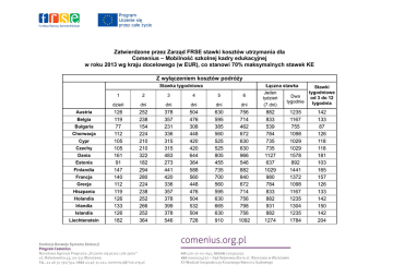Zatwierdzone przez Zarząd FRSE stawki kosztów utrzymania dla Comenius – Mobilność szkolnej kadry edukacyjnej w roku 2013 wg kraju docelowego (w EUR), co stanowi 70% maksymalnych stawek KE Z wyłączeniem kosztów podróży Stawka tygodniowa Austria Belgia Bułgaria Chorwacja Cypr Czechy Dania Estonia Finlandia Francja Grecja Hiszpania Holandia Irlandia Islandia Liechtenstein 1 2 3 4 5 6 dzień dni dni dni dni dni 126 119 77 112 105 105 161 91 147 140 112 119 126 133 126 182 252 238 154 224 210 210 322 182 294 280 224 238 252 266 252 364 378 357 231 336 315 315 483 273 441 420 336 357 378 399 378 546 504 476 308 448 420 420 644 364 588 560 448 476 504 532 504 728 630 595 385 560 525 525 805 455 735 700 560 595 630 665 630 910 756 714 462 672 630 630 966 546 882 840 672 714 756 798 756 1092 Łączna stawka Jeden Dwa tydzień tygodnie (7 dni) 882 833 539 784 735 735 1127 637 1029 980 784 833 882 931 882 1274 1235 1167 755 1098 1029 1029 1578 892 1441 1372 1098 1167 1235 1304 1235 1784 Stawki tygodniowe od 3 do 12 tygodnia 142 133 87 126 118 118 181 103 165 157 126 133 142 150 142 204 Litwa Luksemburg Łotwa Malta Niemcy Norwegia Portugalia Rumunia Słowacja Słowenia Szwajcaria Szwecja Turcja Węgry Wielka Brytania Włochy 91 119 91 98 112 182 105 84 98 112 182 147 98 98 161 133 182 238 182 196 224 364 210 168 196 224 364 294 196 196 322 266 273 357 273 294 336 546 315 252 294 336 546 441 294 294 483 399 364 476 364 392 448 728 420 336 392 448 728 588 392 392 644 532 455 595 455 490 560 910 525 420 490 560 910 735 490 490 805 665 546 714 546 588 672 1092 630 504 588 672 1092 882 588 588 966 798 637 833 637 686 784 1274 735 588 686 784 1274 1029 686 686 1127 931 892 1167 892 961 1098 1784 1029 824 961 1098 1784 1441 961 961 1578 1304 103 133 103 110 126 204 118 94 110 126 204 165 110 110 181 150