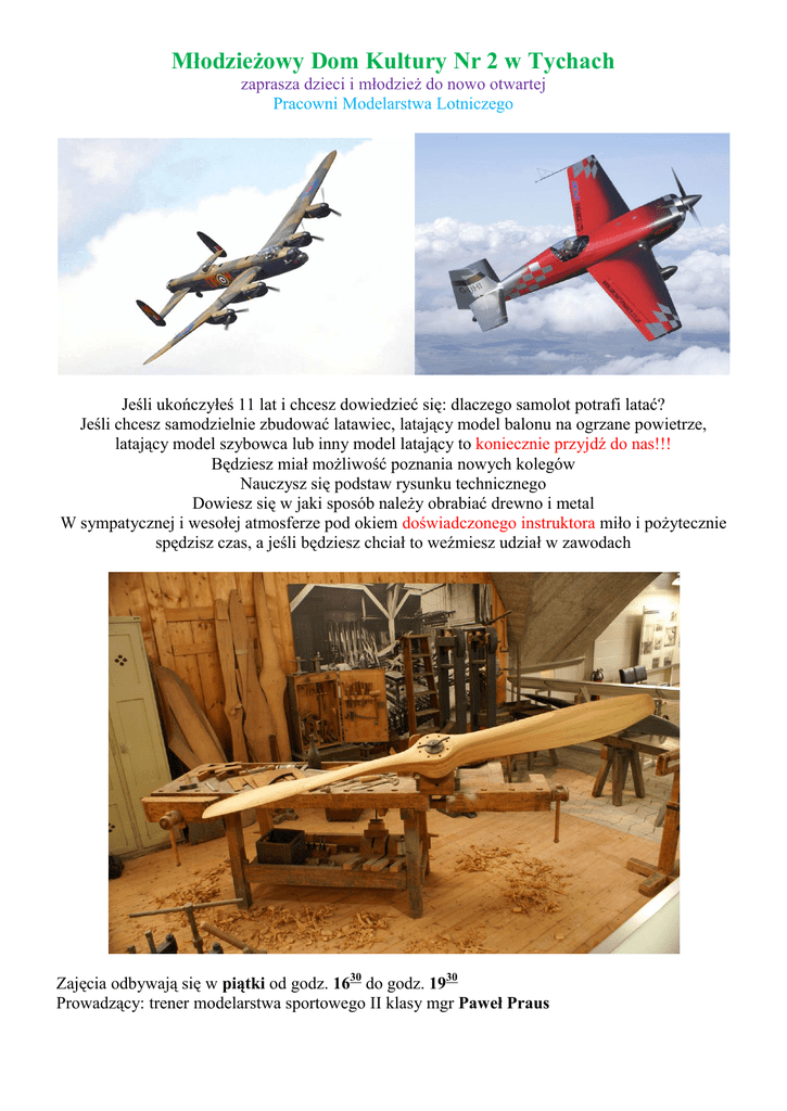 Młodzieżowy Dom Kultury Nr 2 w Tychach zaprasza dzieci i młodzież do nowo otwartej Pracowni Modelarstwa Lotniczego Jeśli ukończyłeś 11 lat i chcesz dowiedzieć się: dlaczego samolot potrafi latać? Jeśli chcesz samodzielnie zbudować latawiec, latający model balonu na ogrzane powietrze, latający model szybowca lub inny model latający to koniecznie przyjdź do nas!!! Będziesz miał możliwość poznania nowych kolegów Nauczysz się podstaw rysunku technicznego Dowiesz się w jaki sposób należy obrabiać drewno i metal W sympatycznej i wesołej atmosferze pod okiem doświadczonego instruktora miło i pożytecznie spędzisz czas, a jeśli będziesz chciał to weźmiesz udział w zawodach Zajęcia odbywają się w piątki od godz. 1630 do godz. 1930 Prowadzący: trener modelarstwa sportowego II klasy mgr Paweł Praus