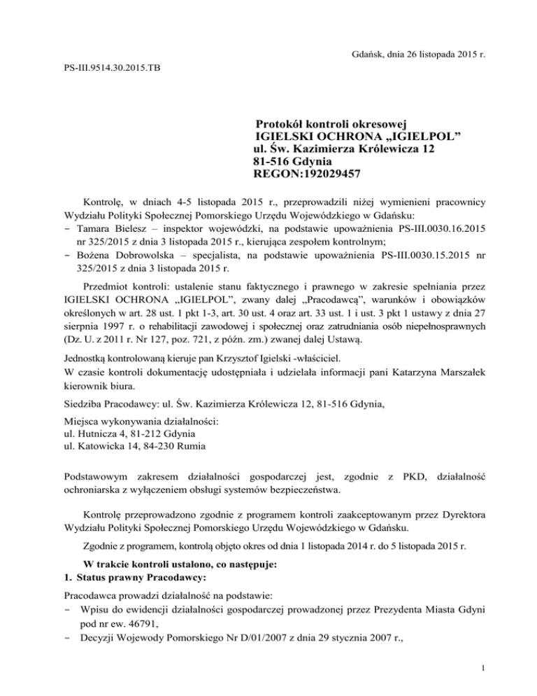 Gdańsk, dnia 26 listopada 2015 r. PS-III.9514.30.2015.TB Protokół kontroli okresowej IGIELSKI OCHRONA „IGIELPOL” ul. Św. Kazimierza Królewicza 12 81-516 Gdynia REGON:192029457 Kontrolę, w dniach 4-5 listopada 2015 r., przeprowadzili niżej wymienieni pracownicy Wydziału Polityki Społecznej Pomorskiego Urzędu Wojewódzkiego w Gdańsku: - Tamara Bielesz – inspektor wojewódzki, na podstawie upoważnienia PS-III.0030.16.2015 nr 325/2015 z dnia 3 listopada 2015 r., kierująca zespołem kontrolnym; - Bożena Dobrowolska – specjalista, na podstawie upoważnienia PS-III.0030.15.2015 nr 325/2015 z dnia 3 listopada 2015 r. Przedmiot kontroli: ustalenie stanu faktycznego i prawnego w zakresie spełniania przez IGIELSKI OCHRONA „IGIELPOL”, zwany dalej „Pracodawcą”, warunków i obowiązków określonych w art. 28 ust. 1 pkt 1-3, art. 30 ust. 4 oraz art. 33 ust. 1 i ust. 3 pkt 1 ustawy z dnia 27 sierpnia 1997 r. o rehabilitacji zawodowej i społecznej oraz zatrudniania osób niepełnosprawnych (Dz. U. z 2011 r. Nr 127, poz. 721, z późn. zm.) zwanej dalej Ustawą. Jednostką kontrolowaną kieruje pan Krzysztof Igielski -właściciel. W czasie kontroli dokumentację udostępniała i udzielała informacji pani Katarzyna Marszałek kierownik biura. Siedziba Pracodawcy: ul. Św. Kazimierza Królewicza 12, 81-516 Gdynia, Miejsca wykonywania działalności: ul. Hutnicza 4, 81-212 Gdynia ul. Katowicka 14, 84-230 Rumia Podstawowym zakresem działalności gospodarczej jest, zgodnie z PKD, działalność ochroniarska z wyłączeniem obsługi systemów bezpieczeństwa. Kontrolę przeprowadzono zgodnie z programem kontroli zaakceptowanym przez Dyrektora Wydziału Polityki Społecznej Pomorskiego Urzędu Wojewódzkiego w Gdańsku. Zgodnie z programem, kontrolą objęto okres od dnia 1 listopada 2014 r. do 5 listopada 2015 r. W trakcie kontroli ustalono, co następuje: 1. Status prawny Pracodawcy: Pracodawca prowadzi działalność na podstawie: - Wpisu do ewidencji działalności gospodarczej prowadzonej przez Prezydenta Miasta Gdyni pod nr ew. 46791, - Decyzji Wojewody Pomorskiego Nr D/01/2007 z dnia 29 stycznia 2007 r., 1 - Koncesji wydanej przez Ministra Spraw Wewnętrznych i Administracji Nr L-1581/00 z dnia 21 września 2011 r. 2. Spełnianie przez Pracodawcę warunków określonych w art. 28 ustawy z dnia 27 sierpnia 1997 r. o rehabilitacji zawodowej i społecznej oraz zatrudniania osób niepełnosprawnych: 1) stan zatrudnienia ogółem: [..]* osób ([..]* etatów), w tym niepełnosprawnych [..]* osoby ([..]* etatów). Wszystkie osoby zatrudnione są na podstawie przepisów kodeksu pracy. []* osoba ([]*etat) ma orzeczony lekki stopień niepełnosprawności, []*osoby (80,625 etatów) ma orzeczony umiarkowany stopień niepełnosprawności, 18 osób (18 etatów) ma orzeczony znaczny stopień niepełnosprawności (zestawienie zatrudnienia na dzień 4 listopada 2015 r. stanowi tabela V w załączniku nr 1 do protokołu). Pracodawca przedstawił zespołowi kontrolnemu stan zatrudnienia w losowo wybranym czasie kontrolowanego okresu: informacja o zatrudnieniu średniomiesięcznym w miesiącu listopadzie 2014 r. (tabela I w załączniku nr 1 do protokołu), informacja o zatrudnieniu średniomiesięcznym w miesiącu styczniu 2015 r. (tabela II w załączniku nr 1 do protokołu), informacja o zatrudnieniu średniomiesięcznym stanie zatrudnienia w miesiącu kwietniu 2015 r. (tabela III w załączniku nr 1 do protokołu), informacja o zatrudnieniu średniomiesięcznym w miesiącu lipcu 2015 r. (tabela IV w załączniku nr 1 do protokołu), informacja o zatrudnieniu średniomiesięcznym w miesiącu październiku 2015 r. (tabela V w załączniku nr 1 do protokołu), Zespół kontrolny stwierdził, że w okresie poddanym kontroli pracodawca wypełniał warunki zatrudnienia, określone w art. 28 ust. 1 ustawy z dnia 27 sierpnia 1997 r. o rehabilitacji zawodowej i społecznej oraz zatrudniania osób niepełnosprawnych, dla pracodawców posiadających status zakładu pracy chronionej. W trakcie czynności kontrolnych skontrolowano akta osobowe [.]*losowo wybranych osób niepełnosprawnych zatrudnionych w zakładzie: []*osób mających orzeczony znaczny stopień niepełnosprawności []*osób mających orzeczony umiarkowany stopień niepełnosprawności, []* osoby mającej orzeczony lekki stopień niepełnosprawności (zestawienie stanowi załącznik nr 2 do protokołu). We wszystkich aktach osobowych, objętych kontrolą, stwierdza się aktualne umowy o pracę (z treści umowy wynika zakres czynności), aktualne zaświadczenia lekarskie o braku przeciwwskazań zdrowotnych do wykonywania pracy na stanowisku oraz orzeczenia o stopniu niepełnosprawności. 2) wskaźnik zatrudnienia osób niepełnosprawnych wynosi []*%, wskaźnik zatrudnienia osób niepełnosprawnych z umiarkowanym lub znacznym stopniem niepełnosprawności wynosi []*% (stan na dzień kontroli). Pracodawca przedstawił wskaźniki zatrudnienia w ww. miesiącach kontrolowanego okresu. Zespół kontrolny stwierdził, że w okresie poddanym kontroli pracodawca osiągał wartości wskaźników zatrudnienia, określone w art. 28 ust. 1 pkt 2 1a ustawy z dnia 27 sierpnia 1997 r. o rehabilitacji zawodowej i społecznej oraz zatrudniania osób niepełnosprawnych, dla pracodawców posiadających status zakładu pracy chronionej. 3) obiekty i pomieszczenia w Gdyni przy ul. Hutniczej 4, użytkowane na podstawie decyzji Państwowej Inspekcji Pracy Inspektora Pracy Okręgowego Inspektoratu Pracy w Gdańsku Oddział w Gdyni nr rej:.03082/51200-039/K003/2007 z dnia 16 stycznia 2007r., obiekt i pomieszczenia w Rumii przy ul. Katowickiej 14 użytkowane na podstawie decyzji Państwowej Inspekcji Pracy Inspektora Pracy Okręgowego Inspektoratu Pracy w Gdańsku Oddział w Wejherowie nr rej.: 03071-52100-K029-Ao11/13 z dnia 27 czerwca 2013 r. Ww decyzje wskazują, że obiekty i pomieszczenia użytkowane przez pracodawcę w ramach statusu zakładu pracy chro