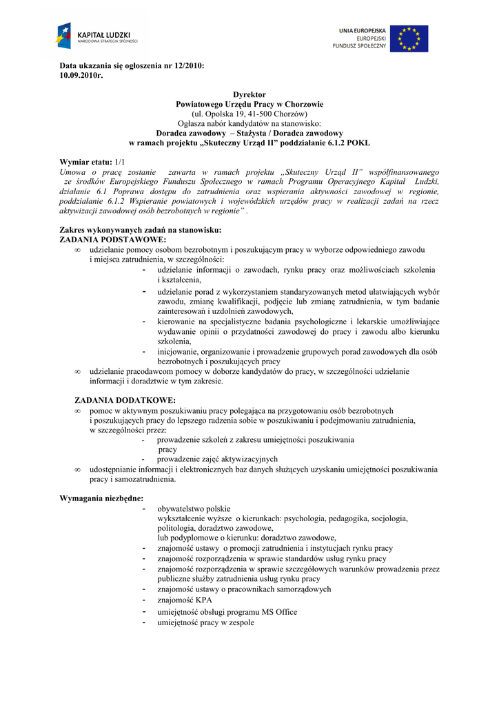 Data ukazania się ogłoszenia nr 12/2010: 10.09.2010r. Dyrektor Powiatowego Urzędu Pracy w Chorzowie (ul. Opolska 19, 41-500 Chorzów) Ogłasza nabór kandydatów na stanowisko: Doradca zawodowy – Stażysta / Doradca zawodowy w ramach projektu „Skuteczny Urząd II” poddziałanie 6.1.2 POKL Wymiar etatu: 1/1 Umowa o pracę zostanie zawarta w ramach projektu „Skuteczny Urząd II” współfinansowanego ze środków Europejskiego Funduszu Społecznego w ramach Programu Operacyjnego Kapitał Ludzki, działanie 6.1 Poprawa dostępu do zatrudnienia oraz wspierania aktywności zawodowej w regionie, poddziałanie 6.1.2 Wspieranie powiatowych i wojewódzkich urzędów pracy w realizacji zadań na rzecz aktywizacji zawodowej osób bezrobotnych w regionie” . Zakres wykonywanych zadań na stanowisku: ZADANIA PODSTAWOWE: • udzielanie pomocy osobom bezrobotnym i poszukującym pracy w wyborze odpowiedniego zawodu i miejsca zatrudnienia, w szczególności: - udzielanie informacji o zawodach, rynku pracy oraz możliwościach szkolenia i kształcenia, - udzielanie porad z wykorzystaniem standaryzowanych metod ułatwiających wybór zawodu, zmianę kwalifikacji, podjęcie lub zmianę zatrudnienia, w tym badanie zainteresowań i uzdolnień zawodowych, - kierowanie na specjalistyczne badania psychologiczne i lekarskie umożliwiające wydawanie opinii o przydatności zawodowej do pracy i zawodu albo kierunku szkolenia, - inicjowanie, organizowanie i prowadzenie grupowych porad zawodowych dla osób bezrobotnych i poszukujących pracy • udzielanie pracodawcom pomocy w doborze kandydatów do pracy, w szczególności udzielanie informacji i doradztwie w tym zakresie. ZADANIA DODATKOWE: • pomoc w aktywnym poszukiwaniu pracy polegająca na przygotowaniu osób bezrobotnych i poszukujących pracy do lepszego radzenia sobie w poszukiwaniu i podejmowaniu zatrudnienia, w szczególności przez: prowadzenie szkoleń z zakresu umiejętności poszukiwania pracy prowadzenie zajęć aktywizacyjnych • udostępnianie informacji i elektronicznych baz danych służących uzyskaniu umiejętności poszukiwania pracy i samozatrudnienia. Wymagania niezbędne: - - - obywatelstwo polskie wykształcenie wyższe o kierunkach: psychologia, pedagogika, socjologia, politologia, doradztwo zawodowe, lub podyplomowe o kierunku: doradztwo zawodowe, znajomość ustawy o promocji zatrudnienia i instytucjach rynku pracy znajomość rozporządzenia w sprawie standardów usług rynku pracy znajomość rozporządzenia w sprawie szczegółowych warunków prowadzenia przez publiczne służby zatrudnienia usług rynku pracy znajomość ustawy o pracownikach samorządowych znajomość KPA umiejętność obsługi programu MS Office umiejętność pracy w zespole Wymagania dodatkowe: - doświadczenie w prowadzeniu grupowych zajęć dydaktycznych/preferowane doświadczenie w prowadzeniu szkoleń z zakresu umiejętności poszukiwania pracy, - predyspozycje, umiejętności i doświadczenie związane z obsługą klienta w zakresie poradnictwa i orientacji zawodowej, - umiejętności i cechy osobowościowe predysponujące do wystąpień publicznych przed audytorium, - znajomość lokalnego rynku pracy, - wysoka kultura osobista, - wysokie kompetencje interpersonalne, - zdyscyplinowanie, Wymagane dokumenty i oświadczenia: - list motywacyjny, - życiorys – curriculum vitae z dokładnym opisem przebiegu pracy zawodowej, - kserokopie dokumentów potwierdzających wykształcenie – dyplom lub zaświadczenie o stanie odbytych studiów oraz inne dokumenty o posiadanych kwalifikacjach i umiejętnościach (poświadczone przez kandydata za zgodność z oryginałem) - kserokopie zaświadczeń o ukończonych kursach i szkoleniach, - kserokopie świadectw pracy (poświadczone przez kandydata za zgodność z oryginałem) - oryginał kwestionariusza osobowego dla osoby ubiegającej się o zatrudnienie, - oświadczenie kandydata: - o nie skazaniu prawomocnym wyrokiem sądu za umyślne przestępstwo ścigane z oskarżenia publicznego lub umyślne przestępstwo skarbowe, - o posiadaniu zdolności do czynności prawnych oraz korzystaniu z pełni praw publicznych, - o nieprowadzeniu działalności gospodarczej bądź o profilu prowadzonej działalności gospodarczej, Dokumenty aplikacyjne: list motywacyjny oraz CV powinny być opatrzone klauzulą: Wyrażam zgodę na przetwarzanie moich danych osobowych zawartych w mojej ofercie pracy dla potrzeb niezbędnych do realizacji procesu rekrutacji, zgodnie z ustawą z dnia 29.08.1997r. o ochronie danych osobowych. Wymagane dokumenty winny być przez kandydata własnoręcznie podpisane i złożone osobiście w sekretariacie Urzędu lub doręczone listownie w terminie do dnia 20.09.2010r. pod adresem : Powiatowy Urząd Pracy Ul. Opolska 19 41-500 Chorzów w zaklejonych kopertach z dopiskiem: „nabór na wolne stanowisko urzędnicze – Doradca zawodowy – stażysta Aplikacje, które wpłynął po wyżej określonym terminie (decyduje data wpływu do PUP), nie będą rozpatrywane. Inne informacje: Kandydaci spełniający wymogi formalne będą informowani indywidualnie o terminie testu merytorycznego i rozmów kwalifikacyjnych. Do pobrania: • Kwestionariusz osobowy osoby ubiegającej się o zatrudnienie • Wzór oświadczenia • Regulamin naboru Oferty można odebrać w terminie 3 miesięcy od dnia zakończenia procedury naboru, po tym terminie Komisja zastrzega sobie prawo do zniszczenia dokumentów. Informacja o wyniku naboru będzie umieszczana na stronie internetowej Biuletynu Informacji Publicznej PUP Chorzów www.pupchorzow.pl oraz na tablicy informacyjnej PUP przy ul. Opolskiej 19 UWAGA! Powiatowy Urząd Pracy w Chorzowie zapewnia odpowiednie warunki pracy dla osób niepełnosprawnych z lekkim lub umiarkowanym stopniem niepełnosprawności. Dodatkowe informacje można uzyskać pod numerem telefonu 032 34 97 121