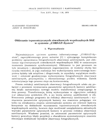 problem y opracow ania fotograficznych obserw acji satelitarnych, jest obliczenie topocentrycznych rów nikow ych w spółrzędnych SSZ w oznaczonym
