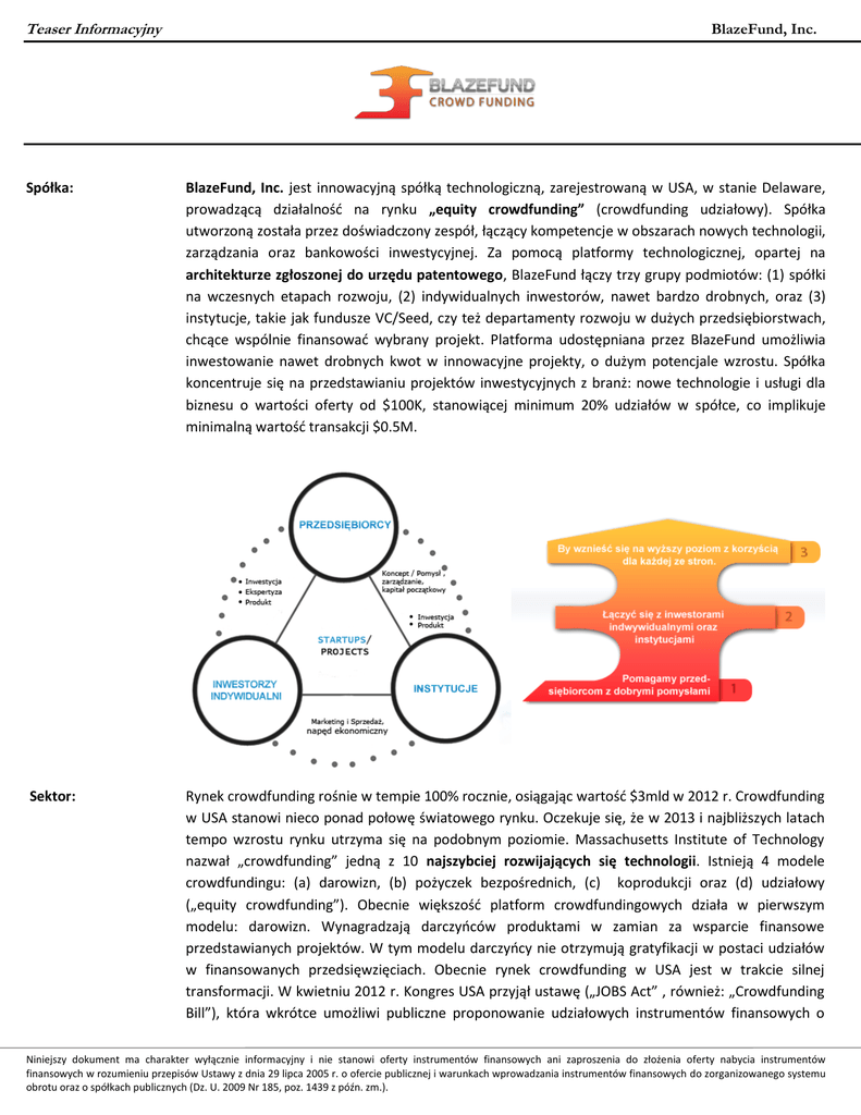 Teaser Informacyjny BlazeFund, Inc. Spółka: BlazeFund, Inc. jest innowacyjną spółką technologiczną, zarejestrowaną w USA, w stanie Delaware, prowadzącą działalność na rynku „equity crowdfunding” (crowdfunding udziałowy). Spółka utworzoną została przez doświadczony zespół, łączący kompetencje w obszarach nowych technologii, zarządzania oraz bankowości inwestycyjnej. Za pomocą platformy technologicznej, opartej na architekturze zgłoszonej do urzędu patentowego, BlazeFund łączy trzy grupy podmiotów: (1) spółki na wczesnych etapach rozwoju, (2) indywidualnych inwestorów, nawet bardzo drobnych, oraz (3) instytucje, takie jak fundusze VC/Seed, czy też departamenty rozwoju w dużych przedsiębiorstwach, chcące wspólnie finansować wybrany projekt. Platforma udostępniana przez BlazeFund umożliwia inwestowanie nawet drobnych kwot w innowacyjne projekty, o dużym potencjale wzrostu. Spółka koncentruje się na przedstawianiu projektów inwestycyjnych z branż: nowe technologie i usługi dla biznesu o wartości oferty od $100K, stanowiącej minimum 20% udziałów w spółce, co implikuje minimalną wartość transakcji $0.5M. Sektor: Rynek crowdfunding rośnie w tempie 100% rocznie, osiągając wartość $3mld w 2012 r. Crowdfunding w USA stanowi nieco ponad połowę światowego rynku. Oczekuje się, że w 2013 i najbliższych latach tempo wzrostu rynku utrzyma się na podobnym poziomie. Massachusetts Institute of Technology nazwał „crowdfunding” jedną z 10 najszybciej rozwijających się technologii. Istnieją 4 modele crowdfundingu: (a) darowizn, (b) pożyczek bezpośrednich, (c) koprodukcji oraz (d) udziałowy („equity crowdfunding”). Obecnie większość platform crowdfundingowych działa w pierwszym modelu: darowizn. Wynagradzają darczyńców produktami w zamian za wsparcie finansowe przedstawianych projektów. W tym modelu darczyńcy nie otrzymują gratyfikacji w postaci udziałów w finansowanych przedsięwzięciach. Obecnie rynek crowdfunding w USA jest w trakcie silnej transformacji. W kwietniu 2012 r. Kongres USA przyjął ustawę („JOBS Act” , również: „Crowdfunding Bill”), która wkrótce umożliwi publiczne proponowanie udziałowych instrumentów finansowych o Niniejszy dokument ma charakter wyłącznie informacyjny i nie stanowi oferty instrumentów finansowych ani zaproszenia do złożenia oferty nabycia instrumentów finansowych w rozumieniu przepisów Ustawy z dnia 29 lipca 2005 r. o ofercie publicznej i warunkach wprowadzania instrumentów finansowych do zorganizowanego systemu obrotu oraz o spółkach publicznych (Dz. U. 2009 Nr 185, poz. 1439 z późn. zm.). Teaser Informacyjny BlazeFund, Inc. wartości do $1M rocznie, poprzez zarejestrowane portale internetowe, do kwoty $1mln. Branża oczekuje, że zmiany nabiorą dużego tempa, po publikacji w 2013 r. przez SEC (U.S. Securities and Exchange Commission) wytycznych dla rejestracji portali equity crowdfundingowych. Oznacza to, że wraz z publikacją tych dyrektyw otwiera się nowy rynek z ogromnym potencjałem wzrostu. Technologia: Technologia została zaprojektowana i wdrożona, portal znajduje się pod adresem: www.blazefund.com. Spółka korzysta na wyłączność z technologii oraz systemu, który został zgłoszony do urzędu patentowego w USA („Crowdfunding private equity investment processing system and method”). Wynalazcą jest Aaron Sanders, założyciel i CEO spółki. Portal posiada szereg unikalnych funkcjonalności, m.in. wdrożony system dwutranszowego procesu inwestycyjnego, który dzieli ekspozycję inwestorów na dwie części. Przedsiębiorca w pierwszym etapie otrzyma połowę pozyskanych środków, a dopiero po zrealizowaniu planowanych działań uwalniana będzie druga transza finansowania. Obniża to ryzyko inwestycyjne i zwiększa wiarygodność emitentów. Kolejne funkcjonalności to umożliwienie inwestorom indywidualnym, którzy przeprowadzili transakcje na portalu na publikowanie niezależnych analiz, dostęp do prywatnego rynku produktów i usług tworzonych przez emitentów z rabatami dla użytkowników oraz wbudowany system uprzywilejowania do dywidendy dla inwestorów indywidualnych. Model przepływów dla użytkowników Strategia marketingowa: Celem spółki jest współpraca bezpośrednio z przedsiębiorcami, aniołami biznesu oraz funduszami Venture Capital/Seed, jak również z departamentami rozwoju w dużych przedsiębiorstwach, zainteresowanymi przedstawianiem projektów inwestycyjnych lub wyszukiwaniem możliwości inwestycyjnych. BlazeFund rozpoczyna działania promocyjne, mające na celu dotarcie do swoich grup docelowych: inwestorów indywidualnych, przedsiębiorców oraz instytucji. Ponadto, dla zwiększania oddziaływania wykorzystane zostaną działania SEO, social media oraz marketing online. Działania marketingowe skoncentrowane będą przede wszystkim na najatrakcyjniejszym rynku dla crowdfundingu udziałowego: USA. Rozwój biznesu oparty zostanie na wewnętrznym zespole Niniejszy dokument ma charakter wyłącznie informacyjny i nie stanowi oferty instrumentów finansowych ani zaproszenia do złożenia oferty nabycia instrumentów finansowych w rozumieniu przepisów Ustawy z dnia 29 lipca 2005 r. o ofercie publicznej i warunkach wprowadzania instrumentów finansowych do zorganizowanego systemu obrotu oraz o spółkach publicznych (Dz. U. 2009 Nr 185, poz. 1439 z późn. zm.). Teaser Informacyjny BlazeFund, Inc. sprzedażowym. BlazeFund otworzy również biura poza granicami USA, początkowo w Polsce i Czechach. Spółka rozpocznie działalność operacyjną w maju bieżącego roku, zaraz po opublikowaniu przez SEC wytycznych dla rejestracji portali equity crowdfunding. Model przychodowy: BlazeFund opiera swoje źródła przychodów głównie o prowizję od pozyskanego przez portal finansowania udziałowego. Średnia oczekiwana prowizja wyniesie 7% pozyskanego finansowania. Pozostałe przychody pochodzić będą z