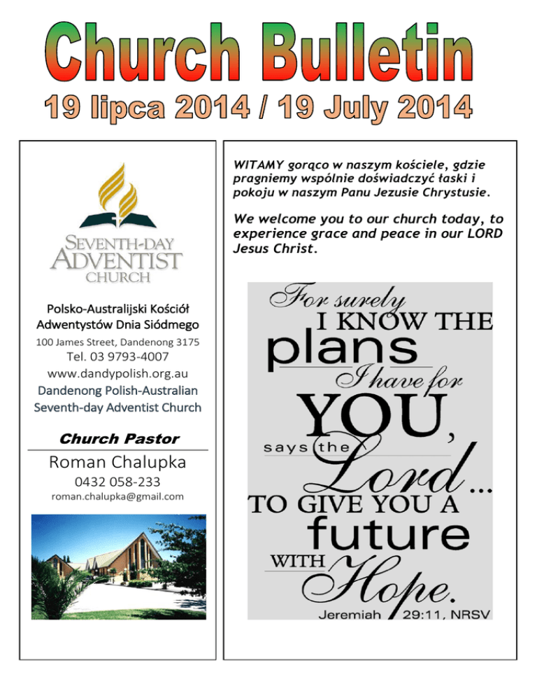 WITAMY gorąco w naszym kościele, gdzie pragniemy wspólnie doświadczyć łaski i pokoju w naszym Panu Jezusie Chrystusie. We welcome you to our church today, to experience grace and peace in our LORD Jesus Christ. Polsko-Australijski Kościół Adwentystów Dnia Siódmego 100 James Street, Dandenong 3175 Tel. 03 9793-4007 www.dandypolish.org.au Dandenong Polish-Australian Seventh-day Adventist Church Church Pastor Roman Chalupka 0432 058-233 [email protected] program 9:30 10:30 11:00 Studium Biblijne w grupach Apel Misyjny Kazanie Pr Michael Mohanu Dary: Dzisiaj: Szkolnictwo Za tydzień: Rozwój Wysp Pacyfiku Dyżury 19 lipca Prowadzenie Szk. Sob.: Sławek Postek Za tydzień: R. Widuch Koordynator Nabożeństwa: Tomek Korosteński Za tydzień: Maruška Wawruszak Tłumaczenie kazania: H. Wawruszak Informacje dla Zboru • Nasz Pastor Roman Chalupka wraz żoną przesyłają serdeczne pozdrowienia z Polski dla całego Zboru. • Seminarium prorocze z ksiąg Daniela i Objawienia. Po dwóch wyładach, które były wstępem to studium księgi Daniela, w następny wtorek, 22 lipca zaczynamy systematyczne studiowanie tej księgi. Spotkania odbywają się w każdy wtorek o godz 19. w naszym kościele. Seminarium prowadzone jest tylko w wersji angielskiej, bez tłumaczenia na język polski. Warto przyjść i znowu przestudiować stare proroctwa. Jest jeszcze kilka wolnych kompletów materiałów pomocniczych. (RCh). • Koncert dla Indii w Wantirna Polish. W sobotę, 9 sierpnia, o godz. 5.00 pm odbędzie się concert, w czasie którego wystąpi wielu lubianych wykonawców. W programie weźmie udział także dyrektor Asian Aid, Eugene de Costa, który gościć będzie w tym czasie Melbourne. Pragniemy zebrać dary, które wspomogą przyszłoroczną misję na terenie Indii. (PU) • Prośba oddziału Tabity. Organizacja Protective Child Services – Foster Care prosi o pomoc w postaci piżam w różnych wielkościach. Szczegóły u kierowniczki Tabity s. D. Wawruszak •Czy jesteśmy gotowi dopomóc? Ciągle jeszcze zbieramy fundusze na pomoc Ukrainie. Wydarzenia ostatnich dni pokazują jak w wyniku wojny cierpią zwykli ludzie. Nasza pomoc może być kroplą w morzu potrzeb ale mimo wszystko usunie kilka problemów w życiu tych najbardziej potrzebujących. Dołączny się do planów polskiej Chrześcijańska Służby Charytatywnej (ChSCh) w ich wysiłkach niesienia pomocy dla mieszkańców Zachodniej Ukrainy. Pomoc ta polega na zakupie odpowiedniego sprzętu stomatologicznego i wyjazdach dentystów do miejsc gdzie nie dociera ta służba medyczna, a ubóstwo mieszkańców nie daje szans na leczenie dentystyczne w szczególności dzieci i młodzieży. •Duży Kamp 2015 w Elmore. Prace organizacyjne i planowanie Dużego Kampu w Elmore są toku. Ze względu na finansowe ograniczenia oraz woli urzymania wysokiego poziomu prezentowanego programu Konferncja podjęła decyzję, w wyniku której uczestnicy będą musieli użyć swoje własne namioty. Jeżeli planujesz pojechać na Kamp, warto już zacząć rozglądać się za odpowiednim sprzętem. programme 9:30 10:30 11:00 Bible Study in small groups Mission Appeal Divine Service Pr Michael Mohanu Offering: Today: Education/Camping Ministry Next week: Pacific Island Advancement Duty Roster July 12 Sabbath School Leading: Sławek Postek Next week: R. Widuch Worship Coordinator: Tomek Korosteński Next week: Maruška Wawruszak Sermon translation: H. Wawruszak Church announcements •Our pastor Roman Chalupka with his wife send their warm greetings from Poland to our Church. • Prophesy Seminars – Daniel and Revelation After two introductory meetings, Prophesy Seminars will continue with systematic study of the book of Daniel. Meetings are taking place in our church every Tuesday at 7PM and are continuation of Life after Life series. Everybody wishing to refresh their knowledge about the great prophesies contained in the book invited. There are some supporting materials still available. •Concert for India in Wantirna Polish Church. On Saturday August 9, at 5 PM a charity Concert for India will take place at Wantirna PL Church. Many favourite interpreters will be performing. The Asian Aid director Eugene de Costa will also be present. During the concert a free will collection will be taken to support the next year mission in India. (PU) • Request from our Community Services department (Dorcas). Organisation known as Protective Child Services – Foster Care asked for help: needed are pyjamas of various sizes. See Dorothy Wawruszak for details •Can we help? Situation in Ukraine is getting more complicated. When you consider events that have taken place there in the last few days you can see how tragic the war is and how it affects people who have nothing to do with it. We can help by supporting the project initiated by Christian Charity Services (in Warsaw, Poland). In impoverished Western Ukraine, in Carpathian Region there is an acute shortage of medical and dental services. The Christian Charity Services decided to buy a new mobile dental unit to enable volunteer dentists provide free dental treatments especially for children and young people. We can be part of this project; please donate to this worthy cause. •BIG CAMP 2015. Planning is already under way – Camp at Elmore IS happening in 2015! Careful consideration is being given to the planning of this significant event on our church calendar and cost saving is on the agenda, tempered by a strong commitment to maintaining the quality of what is offered. As a result of such discussion, it had been decided that campers will need to provide their own tents for camp. So if you are planning to be there, make the most of the end of financial year sales and start looking for something suitable. Plan usługiwania Preaching schedule 19/07/14 pr Michael Mohanu 26/07/14 pr Paweł Ustupski 2/08/14 br Joe Paola 9/08/14 pr Ryan Vidot 15/08/14 br Emmanuel Millen Tydzień modlitwy Przypominamy, że tego