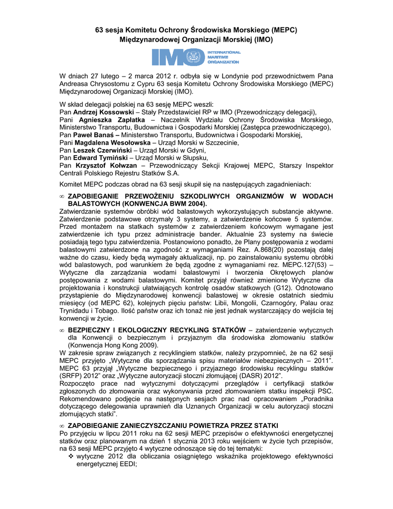 63 sesja Komitetu Ochrony Środowiska Morskiego (MEPC) Międzynarodowej Organizacji Morskiej (IMO) W dniach 27 lutego – 2 marca 2012 r. odbyła się w Londynie pod przewodnictwem Pana Andreasa Chrysostomu z Cypru 63 sesja Komitetu Ochrony Środowiska Morskiego (MEPC) Międzynarodowej Organizacji Morskiej (IMO). W skład delegacji polskiej na 63 sesję MEPC weszli: Pan Andrzej Kossowski – Stały Przedstawiciel RP w IMO (Przewodniczący delegacji), Pani Agnieszka Zapłatka – Naczelnik Wydziału Ochrony Środowiska Morskiego, Ministerstwo Transportu, Budownictwa i Gospodarki Morskiej (Zastępca przewodniczącego), Pan Paweł Banaś – Ministerstwo Transportu, Budownictwa i Gospodarki Morskiej, Pani Magdalena Wesołowska – Urząd Morski w Szczecinie, Pan Leszek Czerwiński – Urząd Morski w Gdyni, Pan Edward Tymiński – Urząd Morski w Słupsku, Pan Krzysztof Kołwzan – Przewodniczący Sekcji Krajowej MEPC, Starszy Inspektor Centrali Polskiego Rejestru Statków S.A. Komitet MEPC podczas obrad na 63 sesji skupił się na następujących zagadnieniach: • ZAPOBIEGANIE PRZEWOśENIU SZKODLIWYCH ORGANIZMÓW W WODACH BALASTOWYCH (KONWENCJA BWM 2004). Zatwierdzanie systemów obróbki wód balastowych wykorzystujących substancje aktywne. Zatwierdzenie podstawowe otrzymały 3 systemy, a zatwierdzenie końcowe 5 systemów. Przed montaŜem na statkach systemów z zatwierdzeniem końcowym wymagane jest zatwierdzenie ich typu przez administracje bander. Aktualnie 23 systemy na świecie posiadają tego typu zatwierdzenia. Postanowiono ponadto, Ŝe Plany postępowania z wodami balastowymi zatwierdzone na zgodność z wymaganiami Rez. A.868(20) pozostają dalej waŜne do czasu, kiedy będą wymagały aktualizacji, np. po zainstalowaniu systemu obróbki wód balastowych, pod warunkiem Ŝe będą zgodne z wymaganiami rez. MEPC.127(53) – Wytyczne dla zarządzania wodami balastowymi i tworzenia Okrętowych planów postępowania z wodami balastowymi. Komitet przyjął równieŜ zmienione Wytyczne dla projektowania i konstrukcji ułatwiających kontrolę osadów statkowych (G12). Odnotowano przystąpienie do Międzynarodowej konwencji balastowej w okresie ostatnich siedmiu miesięcy (od MEPC 62), kolejnych pięciu państw: Libii, Mongolii, Czarnogóry, Palau oraz Trynidadu i Tobago. Ilość państw oraz ich tonaŜ nie jest jednak wystarczający do wejścia tej konwencji w Ŝycie. • BEZPIECZNY I EKOLOGICZNY RECYKLING STATKÓW – zatwierdzenie wytycznych dla Konwencji o bezpiecznym i przyjaznym dla środowiska złomowaniu statków (Konwencja Hong Kong 2009). W zakresie spraw związanych z recyklingiem statków, naleŜy przypomnieć, Ŝe na 62 sesji MEPC przyjęto „Wytyczne dla sporządzania spisu materiałów niebezpiecznych – 2011”. MEPC 63 przyjął „Wytyczne bezpiecznego i przyjaznego środowisku recyklingu statków (SRFP) 2012” oraz „Wytyczne autoryzacji stoczni złomującej (DASR) 2012”. Rozpoczęto prace nad wytycznymi dotyczącymi przeglądów i certyfikacji statków zgłoszonych do złomowania oraz wykonywania przed złomowaniem statku inspekcji PSC. Rekomendowano podjęcie na następnych sesjach prac nad opracowaniem „Poradnika dotyczącego delegowania uprawnień dla Uznanych Organizacji w celu autoryzacji stoczni złomujących statki”. • ZAPOBIEGANIE ZANIECZYSZCZANIU POWIETRZA PRZEZ STATKI Po przyjęciu w lipcu 2011 roku na 62 sesji MEPC przepisów o efektywności energetycznej statków oraz planowanym na dzień 1 stycznia 2013 roku wejściem w Ŝycie tych przepisów, na 63 sesji MEPC przyjęto 4 wytyczne odnoszące się do tej tematyki: wytyczne 2012 dla obliczania osiągniętego wskaźnika projektowego efektywności energetycznej EEDI; wytyczne 2012 dla opracowania planu zarządzania efektywnością energetyczną statku (SEEMP); wytyczne dla przeglądu i certyfikacji wskaźnika projektowego efektywności energetycznej EEDI 2012; wytyczne dla obliczania linii odniesienia do stosowania ze wskaźnikiem projektowym efektywności energetycznej EEDI. Zgodnie z interpretacją prawidła 5.4.4 Załącznika VI MARPOL – weryfikacja Planu SEEMP następuje dla celów wydania Świadectwa o efektywności energetycznej statku, a nie świadectwa o zapobieganiu zanieczyszczaniu powietrza przez statek. Następujące problemy będą rozstrzygane w dalszych pracach MEPC: minimalna moc/prędkość; współczynniki redukcji w tabeli 1 Prawidła 21 Załącznika VI MARPOL; normy dla prób morskich; normy dla prób modelowych w basenach; normy dla standardowego wykonania kadłuba i śruby; wprowadzenie przepisów o efektywności energetycznej dla statków ro-ro i promów z napędami niekonwencjonalnymi; linie odniesienia dla statków LNG/LPG. • KODEKS TECHNICZNY TLENKÓW AZOTU DLA SILNIKÓW WYSOKOPRĘśNYCH (NOx Code) – ZMIANY Zmiany w Kodeksie NOx 2008 dotyczą certyfikacji okrętowych silników spalinowych wyposaŜonych w systemy selektywnej redukcji katalitycznej SCR. Pozwalają one na stosowanie „Schematu B” (uŜycie modelowania i symulacji w certyfikacji silników okrętowych) zgodnie z Wytycznymi dla SCR (rez.MEPC.198(62)). Zmiany wejdą w Ŝycie w dniu 1 sierpnia 2013 roku. • ZMNIEJSZANIE EMISJI GHG ZE STATKÓW Mimo dyskusji na temat mechanizmów rynkowych dla ograniczania emisji gazów cieplarnianych nie został osiągnięty konsensus w tej sprawie. Na 64 sesji MEPC mają być rozpatrzone sprawy: rezolucji na temat współpracy technicznej i transferu technologii waŜnej dla krajów rozwijających się; zakresu działania dla dalszej oceny proponowanych mechanizmów rynkowych dla Ŝeglugi międzynarodowej. Podkreślono, Ŝe współczynnik projektowy efektywności energetycznej statków EEDI ma zastosowanie tylko dla nowych statków. • MORZE BAŁTYCKIE OBSZAREM SPECJALNYM W ZAŁĄCZNIKU IV MARPOL – WYPOSAśENIE W OCZYSZCZALNIE ŚCIEKÓW NOWEGO TYPU Dyskutowano na temat zapewnienia dostępności do odpowiednich i niedrogich oczyszczalni ścieków dla potrzeb wyposa