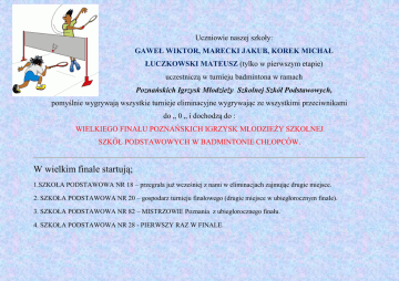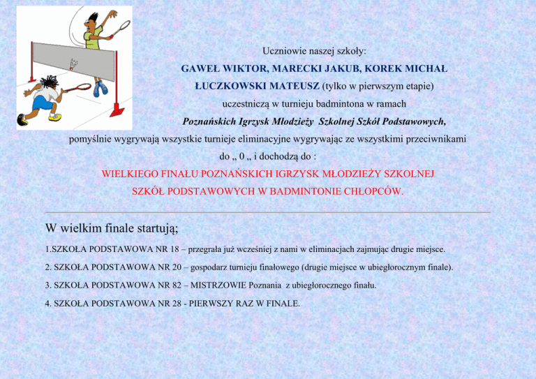 Uczniowie naszej szkoły: GAWEŁ WIKTOR, MARECKI JAKUB, KOREK MICHAŁ ŁUCZKOWSKI MATEUSZ (tylko w pierwszym etapie) uczestniczą w turnieju badmintona w ramach Poznańskich Igrzysk Młodzieży Szkolnej Szkół Podstawowych, pomyślnie wygrywają wszystkie turnieje eliminacyjne wygrywając ze wszystkimi przeciwnikami do „ 0 „ i dochodzą do : WIELKIEGO FINAŁU POZNAŃSKICH IGRZYSK MŁODZIEŻY SZKOLNEJ SZKÓŁ PODSTAWOWYCH W BADMINTONIE CHŁOPCÓW. W wielkim finale startują; 1.SZKOŁA PODSTAWOWA NR 18 – przegrała już wcześniej z nami w eliminacjach zajmując drugie miejsce. 2. SZKOŁA PODSTAWOWA NR 20 – gospodarz turnieju finałowego (drugie miejsce w ubiegłorocznym finale). 3. SZKOŁA PODSTAWOWA NR 82 – MISTRZOWIE Poznania z ubiegłorocznego finału. 4. SZKOŁA PODSTAWOWA NR 28 - PIERWSZY RAZ W FINALE. PIERWSZY POJEDYNEK ZE SZKOŁA PODSTAWOWĄ NR 20 WYGRYWAMY GŁADKO DO „ 0 „ BEZ ŻADNYCH PROBLEMÓW I JESTEŚMY W FINALE . Teraz finał, nasi przeciwnicy Szkoła Podstawowa nr 82 są naprawdę doskonali i grają świetnie. Czy możemy ich pokonać? Nasz opiekun pan Marek Trepka udziela nam wskazówek – mówi że z każdym można wygrać, przytacza nam historie wielkich zwycięzców olimpijskich, motywuje nas, udziela ostatnich porad taktycznych . Gramy – Jakub Marecki po pasjonującym pojedynku przegrywa bardzo wyraźnie chociaż walczy bardzo ambitne. Drugi pojedynek wygrywa Wiktor Gaweł i jest" 1 do 1" Teraz gra podwójna, która wygrywamy do „0” Ponownie do walki staje nasz „ as atutowy” Jakub Marecki walczy dzielnie i wygrywa dwa sety WYGRYWAMY ZE SZKOŁĄ PODSTAWOWĄ NR 82 "3 DO 2" JESTEŚMY MISTRZAMI POZNANIA !!!!!!! BRAWO – JAKUB MARECKI, WIKTOR GAWEŁ, MICHAŁ KOREK MATEUSZ ŁUCZKOWSKI