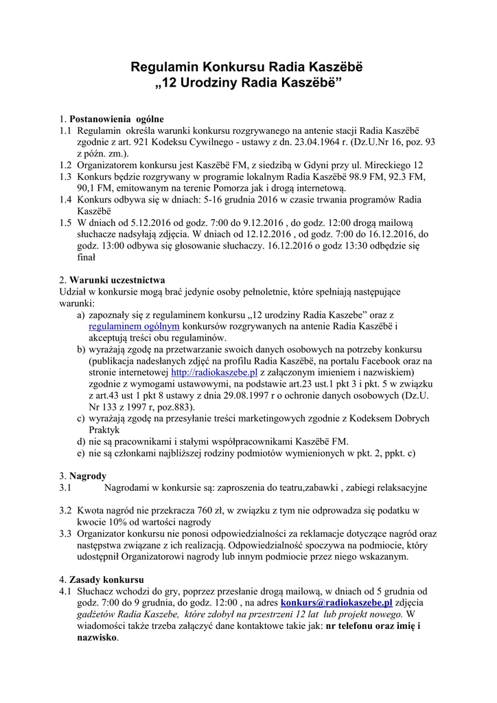 Regulamin Konkursu Radia Kaszëbë „12 Urodziny Radia Kaszëbë” 1. Postanowienia ogólne 1.1 Regulamin określa warunki konkursu rozgrywanego na antenie stacji Radia Kaszëbë zgodnie z art. 921 Kodeksu Cywilnego - ustawy z dn. 23.04.1964 r. (Dz.U.Nr 16, poz. 93 z późn. zm.). 1.2 Organizatorem konkursu jest Kaszëbë FM, z siedzibą w Gdyni przy ul. Mireckiego 12 1.3 Konkurs będzie rozgrywany w programie lokalnym Radia Kaszëbë 98.9 FM, 92.3 FM, 90,1 FM, emitowanym na terenie Pomorza jak i drogą internetową. 1.4 Konkurs odbywa się w dniach: 5-16 grudnia 2016 w czasie trwania programów Radia Kaszëbë 1.5 W dniach od 5.12.2016 od godz. 7:00 do 9.12.2016 , do godz. 12:00 drogą mailową słuchacze nadsyłają zdjęcia. W dniach od 12.12.2016 , od godz. 7:00 do 16.12.2016, do godz. 13:00 odbywa się głosowanie słuchaczy. 16.12.2016 o godz 13:30 odbędzie się finał 2. Warunki uczestnictwa Udział w konkursie mogą brać jedynie osoby pełnoletnie, które spełniają następujące warunki: a) zapoznały się z regulaminem konkursu „12 urodziny Radia Kaszebe” oraz z regulaminem ogólnym konkursów rozgrywanych na antenie Radia Kaszëbë i akceptują treści obu regulaminów. b) wyrażają zgodę na przetwarzanie swoich danych osobowych na potrzeby konkursu (publikacja nadesłanych zdjęć na profilu Radia Kaszëbë, na portalu Facebook oraz na stronie internetowej http://radiokaszebe.pl z załączonym imieniem i nazwiskiem) zgodnie z wymogami ustawowymi, na podstawie art.23 ust.1 pkt 3 i pkt. 5 w związku z art.43 ust 1 pkt 8 ustawy z dnia 29.08.1997 r o ochronie danych osobowych (Dz.U. Nr 133 z 1997 r, poz.883). c) wyrażają zgodę na przesyłanie treści marketingowych zgodnie z Kodeksem Dobrych Praktyk d) nie są pracownikami i stałymi współpracownikami Kaszëbë FM. e) nie są członkami najbliższej rodziny podmiotów wymienionych w pkt. 2, ppkt. c) 3. Nagrody 3.1 Nagrodami w konkursie są: zaproszenia do teatru,zabawki , zabiegi relaksacyjne 3.2 Kwota nagród nie przekracza 760 zł, w związku z tym nie odprowadza się podatku w kwocie 10% od wartości nagrody 3.3 Organizator konkursu nie ponosi odpowiedzialności za reklamacje dotyczące nagród oraz następstwa związane z ich realizacją. Odpowiedzialność spoczywa na podmiocie, który udostępnił Organizatorowi nagrody lub innym podmiocie przez niego wskazanym. 4. Zasady konkursu 4.1 Słuchacz wchodzi do gry, poprzez przesłanie drogą mailową, w dniach od 5 grudnia od godz. 7:00 do 9 grudnia, do godz. 12:00 , na adres [email protected] zdjęcia gadżetów Radia Kaszebe, które zdobył na przestrzeni 12 lat lub projekt nowego. W wiadomości także trzeba załączyć dane kontaktowe takie jak: nr telefonu oraz imię i nazwisko. 4.2 Spośród nadesłanych zdjęć jury (patrz pkt. 5) wybiera od 5 do 10 najciekawszych zdjęć 4.3 W dniach od 12.12.2016, od godz. 7:00 do 16.12.2016 , do godz. 13:00 odbywać się będzie plebiscyt. Słuchacze drogą SMS głosują na wybrane przez jury zdjęcia Szczegółowe informacje o treści i numerze SMS oraz zdjęcia ogrodów z imionami i nazwiskami ich właścicieli udostępnione będą na stronie http://radiokaszebe.pl – tam też na bieżąco zobaczyć będzie można ile głosów procentowo oddanych jest na dany ogród. Głosy oddawane są SMS'owo, na numer 71601 (koszt 1,23 zł z VAT). W treści wpisujemy KASZEBE.numer przyporządkowany danemu zdjęciu np. KASZEBE.99). Nie ma ograniczenia co do liczby wysłanych SMS'ów. 4.4 16 grudnia o godz. 13:30 odbędzie się finał. Podczas wejścia antenowego prezenter poinformuje słuchacza, którego zdjęcie otrzymało największą ilość głosów o wygranej. Prezenter także poinformuje kto otrzymuje drugą i trzecią nagrodę. 4.5 Jednej osobie może być przyznana tylko jedna nagroda, niezależnie od ilości zgłoszeń. 4.6 Nagrody będą odbierane w siedzibie Radia Kaszebe Gdynia, Mireckiego 12 w terminie do 14 dni od wygranej w konkursie, po upływie wyznaczonego terminu nagrody przepadają. 4.7 Przy odbiorze nagrody należy okazać dokument potwierdzający tożsamość. 4.8 Organizator konkursu nie przewiduje możliwości zamiany nagrody na inną. 5. Jury 5.1 Skład jury: Przewodniczący - Agnieszka Łukasik Sekretarz - Sylwia Bartosik Członkowie - Dominik Lewicki 5.2 Werdykt jury jest werdyktem ostatecznym w zakresie wyników akcji. 5.3 Jury potwierdza zgodność przeprowadzenia akcji z regulaminem. 6. Postępowanie reklamacyjne 6.1 Wszelkie zastrzeżenia dotyczące przebiegu akcji, należy składać organizatorowi na piśmie w terminie nie dłuższym niż 14 dni roboczych od daty jego zakończenia. 6.2 W przypadku przesłania reklamacji złożonej za pośrednictwem poczty decyduje data stempla pocztowego. 6.3 Złożone przez uczestników reklamacje będą rozpatrywane przez Organizatora niezwłocznie, jednakże nie później niż w terminie 14 dni od daty złożenia reklamacji. 6.4 Zainteresowani uczestnicy zostaną powiadomieni o rozpatrzeniu reklamacji pocztą, najpóźniej w ciągu 14 dni od daty rozpatrzenia reklamacji na piśmie przez Organizatora. 7. Postanowienia dodatkowe 7.1 Organizator konkursu nie ponosi odpowiedzialności za: a) udział w konkursie przez osoby nieuprawnione b) udział w konkursie niezgodnie z postanowieniami niniejszego regulaminu i szkody tym spowodowane c) usługi telekomunikacyjne, z których korzystać będą uczestnicy akcji d) problemy w funkcjonowaniu konkursu, jeżeli nastąpiły one wskutek zdarzeń, których Organizator przy zachowaniu należytej staranności nie był w stanie przewidzieć, lub którym nie mógł zapobiec, w szczególności w przypadku problemów związanych ze zdarzeniami losowymi o charakterze siły wyższej 7.3 Nad prawidłowością przebiegu akcji i jej zgodnością z regulaminem czuwa kierownictwo Kaszëbë FM