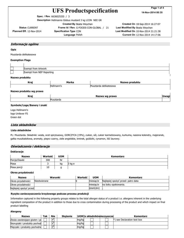 Page 1 of 4 UFS Productspecification 14-Nov-2014 00:35 Spec. / Rev. 66360253IS / 3 Description Hellmanns Globus mustard 3 kg LCON NEE GR Created By Frame Id / Rev. Specification Type Language Status CURRENT Planned Eff. 12-Nov-2014 Beata Weychan G-FOODS-CON-GLOBAL / 21 CON Polish Created On Last Modified By Last Modified On Current On 18-Sep-2014 16:27:07 Beata Weychan 10-Nov-2014 21:21:38 12-Nov-2014 14:17:06 Informacje ogólne Opis Musztarda delikatesowa Exemption Flags Exempt from Artwork Exempt from NEP Reporting Nazwa produktu Kraj Marka Nazwa produktu Hellmann's Musztarda delikatesowa Nazwa produktu wg prawa Kraj Nazwa wg prawa Uwagi Musztarda Symbole/Loga/Banery i znaki Logo Hellmann's logo Unilever FS Green dot Lista składników Lista składników PL: Musztarda. Składniki: woda, ocet spirytusowy, GORCZYCA (19%), cukier, sól, cukier karmelizowany, kurkuma, nasiona kolendry, majeranek, gałka muszkatołowa, aromaty, pieprz czarny, ziele angielskie, kminek, goździki, cynamon, liść laurowy. Oświadczenia i deklaracje Deklaracje Nazwa Porcje/Dawki Masa Masa porcji Wartość 300 3 10 UOM Nr kg g Komentarz . 3 kg e Okres przydatności Nazwa Warunki Nieotwierane Okres przydatności Okres przydatności Najlepiej spożyć przed Wartość 9 UOM miesiąc/e miesiąc/e dzień(dni) Komentarz Najlepiej spożyć przed: patrz data na boku opakowania. . Ryzyko zanieczyszczenia krzyżowego podczas procesu produkcji Information captured in the following property groups relates to the total allergen status of a product i.e. allergens inherent in the underlying ingredient composition of the product in addition to those due to cross contamination during processing of the product and which impact on final product labelling Alergeny Nazwa Tak Nie Stężenie Zboża zawierające gluten i produkty pochodne Skorupiaki i produkty pochodne Mięczaki i produkty pochodne UOMZe składników Zanieczyszczenie Komentarz mg/kg *) see Declaration text box mg/kg mg/kg Page 2 of 4 UFS Productspecification 14-Nov-2014 00:35 Spec. / Rev. 66360253IS / 3 Description Hellmanns Globus mustard 3 kg LCON NEE GR Created By Frame Id / Rev. Specification Type Language Status CURRENT Planned Eff. 12-Nov-2014 Beata Weychan G-FOODS-CON-GLOBAL / 21 CON Polish Created On Last Modified By Last Modified On Current On 18-Sep-2014 16:27:07 Beata Weychan 10-Nov-2014 21:21:38 12-Nov-2014 14:17:06 Alergeny [Continued] Nazwa Tak Nie Stężenie Jaja i ich pochodne Ryby/Produkty rybne Orzeszki ziemne/Produkty z orzeszków ziemnych Soja/Produkty sojowe Mleko/Produkty mleczne Orzechy/Produkty z orzechów Nasiona sezamu/Produkty z nasion sezamu Siarczyny (=> 10mg/kg) Seler Musztarda/Produkty z gorczycy Łubin i produkty pochodne UOMZe składników Zanieczyszczenie mg/kg mg/kg mg/kg mg/kg mg/kg mg/kg mg/kg mg/kg mg/kg mg/kg mustard seeds mg/kg Komentarz Diety - zagwarantowane Nazwa Wegańska Lakto-ovo-wegetariańska Tak Nie Komentarz Tak Nie Komentarz Produkt wolny od: Nazwa Napromienianie Mięso Alkohol Traces from spirit vinegar Deklaracje . Oświadczenia Nazwa Oświadczenie Oświadczenie Oświadczenie Oświadczenie Oświadczenie Oświadczenie Oświadczenie Oświadczenie Oświadczenie Oświadczenie Oświadczenie Oświadczenie Oświadczenie Oświadczenie Oświadczenie Opis 1. 2. 3. 4. 5. 6 (FoP icon) PL text: Bez konserwantów 7. 8. 9. 10. 11. 12. 13. 14. 15. Oświadczenia / Orzeczenia (FoP- serving suggestion) Propozycja podania "MKG text": IDEALNA DO DAŃ MIĘSNYCH, Z GRILLA, SOSÓW I DIPÓW Uwagi Page 3 of 4 UFS Productspecification 14-Nov-2014 00:35 Spec. / Rev. 66360253IS / 3 Description Hellmanns Globus mustard 3 kg LCON NEE GR Status CURRENT Planned Eff. 12-Nov-2014 Created By Frame Id / Rev. Specification Type Language Beata Weychan G-FOODS-CON-GLOBAL / 21 CON Polish Created On Last Modified By Last Modified On Current On 18-Sep-2014 16:27:07 Beata Weychan 10-Nov-2014 21:21:38 12-Nov-2014 14:17:06 Instrukcje Sposób przygotowania . Warunki przechowywania Przechowywać w suchym, chłodnym i zaciemnionym miejscu, po otwarciu w lodówce. Instrukcje bezpieczeństwa . Utylizacja . Informacja żywieniowa Informacje żywieniowe Wartość odżywcza 100 g Energia Tłuszcz w tym kw. tłuszczowe nasycone Węglowodany w tym cukry Białko Sól Dodatkowe informacje . Informacje żywieniowe na opakowanie [Produkt wprowadzany do obrotu] Inf. żywieniowe na produkt wprowadzany do obrotu Nazwa Wielkość porcji 10 G Wartość Wartości Energia Energia Białko Węglowodany Węglowodany w tym Tłuszcz Tłuszcz w tym Sól Cecha kJ kcal Cukry Kwasy nasycone as NaCl Składniki odżywcze Energia Energia Białko kJ kcal - Cecha na 100 UOM g produktu wprowadzanegona do100 obrotu ml produktu kJ 480 kcal 110 g 5 g 9 g 4,5 g 6 g <0,5 g 2,1 Wskazane dzienne spożycie 8400 2000 50 na porcję 50 10 <0,5 0,9 <0,5 0,6 <0,5 0,21 % <1 <1 1 oznaczenie GDA GDA GDA Page 4 of 4 UFS Productspecification 14-Nov-2014 00:35 Spec. / Rev. 66360253IS / 3 Description Hellmanns Globus mustard 3 kg LCON NEE GR Status CURRENT Planned Eff. 12-Nov-2014 Składniki odżywcze Węglowodany Węglowodany w tym Tłuszcz Tłuszcz w tym Sól Created By Frame Id / Rev. Specification Type Language Cecha Cukry Kwasy nasycone as NaCl Beata Weychan G-FOODS-CON-GLOBAL / 21 CON Polish Wskazane dzienne spożycie 260 90 70 20 6 * % referencyjnej wartości spożycia dla przeciętnej osoby dorosłej (8400 kJ/2000 kcal) Informacje żywieniowe na opakowanie [Na przygotowany produkt] * % referencyjnej wartości spożycia dla przeciętnej osoby dorosłej (8400 kJ/2000 kcal) Dane kontaktowe Kontakt www.ufs.com Unilever Food Solutions Unilever Polska Sp. z o.o. Al. Jerozolimskie 134 02-305 Warszawa (phone symbol) 800 66 11 11 (pon.-pt. 8:00-16:00) Informacje lokalne EAN CU: 8712100378676 18-Sep-2014 16:27:07 Beata Weychan 10-Nov-2014 21:21:38 12-Nov-2014 14:17:06 % <1 <1 <1 <1 3 Reference Intake Reference Intake Created On Last Modified By Last Modified On Current On oznaczenie GDA GDA GDA GDA GDA
