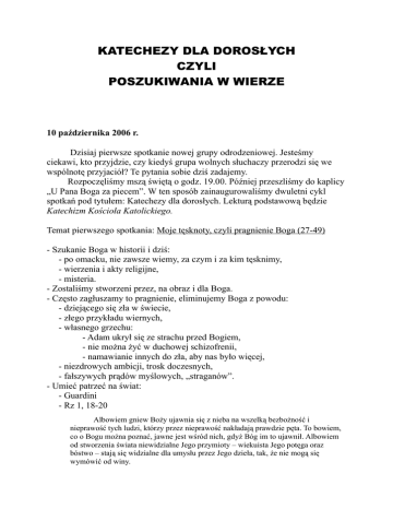 KATECHEZY DLA DOROSŁYCH CZYLI POSZUKIWANIA W WIERZE 10 października 2006 r. Dzisiaj pierwsze spotkanie nowej grupy odrodzeniowej. Jesteśmy ciekawi, kto przyjdzie, czy kiedyś grupa wolnych słuchaczy przerodzi się we wspólnotę przyjaciół? Te pytania sobie dziś zadajemy. Rozpoczęliśmy mszą świętą o godz. 19.00. Później przeszliśmy do kaplicy „U Pana Boga za piecem”. W ten sposób zainaugurowaliśmy dwuletni cykl spotkań pod tytułem: Katechezy dla dorosłych. Lekturą podstawową będzie Katechizm Kościoła Katolickiego. Temat pierwszego spotkania: Moje tęsknoty, czyli pragnienie Boga (27-49) - Szukanie Boga w historii i dziś: - po omacku, nie zawsze wiemy, za czym i za kim tęsknimy, - wierzenia i akty religijne, - misteria. - Zostaliśmy stworzeni przez, na obraz i dla Boga. - Często zagłuszamy to pragnienie, eliminujemy Boga z powodu: - dziejącego się zła w świecie, - złego przykładu wiernych, - własnego grzechu: - Adam ukrył się ze strachu przed Bogiem, - nie można żyć w duchowej schizofrenii, - namawianie innych do zła, aby nas było więcej, - niezdrowych ambicji, trosk doczesnych, - fałszywych prądów myślowych, „straganów”. - Umieć patrzeć na świat: - Guardini - Rz 1, 18-20 Albowiem gniew Boży ujawnia się z nieba na wszelką bezbożność i nieprawość tych ludzi, którzy przez nieprawość nakładają prawdzie pęta. To bowiem, co o Bogu można poznać, jawne jest wśród nich, gdyż Bóg im to ujawnił. Albowiem od stworzenia świata niewidzialne Jego przymioty – wiekuista Jego potęga oraz bóstwo – stają się widzialne dla umysłu przez Jego dzieła, tak, że nie mogą się wymówić od winy. - Sob. Wat. I 17 października 2006 r. Objawienie, czyli tęsknota Boga za człowiekiem (50-73) - Próbujemy odpowiedzieć sobie na podstawowe pytania dotyczące naszego życia. - Nosimy w sobie tęsknoty. - Matka – dziecko, poszukiwania w wierze. - Objawienie dane Abramowi, przymierze i zmiana imienia na Abraham. - Mojżesz i początek Narodu Wybranego. - Znaczenie słowa Chrystus: - nowe przymierze, - jednoczenie tego, co od początku było jednością, - znaczenie zmartwychwstania w objawieniu. 24 października 2006 r. Pismo święte i Tradycja (74-100) - Objawienie – przymierze. - Przekazywanie Objawienia: - ustne, - przykładem, - instytucje, - celebracja sakramentów. - Przekazywanie pisemne. - Sukcesja apostolska, także w nauczaniu. - Asystencja Ducha Świętego. - Pismo święte – Tradycja: - pisanie (która wersja Księgi jest natchniona), - kanon ksiąg świętych, - listy matki, - protestanci i perspektywa 15 wieków. - Dogmaty: - zapobieganie herezjom, - precyzowanie wiary: - Niepokalane Poczęcie NMP (1854 r., Pius IX). 7 listopada 2006 r. Jak czytać Biblię? (101-141) - Żydzi: - klimat rodzinny (dziadek...), - czy Żyd może być ateistą? - Brandstaetter, Krąg biblijny. - Kościół: - Bóg wypowiada siebie, - Pismo święte – Najświętszy Sakrament, To przede wszystkim miejcie na uwadze, że żadne proroctwo Pisma nie jest dla prywatnego wyjaśniania. Nie z woli bowiem ludzkiej zostało kiedyś przyniesione proroctwo, ale kierowani Duchem Świętym mówili od Boga święci ludzie. 2 P 1, 20-21 - badania naukowe, - całe Pismo święte jest natchnione - nie można przebierać, - nie jest do prywatnego wyjaśniania. - Jak czytać? - zachować naukę Kościoła, - całe bogactwo znaczeń. 14 listopada 2006 r. Wiara odpowiedzią człowieka na Boże objawienie (142-184) - Model drogi: szukanie, objawienie, wiara. - Wiara jest łaską: - po zmartwychwstaniu Chrystus każdemu udziela łaski wiary, - Maria przy grobie, uczniowie z Emaus, Tomasz Apostoł, - Chrystus na nowo gromadzi, ale już w wierze. - Kryzysy wiary: pytania, wątpliwości. - Rozwój wiary: wejście na górę Karmel. - Uwierzyć i zawierzyć. 21 listopada 2006 r. Wiara w jednego Boga. Jakie jest imię Pana Boga? (185-231) Czytanie tekstów biblijnych, aby w nich znaleźć odpowiedź, kim jest Pan Bóg, jakie jest Jego imię. - Co znaczy znać imię Boga? - znaczenie imienia u ludzi, - pokaż, gdzie mieszkasz. Dwaj uczniowie usłyszeli, jak [Jan] mówił, i poszli za Jezusem. Jezus zaś odwróciwszy się i ujrzawszy, że oni idą za Nim, rzekł do nich? „Czego szukacie?” Oni powiedzieli do Niego: „Rabbi! – to znaczy: Nauczycielu – gdzie mieszkasz?” Odpowiedział im: „Chodźcie, a zobaczycie”. J 1, 37-39a - Jakie jest imię Boga? - Bóg ma imię, jest kimś, nie anonimową siłą, - kim jest (kilka przymiotów). Mojżesz zaś rzekł do Boga: „Oto pójdę do Izraelitów i powiem im: Bóg ojców naszych posłał mnie do was. Lecz gdy oni mnie zapytają, jakie jest Jego imię, to cóż im mam powiedzieć?” Odpowiedział Bóg Mojżeszowi: „JESTEM, KTÓRY JESTEM”. I dodał: „Tak powiesz synom Izraela: JESTEM posłał mnie do was”. I mówił dalej Bóg do Mojżesza: „Tak powiesz Izraelitom: «JESTEM, Bóg ojców waszych, Bóg Abrahama, Bóg Izaaka i Bóg Jakuba posłał mnie do was. To jest imię moje na wieki i to jest moje zawołanie na najdalsze pokolenia»”. Wj 3, 13-15 Przeminą one [niebo i ziemia, przyp.], Ty zaś pozostaniesz. I całe one jak szata się zestarzeją: Ty zmieniasz je jak odzienie i ulegają zmianie, Ty zaś jesteś zawsze ten sam i lata Twoje nie mają końca. Ps 102, 27-28 A wreszcie rzekł Bóg: „Uczyńmy człowieka na Nasz obraz, podobnego Nam. Niech panuje nad rybami morskimi, nad ptactwem powietrznym, nad bydłem, nad ziemią i nad wszystkimi zwierzętami pełzającymi po ziemi!” Rdz 1, 26 Któż będzie się wyróżniał? Cóż masz, czego byś nie otrzymał? A jeśliś otrzymał, to czemu się chełpisz, tak jakbyś nie otrzymał. 1 Kor 4, 7 A On powiedział: „Ja będę z tobą. Znakiem zaś dla ciebie, że Ja cię posłałem, będzie to, że po wyprowadzeniu tego ludu z Egiptu oddacie cześć Bogu na tej górze”. Wj 3, 12 Powiedział jeszcze Pan: „Jestem Bogiem ojca twego, Bogi