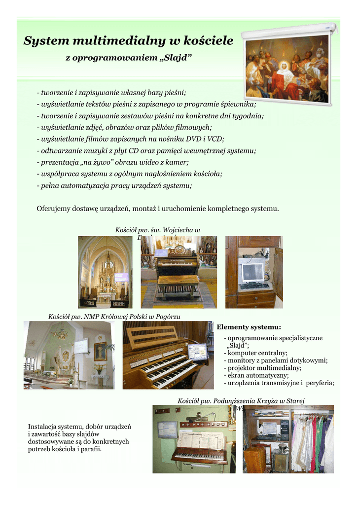 System multimedialny w kościele z oprogramowaniem „Slajd” - tworzenie i zapisywanie własnej bazy pieśni; - wyświetlanie tekstów pieśni z zapisanego w programie śpiewnika; - tworzenie i zapisywanie zestawów pieśni na konkretne dni tygodnia; - wyświetlanie zdjęć, obrazów oraz plików filmowych; - wyświetlanie filmów zapisanych na nośniku DVD i VCD; - odtwarzanie muzyki z płyt CD oraz pamięci wewnętrznej systemu; - prezentacja „na żywo” obrazu wideo z kamer; - współpraca systemu z ogólnym nagłośnieniem kościoła; - pełna automatyzacja pracy urządzeń systemu; Oferujemy dostawę urządzeń, montaż i uruchomienie kompletnego systemu. Kościół pw. św. Wojciecha w Dankowicach Kościół pw. NMP Królowej Polski w Pogórzu Elementy systemu: - oprogramowanie specjalistyczne „Slajd”; - komputer centralny; - monitory z panelami dotykowymi; - projektor multimedialny; - ekran automatyczny; - urządzenia transmisyjne i peryferia; Kościół pw. Podwyższenia Krzyża w Starej Wsi Instalacja systemu, dobór urządzeń i zawartość bazy slajdów dostosowywane są do konkretnych potrzeb kościoła i parafii. Oferowany system multimedialny stanowi wszechstronne i proste w obsłudze narzędzie, pomocne w przebiegu liturgii i pracy duszpasterskiej w parafii. Oprogramowanie uwzględnia specyfikę i wymagania wynikające z przeznaczenia systemu. Kilka stanowisk sterowania i wizualizacji z monitorami dotykowymi oraz przejrzysty układ graficzny panelu sterowania sprawiają, że obsługa systemu jest wyjątkowo prosta. Widok panelu sterowania na monitorze Zainstalowany na kontuarze organów monitor z panelem dotykowym oraz intuicyjne oprogramowanie, dają organiście pełną swobodę doboru i wyświetlania pieśni, odtwarzania muzyki oraz korzystania z pozostałych funkcji programu, jednocześnie stanowiąc pomocne narzędzie (szybkie wyszukiwanie i prezentowanie na monitorze wybranych tekstów). Pod nieobecność organisty, teksty pieśni mogą być wyświetlane przez ministranta lub kościelnego, wykorzystujących przygotowane i zapisane wcześniej w pamięci systemu zestawy. Obsługa odbywa się wówczas poprzez zlokalizowany w zakrystii monitor dotykowy. Program „Slajd” jest wyposażony w bazę tekstów pieśni, podzielonych na kategorie i okresy liturgiczne, analogicznie jak w powszechnie stosowanych śpiewnikach kościelnych. Program wyposażony został w „Edytor użytkownika”, dający możliwość tworzenia i formatowania własnych slajdów do wyświetlenia doraźnego lub zapisania ich do bazy. Konstrukcja techniczna systemu, dobór sprzętu oraz systemu instalacji, dostosowywane są do warunków kościoła z punktu widzenia jego przestrzeni i stylu. Jesteśmy otwarci na propozycje tekstów, które powinny znaleźć się w „Bazie głównej”, jak też uwagi i sugestie odnośnie funkcjonowania systemu i ewentualnych jego modyfikacji. Oferujemy bezpłatne szkolenia użytkowników w zakresie sprawnego i pełnego wykorzystywania systemu. System jest objęty wsparciem technicznym, w ramach którego oferujemy zarówno pomoc techniczną jak i aktualizacje oprogramowania i tekstów w „Bazie głównej” programu. Zrealizowane instalacje objęte są gwarancją na okres 12 miesięcy. W tym okresie wszelkie awarie nie wynikające z winy użytkownika usuwane będą bezpłatnie. 43-331 Dankowice ul. Krasińskiego 15 Kontakt: Stanisław Bieroński - 502 250 530 Grzegorz Bieroński - 500 127 217 e-mail: [email protected]