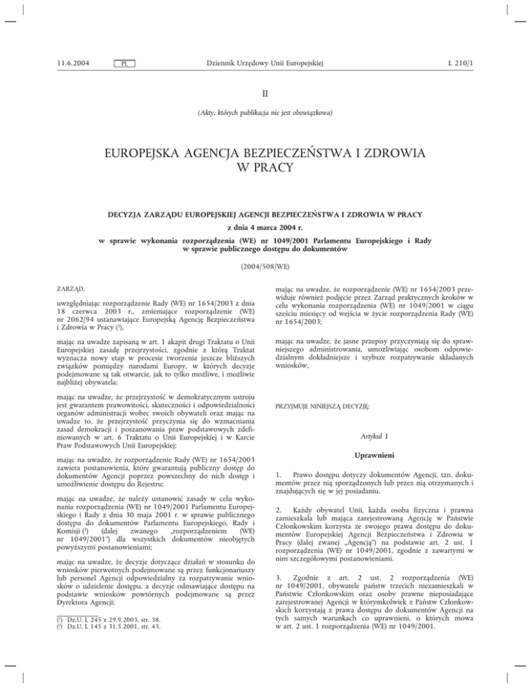 11.6.2004 PL Dziennik Urzędowy Unii Europejskiej L 210/1 II (Akty, których publikacja nie jest obowiązkowa) EUROPEJSKA AGENCJA BEZPIECZEŃSTWA I ZDROWIA W PRACY DECYZJA ZARZĄDU EUROPEJSKIEJ AGENCJI BEZPIECZEŃSTWA I ZDROWIA W PRACY z dnia 4 marca 2004 r. w sprawie wykonania rozporządzenia (WE) nr 1049/2001 Parlamentu Europejskiego i Rady w sprawie publicznego dostępu do dokumentów (2004/508/WE) ZARZĄD, uwzględniając rozporządzenie Rady (WE) nr 1654/2003 z dnia 18 czerwca 2003 r., zmieniające rozporządzenie (WE) nr 2062/94 ustanawiające Europejską Agencję Bezpieczeństwa i Zdrowia w Pracy (1), mając na uwadze zapisaną w art. 1 akapit drugi Traktatu o Unii Europejskiej zasadę przejrzystości, zgodnie z którą Traktat wyznacza nowy etap w procesie tworzenia jeszcze bliższych związków pomiędzy narodami Europy, w których decyzje podejmowane są tak otwarcie, jak to tylko możliwe, i możliwie najbliżej obywatela; mając na uwadze, że przejrzystość w demokratycznym ustroju jest gwarantem prawowitości, skuteczności i odpowiedzialności organów administracji wobec swoich obywateli oraz mając na uwadze to, że przejrzystość przyczynia się do wzmacniania zasad demokracji i poszanowania praw podstawowych zdefiniowanych w art. 6 Traktatu o Unii Europejskiej i w Karcie Praw Podstawowych Unii Europejskiej; mając na uwadze, że rozporządzenie Rady (WE) nr 1654/2003 zawiera postanowienia, które gwarantują publiczny dostęp do dokumentów Agencji poprzez powszechny do nich dostęp i umożliwienie dostępu do Rejestru; mając na uwadze, że należy ustanowić zasady w celu wykonania rozporządzenia (WE) nr 1049/2001 Parlamentu Europejskiego i Rady z dnia 30 maja 2001 r. w sprawie publicznego dostępu do dokumentów Parlamentu Europejskiego, Rady i Komisji (2) (dalej zwanego „rozporządzeniem (WE) nr 1049/2001”) dla wszystkich dokumentów nieobjętych powyższymi postanowieniami; mając na uwadze, że decyzje dotyczące działań w stosunku do wniosków pierwotnych podejmowane są przez funkcjonariuszy lub personel Agencji odpowiedzialny za rozpatrywanie wniosków o udzielenie dostępu, a decyzje odmawiające dostępu na podstawie wniosków powtórnych podejmowane są przez Dyrektora Agencji; (1) Dz.U. L 245 z 29.9.2003, str. 38. (2) Dz.U. L 145 z 31.5.2001, str. 43. mając na uwadze, że rozporządzenie (WE) nr 1654/2003 przewiduje również podjęcie przez Zarząd praktycznych kroków w celu wykonania rozporządzenia (WE) nr 1049/2001 w ciągu sześciu miesięcy od wejścia w życie rozporządzenia Rady (WE) nr 1654/2003; mając na uwadze, że jasne przepisy przyczyniają się do sprawniejszego administrowania, umożliwiając osobom odpowiedzialnym dokładniejsze i szybsze rozpatrywanie składanych wniosków, PRZYJMUJE NINIEJSZĄ DECYZJĘ: Artykuł 1 Uprawnieni 1. Prawo dostępu dotyczy dokumentów Agencji, tzn. dokumentów przez nią sporządzonych lub przez nią otrzymanych i znajdujących się w jej posiadaniu. 2. Każdy obywatel Unii, każda osoba fizyczna i prawna zamieszkała lub mająca zarejestrowaną Agencję w Państwie Członkowskim korzysta ze swojego prawa dostępu do dokumentów Europejskiej Agencji Bezpieczeństwa i Zdrowia w Pracy (dalej zwanej „Agencją”) na podstawie art. 2 ust. 1 rozporządzenia (WE) nr 1049/2001, zgodnie z zawartymi w nim szczegółowymi postanowieniami. 3. Zgodnie z art. 2 ust. 2 rozporządzenia (WE) nr 1049/2001, obywatele państw trzecich niezamieszkali w Państwie Członkowskim oraz osoby prawne nieposiadające zarejestrowanej Agencji w którymkolwiek z Państw Członkowskich korzystają z prawa dostępu do dokumentów Agencji na tych samych warunkach co uprawnieni, o których mowa w art. 2 ust. 1 rozporządzenia (WE) nr 1049/2001. L 210/2 Dziennik Urzędowy Unii Europejskiej PL Artykuł 2 Wnioski o udzielenie dostępu 1. Wnioski o udzielenie dostępu do dokumentów, które nie zostały udostępnione publicznie, należy składać na piśmie i wysłać do Agencji pocztą elektroniczną (docrequest@ osha.eu.int), listem (European Agency for Safety and Health at Work, Documentation, Gran Vía, 33, E-48009, Bilbao, Hiszpania) lub faksem [(0034) 944794383]. Agencja udziela odpowiedzi na wnioski pierwotne i powtórne w sprawie dostępu w ciągu piętnastu dni roboczych od daty zarejestrowania wniosku. W przypadku skomplikowanych lub obszernych wniosków nieprzekraczalny termin może zostać przedłużony o piętnaście dni roboczych. Każde przedłużenie nieprzekraczalnego terminu wymaga uzasadnienia i powinno ono zostać podane do wiadomości wnioskodawcy z wyprzedzeniem. 2. Jeśli wniosek jest nieprecyzyjny, w rozumieniu art. 6 ust. 2 rozporządzenia (WE) nr 1049/2001, Agencja zwraca się do wnioskodawcy o dostarczenie dodatkowych informacji umożliwiających zidentyfikowanie objętych wnioskiem dokumentów; nieprzekraczalny termin na udzielenie odpowiedzi rozpoczyna bieg dopiero od momentu uzyskania przez Agencję powyższych informacji. 3. Każda decyzja, która jest choćby częściowo negatywna, określa przyczynę odmowy, opartą na jednym z wyjątków wymienionych w art. 4 rozporządzenia (WE) nr 1049/2001, i informuje wnioskodawcę o przysługujących mu środkach odwoławczych. Artykuł 3 Rozpatrywanie wniosków pierwotnych 1. Bez uszczerbku dla art. 8 niniejszej decyzji, niezwłocznie po rejestracji wniosku przesyła się wnioskodawcy potwierdzenie jej otrzymania, chyba że odpowiedź może być wysłana pocztą zwrotną. Potwierdzenie otrzymania i odpowiedź przesyła się w formie pisemnej, tam gdzie to stosowne, drogą elektroniczną. 2. Wnioskodawca jest informowany o odpowiedzi na jego wniosek przez przewodniczącego danego wydziału. 3. Każda odpowiedź, która jest choćby częściowo negatywna, informuje wnioskodawcę o jego prawie do złożenia, w ciągu piętnastu dni roboczych od daty otrzymania odpowiedzi, powtórnego wniosku do Agencji w celu powtórnego jego rozpatrzenia. 4. Brak odpowiedzi ze st