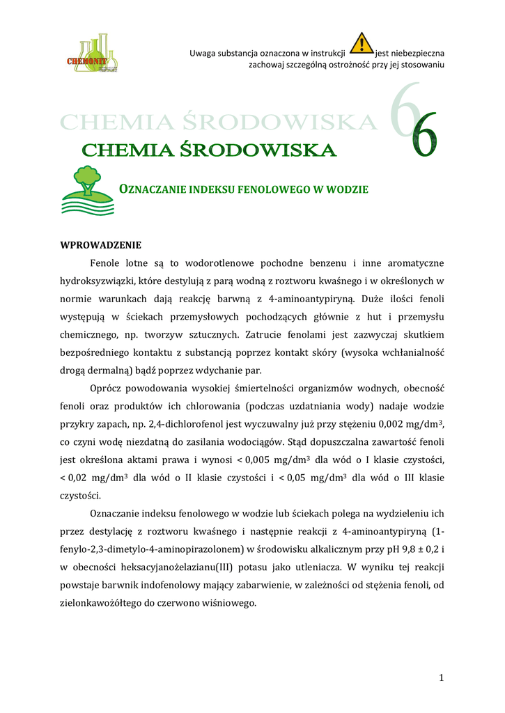 Uwaga substancja oznaczona w instrukcji jest niebezpieczna zachowaj szczególną ostrożność przy jej stosowaniu OZNACZANIE INDEKSU FENOLOWEGO W WODZIE WPROWADZENIE Fenole lotne są to wodorotlenowe pochodne benzenu i inne aromatyczne hydroksyzwiązki, które destylują z parą wodną z roztworu kwaśnego i w określonych w normie warunkach dają reakcję barwną z 4-aminoantypiryną. Duże ilości fenoli występują w ściekach przemysłowych pochodzących głównie z hut i przemysłu chemicznego, np. tworzyw sztucznych. Zatrucie fenolami jest zazwyczaj skutkiem bezpośredniego kontaktu z substancją poprzez kontakt skóry (wysoka wchłanialność drogą dermalną) bądź poprzez wdychanie par. Oprócz powodowania wysokiej śmiertelności organizmów wodnych, obecność fenoli oraz produktów ich chlorowania (podczas uzdatniania wody) nadaje wodzie przykry zapach, np. 2,4-dichlorofenol jest wyczuwalny już przy stężeniu 0,002 mg/dm3, co czyni wodę niezdatną do zasilania wodociągów. Stąd dopuszczalna zawartość fenoli jest określona aktami prawa i wynosi < 0,005 mg/dm3 dla wód o I klasie czystości, < 0,02 mg/dm3 dla wód o II klasie czystości i < 0,05 mg/dm3 dla wód o III klasie czystości. Oznaczanie indeksu fenolowego w wodzie lub ściekach polega na wydzieleniu ich przez destylację z roztworu kwaśnego i następnie reakcji z 4-aminoantypiryną (1fenylo-2,3-dimetylo-4-aminopirazolonem) w środowisku alkalicznym przy pH 9,8 ± 0,2 i w obecności heksacyjanożelazianu(III) potasu jako utleniacza. W wyniku tej reakcji powstaje barwnik indofenolowy mający zabarwienie, w zależności od stężenia fenoli, od zielonkawożółtego do czerwono wiśniowego. 1 Uwaga substancja oznaczona w instrukcji jest niebezpieczna zachowaj szczególną ostrożność przy jej stosowaniu Według normy, zawartość fenoli lotnych określa się za pomocą spektrofotometru bądź kolorymetru fotoelektrycznego lub wizualnie przez porównanie intensywności zabarwienia badanej próbki ze skalą wzorców. Indeks fenolowy definiuje się jako liczbę określającą stężenie różnych związków fenolowych wyrażone w mg fenolu/dm3. Określenie „indeks fenolowy” wprowadzono, gdyż w uprzednio wymienionych warunkach z 4-aminoantypiryną reagują fenol i jego orto- i meta pochodne oraz te ortopochodne, których podstawnikiem jest grupa karboksylowa, metoksylowi lub sulfonowa. Natomiast nie reagują z 4-aminoantypiryną te pochodne fenolu, które w położeniu para mają grupę alkilową, aldehydową, arylową, benzoilową, nitrową lub nitrozową. Metodę tę stosuje się do oznaczania indeksu fenolowego w zakresie powyżej 0,5 do 10,0 mg/dm3. Próbkę wody lub ścieku pobiera się do naczynia wykonanego ze szkła borokrzemianowego. Oznaczenie należy przeprowadzić przed upływem 4 godzin od pobrania. Jeżeli nie jest to możliwe należy próbkę utrwalić przez zakwaszenie kwasem ortofosforowym(V) do pH ok. 4,0 (wobec oranżu metylowego lub mierząc pehametrem) i dodać 1 g pięciowodnego siarczanu(VI) miedzi(II) na 1 dm3 próbki. Próbkę utrwaloną można przechowywać do 24 godzin w temperaturze 5-10 oC. W oznaczaniu fenoli tą metodą przeszkadzają substancje utleniające i redukujące, wysokie pH, związki siarki oraz oleje i smoły. Te ostatnie należy usunąć poprzez ekstrakcję tetrachlorometanem w środowisku alkalicznym (pH 12,0 – 12,5). Nadmiar tetrachlorometanu pozostający w warstwie wodnej należy odpędzić, ogrzewając próbę na łaźni wodnej. Aby uniknąć utlenienia fenoli (a tym samym zaniżenia wyniku), obecne w próbie substancje utleniające należy usunąć przez dodanie siarczanu(VI) żelaza(II) lub arsenianu(III) sodu. 2 Uwaga substancja oznaczona w instrukcji jest niebezpieczna zachowaj szczególną ostrożność przy jej stosowaniu Celem ćwiczenia jest zapoznanie z metodyką oznaczania fenoli lotnych w wodzie i ściekach poprzez ich wyizolowanie metodą destylacji i oznaczenie metodą spektrofotometryczną. Odczynniki: 4-aminoantypiryna cz.d.a., roztwór 2 %; kwas ortofosforowy(V) (85 %) cz.d.a., roztwór 1+9; oranż metylowy, roztwór 0,1 %; bufor amonowy; 10 % roztwór siarczanu(VI) miedzi cz.d.a.; woda amoniakalna cz.d.a.; heksacyjanożelazian(III) potasu [K3Fe(CN)6] cz.d.a., roztwór 0,08 g/cm3; fenol cz.d.a., roztwór wzorcowy podstawowy o stężeniu 1 mg/cm3. Sprzęt laboratoryjny i aparatura pomiarowa: spektrofotometr SPECOL, zestaw szklany do destylacji z połączeniami na szlify i kolbą kulistą o pojemności 500 cm3, zlewki o pojemności 200 cm3 (3 szt.), pehametr, bagietka. SPOSÓB WYKONANIA 1. Przygotowanie skali wzorców i sporządzanie krzywej wzorcowej 1) W kolbie miarowej o objętości 1 dm3 sporządzić roztwór podstawowy fenolu przez rozpuszczenie 1,0 g fenolu w wodzie destylowanej. Jeżeli roztwór jest zabarwiony, należy go wcześniej przedestylować. Roztwór jest trwały około miesiąca. 1 cm3 roztworu zawiera 1 mg fenolu. 2) Przygotować roboczy roztwór fenolu przez rozcieńczenie w kolbie miarowej o objętości 1 dm3 10 cm3 roztworu wzorcowego podstawowego. Roztwór ten zawiera 0,01 mg fenolu w 1 cm3. 3) Do zlewek odmierzyć kolejno: 0,0; 5,0; 10,0; 20,0; 30,0; 40,0; 50,0 cm3 roztworu roboczego fenolu i dopełnić wodą destylowaną do objętości 100 cm3, tak sporządzone roztwory zawierają odpowiednio: 0,0; 0,05; 0,1; 0,2; 0,3; 0,4; 0,5 mg fenolu. Do każdego wzorca dodać 1,0 cm3 roztworu buforowego, wymieszać i zmierzyć pH za pomocą pehametru. Ewentualną korektę do pH = 9,8 ± 0,2 przeprowadzić dodając kroplami wodę amoniakalną. Następnie dodać kolejno po 2,0 cm3 roztworu 4-aminoantypiryny oraz roztworu heksacyjanożelazianu(III) potasu, mieszając natychmiast zawartość każdej zlewki po dodaniu poszczególnych 3 Uwaga substancja oznaczona w instrukcji jest niebezpieczna zachowaj szczególną ostrożność przy jej stosowaniu odczynników. Roztwory są nietrwałe, dlatego też należy je przygotowywać równocześnie