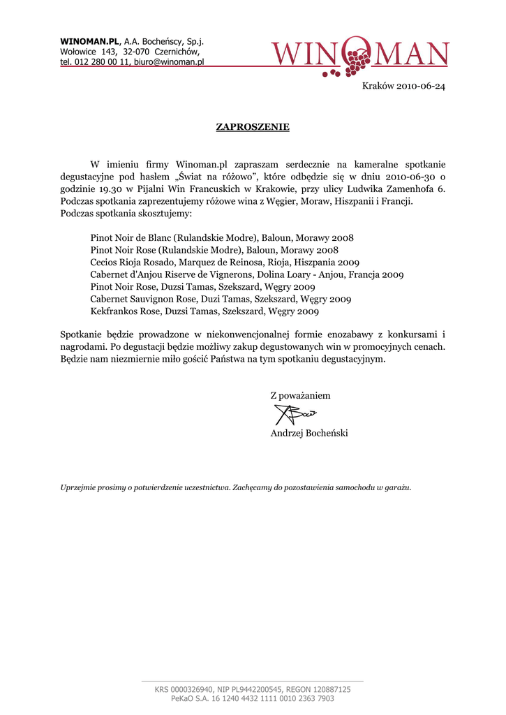 WINOMAN.PL, A.A. Bocheńscy, Sp.j. Wołowice 143, 32-070 Czernichów, tel. 012 280 00 11, [email protected] Kraków 2010-06-24 ZAPROSZENIE W imieniu firmy Winoman.pl zapraszam serdecznie na kameralne spotkanie degustacyjne pod hasłem „Świat na różowo”, które odbędzie się w dniu 2010-06-30 o godzinie 19.30 w Pijalni Win Francuskich w Krakowie, przy ulicy Ludwika Zamenhofa 6. Podczas spotkania zaprezentujemy różowe wina z Węgier, Moraw, Hiszpanii i Francji. Podczas spotkania skosztujemy: Pinot Noir de Blanc (Rulandskie Modre), Baloun, Morawy 2008 Pinot Noir Rose (Rulandskie Modre), Baloun, Morawy 2008 Cecios Rioja Rosado, Marquez de Reinosa, Rioja, Hiszpania 2009 Cabernet d'Anjou Riserve de Vignerons, Dolina Loary - Anjou, Francja 2009 Pinot Noir Rose, Duzsi Tamas, Szekszard, Węgry 2009 Cabernet Sauvignon Rose, Duzi Tamas, Szekszard, Węgry 2009 Kekfrankos Rose, Duzsi Tamas, Szekszard, Węgry 2009 Spotkanie będzie prowadzone w niekonwencjonalnej formie enozabawy z konkursami i nagrodami. Po degustacji będzie możliwy zakup degustowanych win w promocyjnych cenach. Będzie nam niezmiernie miło gościć Państwa na tym spotkaniu degustacyjnym. Z poważaniem Andrzej Bocheński Uprzejmie prosimy o potwierdzenie uczestnictwa. Zachęcamy do pozostawienia samochodu w garażu. KRS 0000326940, NIP PL9442200545, REGON 120887125 PeKaO S.A. 16 1240 4432 1111 0010 2363 7903