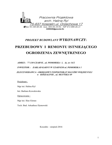 Pracownia Projektowa arch. Halina Ryl 75-637 Koszalin ul. Orzechowa 17 /fax 94 340-60-40, kom. 604-84-10-94; NIP 672-000-46-21 [email protected] PROJEKT BUDOWLANY WYKONAWCZY: PRZEBUDOWY I REMONTU ISTNIEJĄCEGO OGRODZENIA ZEWNĘTRZNEGO ADRES : 77-330 CZARNE , ul. POMORSKA 1, dz. nr 14/2 INWESTOR : ZAKŁAD KARNY W CZARNEM ul. POMORSKA 1 ZLECENIODAWCA : OKRĘGOWY INSPEKTORAT SŁŁUśBY WIĘZIENNEJ w KOSZALINIE , ul. MŁYŃSKA 69 Projektant : Mgr inŜ. Halina Ryl InŜ. Barbara Kowalewska Opracowanie : Mgr inŜ. Ilias Gienas Tech. Bud. Arkadiusz Dymowski Koszalin – sierpień 2016 1 ZAWARTOŚĆ TECZKI: - strona tytułowa - oświadczenie - przynaleŜność do Izb , uprawnienia - wynik badań geotechnicznych - opis architektoniczno konstrukcyjny , BIOZ - rysunki ; - INWENTARYZACJA : RYSUNKI + FOTOGRAFIE - PROJEKT BUD. WYKONAWCZY PRZEBUDOWY I REMONTU 2 OŚWIADCZENIE Na podstawie art. 20 ust. 4 ustawy z dnia 7 lipca 1994r. – Prawo budowlane (jednolity tekst Dz.U. z 2003r. Nr 207, poz. 2016 z późniejszymi zmianami) oświadczam, Ŝe projekt wykonawczy PRZEBUDOWY I REMONTU ISTNIEJACYCH MURÓW OCHRONNYCH - na terenie ZAKŁADU KARNEGO w CZARNEM , ul. Pomorska 1 został sporządzony zgodnie z obowiązującymi przepisami oraz zasadami wiedzy technicznej. Projektantki : Architektura : mgr inŜ. arch. Halina Ryl Konstrukcja ; inŜ. Barbara Kowalewska 3 CZĘŚĆ OPISOWA : 1. podstawa opracowania 2. przedmiot , cel i zakres opracowania 3. Opis ogólny stanu istniejącego i podział murów ochronnych zewnętrznych 4. Inwentaryzacja - charakterystyka stanu istniejącego 5. wnioski ze stanu technicznego istniejących murów 6. opis zamierzeń projektowych 7. opis konstrukcji murów przebudowanych i remontowanych 8. WYTYCZNE DO PLANU BIOZ CZĘŚĆ RYSUNKOWA : „i” ( inwentaryzacja ) : I. RYSUNKI INWENTARYZACYJNE: 1/i - lokalizacja murów zinwentaryzowanych 2/i - widok muru nr 2,3,4 3/i – widok muru nr 5 4/i – widok muru nr 6, 7, 8, 9 5/ i – widok muru nr 10 6/ i – widok muru nr 11 7/ i – widok muru nr 11 W 8/ i – widok muru nr 11 W 9/ i – widok muru nr 11 W 10/ i – widok muru nr 12 , 13 11/ i – widok muru nr 14 12/ i – widok muru nr 15 ( schemat ) II. załączniki fotograficzne 1.- „P” ( przebudowa ) : 1/1 P - Plansza lokalizacyjna z murami do przebudowy 1 : 1500 1/2/K - Moduł konstrukcyjny muru Ŝelbetowego l= 15 m. 1 : 100 1/3 /K - Moduł konstrukcyjny - rzut, widok , przekrój 1 : 50 1/4/K – Przekrój przez moduł muru Ŝelbetowego 1 : 20 1/5/K- Ława Ŝelbetowa Ł-1 , ściana Ŝelbetowa SZ1 1 : 20 1/6 /K- Zwieńczenie muru Ŝelbetowego l=15 m, 1 moduł 1 : 20 1/7/K - zestawienie modułów muru , zestawienie stali 4 2. - „R” ( remont ): 2/1 R - Plansza lokalizacyjna z murami do remontu 1 : 1500 2/ 2/ K – Fragment muru istn. h=5,0 m. i po remoncie h=6,0 m : - rzut , widok , przekrój 1 : 100 2/3/ K - Fragment muru remontowanego h= 6,0 m – rzut , widok , przekrój 1:50 2/4/ K- Przekrój „B-B” muru remontowanego h= 6,0 m. 1 : 20 2/5/K - Zwieńczenie z elementów stalowych muru remontowanego 1 : 20 2/6/ K – Zestawienie odcinków murów remontowanych i zestawienie stali dla murów nr 10 , 11, 11 W ( schemat ) OPIS TECHNICZNY 1. podstawa opracowania - zlecenie – umowa o prace projektowe z Okręgowym Inspektoratem SłuŜby Więziennej w Koszalinie - inwentaryzacja murów w terenie , dokumentacja fotograficzna - mapa sytuacyjna w skali 1 : 1000 ( w formie elektronicznej , dostarczona przez OISW w Koszalinie ) - dokumentacja geotechniczna ( odkrywki fundamentów i odwierty ) wykonana w 2016 r. przez Pracownię Geologiczną M . Mazurkiewicz – Kielczyk. - Obowiązujące przepisy i normy techniczne - Uzgodnienia bieŜące z OISW w Koszalinie - Wytyczne nr 2 / 2013 Dyrektora Generalnego SłuŜby Więziennej z dnia 04 –06 – 2013 w sprawie wymagań dla zabezpieczeń techniczno – ochronnych w jednostkach organizacyjnych SłuŜby Więziennej – rozdział 2 , § 2 , pkt 6. 2. przedmiot , cel i zakres opracowania Przedmiotem opracowania jest przebudowa i remont ogrodzenia zewnętrznego terenu Zakładu Karnego w Czarnem - Zakład jest obiektem więziennym o pełnym systemie ochrony. 5 Celem opracowania jest : - poprawa stanu technicznego ogrodzenia zewnętrznego - doprowadzenie do zgodności z wytycznymi nr 2/2012 Dyrektora Generalnego S.W. Zakres opracowania obejmuje : - inwentaryzację - projekt przebudowy części murów - projekt remontu murów pozostałych ogrodzenia PROJEKT NIE OBEJMUJE : - inwentaryzacji , projektu przebudowy lub remontu odcinków muru nr 1 i 1A – świeŜo po remoncie. - Projektu branŜy elektrycznej w zakresie wymiany słupów oświetleniowych i lamp oświetlenia oraz instalacji telewizji przemysłowej . 3. Opis ogólny stanu istniejącego i podział murów ochronnych zewnętrznych 3.1. podział obszaru Z.K. na strefy: obszar Zakładu Karnego w Czarnem dla celów projektowych podzielono na obszar: „ A” , „B” , „C” , „D” Teren „A” – jest obszar ochrony ścisłej , na którym znajdują się obiekty zakwaterowania osadzonych Teren „B” – teren obiektów pomocniczych i technicznych Teren „C” - teren wyłączony z opracowania Teren „D” – teren zakładu produkcyjnego , wyłączony z opracowania - Na terenie „B” i „D” przebywają osadzeni - jako pracownicy zatrudnieni w zakładach pracy zlokalizowanych na terenie Zakładu Karnego , poza obszarem ochrony ścisłej. - Projektowana przebudowa i remont ogrodzenia obejmuje teren „A” i „B” . Ogrodzenie musi spełniać wymogi normowe konstrukcyjne oraz wymagania przedstawione w Wytycznych nr 2/2013 dotyczące zabezpieczeń techniczno- ochronnych w jednostkach S.W. 3.2. ogólny opis ogrodzenia: 3.2.1. - obszar „A” : teren ochrony ścisłej jest działką prostokątną , z wieŜyczkami na naroŜnikach oraz wieŜyczkami straŜniczymi pośrednimi na długich odcinkach ; 6 - od strony południowej ( od frontu ) znajduje się główna brama wjazdowa. Na le