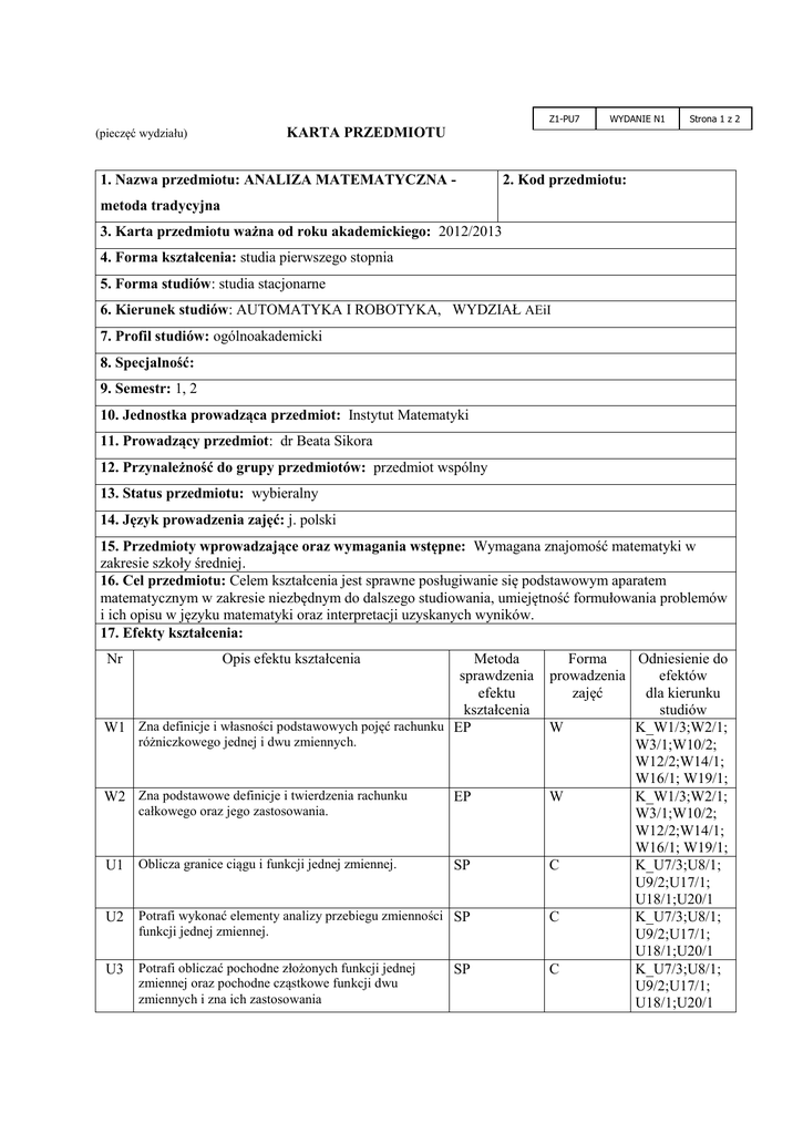 Z1-PU7 (pieczęć wydziału) WYDANIE N1 Strona 1 z 2 KARTA PRZEDMIOTU 1. Nazwa przedmiotu: ANALIZA MATEMATYCZNA - 2. Kod przedmiotu: metoda tradycyjna 3. Karta przedmiotu ważna od roku akademickiego: 2012/2013 4. Forma kształcenia: studia pierwszego stopnia 5. Forma studiów: studia stacjonarne 6. Kierunek studiów: AUTOMATYKA I ROBOTYKA, WYDZIAŁ AEiI 7. Profil studiów: ogólnoakademicki 8. Specjalność: 9. Semestr: 1, 2 10. Jednostka prowadząca przedmiot: Instytut Matematyki 11. Prowadzący przedmiot: dr Beata Sikora 12. Przynależność do grupy przedmiotów: przedmiot wspólny 13. Status przedmiotu: wybieralny 14. Język prowadzenia zajęć: j. polski 15. Przedmioty wprowadzające oraz wymagania wstępne: Wymagana znajomość matematyki w zakresie szkoły średniej. 16. Cel przedmiotu: Celem kształcenia jest sprawne posługiwanie się podstawowym aparatem matematycznym w zakresie niezbędnym do dalszego studiowania, umiejętność formułowania problemów i ich opisu w języku matematyki oraz interpretacji uzyskanych wyników. 17. Efekty kształcenia: Nr Opis efektu kształcenia Metoda sprawdzenia efektu kształcenia W1 Zna definicje i własności podstawowych pojęć rachunku EP różniczkowego jednej i dwu zmiennych. W2 Zna podstawowe definicje i twierdzenia rachunku EP U1 Oblicza granice ciągu i funkcji jednej zmiennej. SP całkowego oraz jego zastosowania. U2 Potrafi wykonać elementy analizy przebiegu zmienności SP funkcji jednej zmiennej. U3 Potrafi obliczać pochodne złożonych funkcji jednej zmiennej oraz pochodne cząstkowe funkcji dwu zmiennych i zna ich zastosowania SP Forma Odniesienie do prowadzenia efektów zajęć dla kierunku studiów W K_W1/3;W2/1; W3/1;W10/2; W12/2;W14/1; W16/1; W19/1; W K_W1/3;W2/1; W3/1;W10/2; W12/2;W14/1; W16/1; W19/1; C K_U7/3;U8/1; U9/2;U17/1; U18/1;U20/1 C K_U7/3;U8/1; U9/2;U17/1; U18/1;U20/1 C K_U7/3;U8/1; U9/2;U17/1; U18/1;U20/1 U4 Oblicza całki nieoznaczone z funkcji elementarnych SP C U5 Potrafi zastosować transformatę Laplace’a do SP C oraz oblicza całki oznaczone i zna ich zastosowania. rozwiązywania równań różniczkowych liniowych. K_U7/3;U8/1; U9/2;U17/1; U18/1;U20/1 K_U7/3;U8/1; U9/2;U17/1; U18/1;U20/1 18. Formy zajęć dydaktycznych i ich wymiar (liczba godzin) W. 60 Ćw. 60 L. P. Sem. 19. Treści kształcenia: Wykład i ćwiczenia są prowadzone metodą tradycyjną. Podczas wykładu podawane są definicje i twierdzenia (część z dowodami); wszystkie pojęcia są ilustrowane licznymi przykładami. Studenci mogą śledzić tok rozumowania, zadawać pytania, uczestniczyć i współdziałać w wyprowadzaniu wzorów oraz rozwiązywaniu problemów i zadań. Na ćwiczeniach studenci rozwiązują (samodzielnie lub z pomocą prowadzącego) zadania rachunkowe wybrane przez prowadzącego. Wykład: 1. Ogólne pojęcie funkcji. 2. Metryka i przestrzeń metryczna. 3. Ciągi w przestrzeniach metrycznych, granica ciągu liczbowego. 4. Granica i ciągłość funkcji. 5. Pochodna i różniczka funkcji. Podstawowe twierdzenia rachunku różniczkowego. 6. Badanie przebiegu zmienności funkcji. 7. Całka nieoznaczona – definicja, własności, metody całkowania. Całkowanie funkcji wymiernych, niewymiernych, trygonometrycznych. 8. Całka Reimanna - definicja, interpretacja, własności, zmiana zmiennych, zastosowania całki oznaczonej. 9. Całki niewłaściwe. 10. Transformata Laplace’a – definicja, podstawowe twierdzenia. Zastosowanie przekształcenia Laplace’a do rozwiązywania równań różniczkowych liniowych o stałych współczynnikach. 11. Rachunek różniczkowy funkcji wielu zmiennych. Pochodne cząstkowe funkcji wielu zmiennych. Różniczka zupełna i jej zastosowania. Ekstrema funkcji dwu zmiennych. Pochodna kierunkowa. Gradient. 12. Całka podwójna – definicja, interpretacje, własności, obliczanie, zmiana zmiennych. 13. Szeregi – liczbowe, potęgowe, Fouriera. Ćwiczenia: W ramach ćwiczeń tablicowych utrwala się i ilustruje zadaniami materiał według programu wykładu. 20. Egzamin: tak 21. Literatura podstawowa: Sikora B., Łobos E.: A first course in calculus. Łobos E., Sikora B.: Advanced Calculus – Selected Topics. Fichtenholz G.M.: Rachunek różniczkowy i całkowy, t. 1, 2. Grzymkowski R.: Matematyka. Łobos E., Sikora B.: Calculus and differential equation s in exercises. Berman G. N.: Zbiór zadań z analizy matematycznej. 7. Grzymkowski R.: Matematyka – zadania i odpowiedzi. 1. 2. 3. 4. 5. 6. 22. Literatura uzupełniająca: Kołodziej W.: Analiza matematyczna. Leja F.: Rachunek Różniczkowy i całkowy. Szałajko K.: Matematyka, t. 1, 2. Trajdos – Wróbel T.: Matematyka dla inżynierów. 5. Krysicki W., Włodarski L.: Zbiór zadań z analizy matematycznej. 1. 2. 3. 4. 23. Nakład pracy studenta potrzebny do osiągnięcia efektów kształcenia Lp. Forma zajęć Wykład Ćwiczenia Laboratorium Projekt Seminarium Inne (egzamin, konsultacje) Suma godzin 24. Suma wszystkich godzin: 360 1 2 3 4 5 6 Liczba godzin kontaktowych / pracy studenta 60/50 60/120 / / / 20 /50 140/220 25. Liczba punktów ECTS: 12 26. Liczba punktów ECTS uzyskanych na zajęciach z bezpośrednim udziałem nauczyciela akademickiego: 5 27. Liczba punktów ECTS uzyskanych na zajęciach o charakterze praktycznym (laboratoria, projekty): 0 26. Uwagi: Zatwierdzono: ……………………………. ………………………………………………… (data i podpis prowadzącego) (data i podpis dyrektora instytutu/kierownika katedry/ Dyrektora Kolegium Języków Obcych/kierownika lub dyrektora jednostki międzywydziałowej)