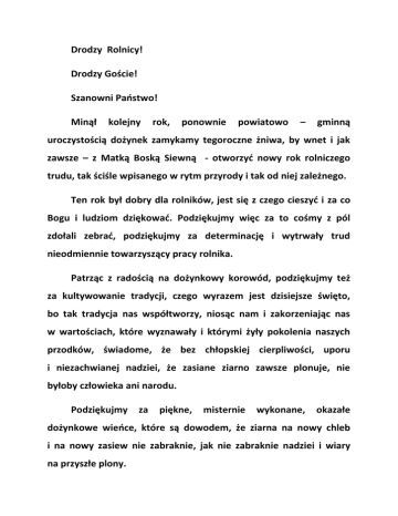 Drodzy Rolnicy! Drodzy Goście! Szanowni Państwo! Minął kolejny rok, ponownie powiatowo – gminną uroczystością dożynek zamykamy tegoroczne żniwa, by wnet i jak zawsze – z Matką Boską Siewną - otworzyć nowy rok rolniczego trudu, tak ściśle wpisanego w rytm przyrody i tak od niej zależnego. Ten rok był dobry dla rolników, jest się z czego cieszyć i za co Bogu i ludziom dziękować. Podziękujmy więc za to cośmy z pól zdołali zebrać, podziękujmy za determinację i wytrwały trud nieodmiennie towarzyszący pracy rolnika. Patrząc z radością na dożynkowy korowód, podziękujmy też za kultywowanie tradycji, czego wyrazem jest dzisiejsze święto, bo tak tradycja nas współtworzy, niosąc nam i zakorzeniając nas w wartościach, które wyznawały i którymi żyły pokolenia naszych przodków, świadome, że bez chłopskiej cierpliwości, uporu i niezachwianej nadziei, że zasiane ziarno zawsze plonuje, nie byłoby człowieka ani narodu. Podziękujmy za piękne, misternie wykonane, okazałe dożynkowe wieńce, które są dowodem, że ziarna na nowy chleb i na nowy zasiew nie zabraknie, jak nie zabraknie nadziei i wiary na przyszłe plony. Podziękujmy za okazały bochen chleba upieczony z nowego ziarna, bo w tym chlebie zawarta jest nasza gościnność i obietnica, że gdyby nawet komuś miało go zabraknąć, każdemu z nas wystarczy wrażliwości, by cudzą biedę zobaczyć i swoim chlebem się podzielić. Świętujmy więc dożynki, by w ten sposób wyrazić szacunek i wdzięczność ludziom rolniczego trudu, pracy na pożytek siebie i innych wykonanej. Szanowni Państwo! Ale dzisiejsza wieś już od dawna nie żyje tylko z rolnictwa i nie tylko rolnictwem. Dzisiejsza wieś kultywując tradycję, otwiera się na współczesność, bo tego świat coraz bardziej wymaga. Dlatego też nasz powiatowo -gminny „plon” nie tylko z kłosianych wieńców, nie tylko z bochnów chleba się składa. Powiatowo - gminny charakter naszych dożynek daje nam prawo, byśmy przed całym powiatem – pokazując, co się udało nam wspólnie zrobić – podziękowali tym wszystkim, którzy sprawili, że i wsi powiatu Wolsztyńskiego z roku na rok bliżej do standardów wsi europejskiej. Wygląd naszych wsi zmienia się na korzyść. Każdy widzi, jak zadbane są nasze domy i obejścia. Ile tu widać troski o ład i piękno. Ile pracy włożonej w uporządkowanie i poprawę „swojego” i „wspólnego”. I my, którym z woli wyborców przyszło włodarzyć powiecie staramy się dopełnić tę troskę mieszkańców o ich wieś. Drodzy uczestnicy dzisiejszego święta! Rok 2012 to dobry rok dla rolników. Plony są dobre choć nie rekordowe. Mimo nienajlepszych gleb w powiecie wolsztyńskim uzyskano średnie plony żyta 3,5 tony z hektara, pszenicy ozimej 4,7 tony z hektara, pszenicy jarej 4,2 tony z hektara oraz pszenżyta 4,4 tony z hektara. Żniwa przebiegały sprawnie, ominęły nas klęski losowe, które gdy występują mogą zniweczyć całoroczny wysiłek rolnika. Ceny zboża i słomy są dla rolników korzystne. Co chociaż częściowo rekompensuje wzrastające koszty produkcji rolnej. Mamy więc za co czynić dziękczynienie. Drodzy rolnicy! Za ten wspaniały dar Waszych rąk, za owoce Waszej pracy – jakże ciężkiej i mozolnej, składam Wam słowa najwyższego uznania. Bo owoce tej pracy uzależnione są od wielu okoliczności. To Wy z oczekiwaniem patrzycie na niebo upraszając deszcz, to dla Was nie ma określonej godziny na rozpoczęcie i zakończenie pracy. Dożynki są przede wszystkim Waszym świętem, z Waszego trudu korzystamy wszyscy. Jesteśmy Wam winni wdzięczność i szacunek. Dzisiaj mamy okazję podziękować za wysiłek i zaangażowanie jakie wkładacie tworząc plon. Życzę Wam, aby nastał dobry czas dla rolnictwa, abyście korzystali z nowych możliwości i szans. Życzę dużo zdrowia i pomyślności Wam wszystkim, Waszym rodzinom i najbliższym. Dziękujemy za całoroczny trud i życzę zawsze udanych plonów, wytrwałości i satysfakcji z wykonywanej pracy. Szanowni Państwo! Na zakończenie chciałbym serdecznie podziękować gminom Powiatu Wolsztyńskiego za wystawienie swoich reprezentacji, a mieszkańcom Gminy Przemęt na czele z Panią Wójt za podjęcie trudu współorganizacji dożynek powiatowo - gminnych. Bardzo serdecznie dziękuję Wam wszystkim szanowni zebrani. Dziękuję mieszkańcom, gościom, delegacjom za udział w tym ważnym święcie. Niech to święto będzie naszą wspólną radością. Życzę Państwu miłego spędzenia czasu, niezapomnianych przyjemnych wrażeń i udanej zabawy.
