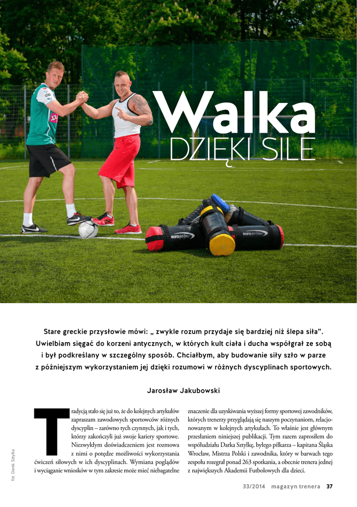 Stare greckie przysłowie mówi: „ zwykle rozum przydaje się bardziej niż ślepa siła”. Uwielbiam sięgać do korzeni antycznych, w których kult ciała i ducha współgrał ze sobą i był podkreślany w szczególny sposób. Chciałbym, aby budowanie siły szło w parze fot. Darek Sztylka z późniejszym wykorzystaniem jej dzięki rozumowi w różnych dyscyplinach sportowych. T Jarosław Jakubowski radycją stało się już to, że do kolejnych artykułów zapraszam zawodowych sportowców różnych dyscyplin – zarówno tych czynnych, jak i tych, którzy zakończyli już swoje kariery sportowe. Niezwykłym doświadczeniem jest rozmowa z nimi o potędze możliwości wykorzystania ćwiczeń siłowych w ich dyscyplinach. Wymiana poglądów i wyciąganie wniosków w tym zakresie może mieć niebagatelne znaczenie dla uzyskiwania wyższej formy sportowej zawodników, których trenerzy przyglądają się naszym poczynaniom, relacjonowanym w kolejnych artykułach. To właśnie jest głównym przesłaniem niniejszej publikacji. Tym razem zaprosiłem do współudziału Darka Sztylkę, byłego piłkarza – kapitana Śląska Wrocław, Mistrza Polski i zawodnika, który w barwach tego zespołu rozegrał ponad 263 spotkania, a obecnie trenera jednej z największych Akademii Futbolowych dla dzieci. 33/2014 magazyn trenera 37 W niniejszym artykule chciałbym skupić się na przygotowaniu siłowym piłkarza przed sezonem. Trening ten w założeniu powinien mieć charakter izolowany od gry. Ćwiczenia nie mają bezpośredniego związku z grą. Zacznę od podziału podstawowego treningu siłowego, który dzieli się na: •• trening izometryczny (kiedy występuje maksymalne napięcie mięśni, ale bez zmiany ich długości), •• trening ekscentryczny (podczas opuszczania ciężaru, kiedy mięśnie się wydłużają), •• trening koncentryczny (podczas podnoszenia ciężarów, kiedy mięśnie maksymalnie się kurczą). W niniejszym artykule chciałbym skupić się na przygotowaniu siłowym piłkarza przed sezonem. Trening ten w założeniu powinien mieć charakter izolowany od gry. Ćwiczenia nie mają bezpośredniego związku z grą i mogą obejmować: •• środki oparte na osiągnięciach tzw. siłowych dyscyplin sportowych (kulturystyka, podnoszenie ciężarów, wioślarstwo, L.A.), •• ćwiczenia ze sztangami lub hantlami na siłowni, •• statyczne ćwiczenia z gumami (ekspanderami), •• pokonywanie oporów własnego ciała. Wywodzę się z kręgu bodybuildingu i tam właśnie zawsze poszukuję inspiracji. Ze szczególną uwagą uwzględniam jednak charakterystykę danej dyscypliny – sposób poruszania się, zmienność stref tlenowych i aspekty koordynacyjne. Ciągle poszukuję rozwiązań, jak usprawnić pod względem siłowym każdego sportowca. Rozmowa z Darkiem pozwala na ugruntowanie kilku ważnych kwestii związanych z treningiem przygotowania siłowego piłkarza. Po wspólnym uzgodnieniu jako główny przyrząd treningowy wybieramy powerbagi, czyli worki opatrzone uchwytami i wypełnione masą o różnej wadze. Ustaliliśmy przede wszystkim, że kluczowy jest okres przygotowań przed sezonem piłkarskim, a w związku z tym kierunkowanie rodzaju siły, która ma dominować w procesie treningowym. Dlatego też, jak już wspomniałem wcześniej, skoncentrujemy się na przygotowaniu poza sezonem piłkarskim. Trening ten będzie ukierunkowany na zwiększenie siły statycznej bez znacznego wzrostu masy mięśniowej. Wybieramy ćwiczenia klasyczne, między innymi z metody ciężkoatletycznej, a także ćwiczenia złożone – wielostawowe, takie jak wyciskanie, przysiady i martwe ciągi. Mimo dość często wygłaszanych sugestii, aby treningu stricte siłowego nie łączyć z jakimikolwiek formami poruszania się piłkarza, postanowiliśmy sięgnąć po tyczki i podjąć „walkę o pozycję”. Ćwiczenie to tylko nosi „znamiona” gry i nie można jednoznacznie przypisać go piłce nożnej, co jednocześnie usprawiedliwia nasz wybór, a pozwala trzymać się podstaw założeń co do ćwiczeń izolowanych od gry. W treningu figuruje zaledwie 5 ćwiczeń. Powszechnie stosowane metody kształtowania siły mięśniowej piłkarzy zakładają, że ćwiczenia kończyn dolnych powinny mieć charakter pracy ekscentrycznej i koncentrycznej, natomiast ćwiczenia mięśni górnej części ciała należy obciążyć pracą o charakterze koncentrycznym i izometrycznym. My szczególnie koncentrujemy się na prędkości – tempie wykonywania ćwiczeń – i pomimo założeń kształtowania siły statycznej włączamy ruchy eksplozywne. Doświadczenie Darka sygnalizuje, że usztywnienie ruchów po treningach często utrzymywało się długo po zakończeniu ćwiczeń związanych z budowaniem siły statycznej, stąd ta delikatna modyfikacja. Trzeba pamiętać, że w piłce użycie siły przejawia się przede wszystkim w: •• przyspieszaniu na kilku metrach, •• wyskokach do uderzenia piłki głową, •• bezpośredniej walce z przeciwnikiem (gra ciałem, drybling), •• uderzeniach piłki na dużą odległość, •• odbiorze piłki wślizgiem, •• nadawaniu piłce dużej prędkości. Uważamy jednak, że okres budowania siły poza sezonem zapewnia korzyści przede wszystkim dla ochrony aparatu ruchu piłkarza przed kontuzjami. Prezentujemy jednostkę treningową, którą można wdrożyć w okresie przygotowań, zalecając jednak dołączenie do kolejnych jednostek ćwiczeń ze sztangami i wyspecjalizowanymi maszynami oraz oporem własnego ciała. Jak zawsze, sugerujemy optymalizację obciążenia względem zaleconej liczby lub zakresu ruchów. × Zapraszam do zapoznania się z charakterystyką poszczególnych ćwiczeń! 38 magazyn trenera 33/2014 ĆWICZENIE 1. W przysiadzie – gdy jedynka pracuje, wykonując 2 przysiady w tempie 3 sekundy praca koncentryczna i 3 sekundy praca ekscentryczna, dwójka czeka w pozycji przysiadu na przejęcie worka. 4 serie x 8 powtórze