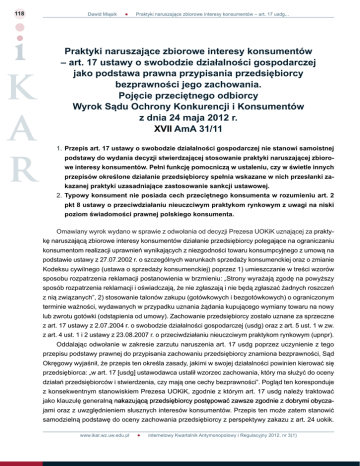 118 Dawid Miąsik Praktyki naruszające zbiorowe interesy konsumentów – art. 17 usdg... Dawid Miąsik Praktyki naruszające zbiorowe interesy konsumentów – art. 17 ustawy o swobodzie działalności gospodarczej jako podstawa prawna przypisania przedsiębiorcy bezprawności jego zachowania. Pojęcie przeciętnego odbiorcy Wyrok Sądu Ochrony Konkurencji i Konsumentów z dnia 24 maja 2012 r. XVII AmA 31/11 1.Przepis art. 17 ustawy o swobodzie działalności gospodarczej nie stanowi samoistnej podstawy do wydania decyzji stwierdzającej stosowanie praktyki naruszającej zbiorowe interesy konsumentów. Pełni funkcję pomocniczą w ustaleniu, czy w świetle innych przepisów określone działanie przedsiębiorcy spełnia wskazane w nich przesłanki zakazanej praktyki uzasadniające zastosowanie sankcji ustawowej. 2.Typowy konsument nie posiada cech przeciętnego konsumenta w rozumieniu art. 2 pkt 8 ustawy o przeciwdziałaniu nieuczciwym praktykom rynkowym z uwagi na niski poziom świadomości prawnej polskiego konsumenta. Omawiany wyrok wydano w sprawie z odwołania od decyzji Prezesa UOKiK uznającej za praktykę naruszającą zbiorowe interesy konsumentów działanie przedsiębiorcy polegające na ograniczaniu konsumentom realizacji uprawnień wynikających z niezgodności towaru konsumpcyjnego z umową na podstawie ustawy z 27.07.2002 r. o szczególnych warunkach sprzedaży konsumenckiej oraz o zmianie Kodeksu cywilnego (ustawa o sprzedaży konsumenckiej) poprzez 1) umieszczanie w treści wzorów sposobu rozpatrzenia reklamacji postanowienia w brzmieniu: „Strony wyrażają zgodę na powyższy sposób rozpatrzenia reklamacji i oświadczają, że nie zgłaszają i nie będą zgłaszać żadnych roszczeń z nią związanych”, 2) stosowanie talonów zakupu (gotówkowych i bezgotówkowych) o ograniczonym terminie ważności, wydawanych w przypadku uznania żądania kupującego wymiany towaru na nowy lub zwrotu gotówki (odstąpienia od umowy). Zachowanie przedsiębiorcy zostało uznane za sprzeczne z art. 17 ustawy z 2.07.2004 r. o swobodzie działalności gospodarczej (usdg) oraz z art. 5 ust. 1 w zw. z art. 4 ust. 1 i 2 ustawy z 23.08.2007 r. o przeciwdziałaniu nieuczciwym praktykom rynkowym (upnpr). Oddalając odwołanie w zakresie zarzutu naruszenia art. 17 usdg poprzez uczynienie z tego przepisu podstawy prawnej do przypisania zachowaniu przedsiębiorcy znamiona bezprawności, Sąd Okręgowy wyjaśnił, że przepis ten określa zasady, jakimi w swojej działalności powinien kierować się przedsiębiorca: „w art. 17 [usdg] ustawodawca ustalił wzorzec zachowania, który ma służyć do oceny działań przedsiębiorców i stwierdzenia, czy mają one cechy bezprawności”. Pogląd ten koresponduje z konsekwentnym stanowiskiem Prezesa UOKiK, zgodnie z którym art. 17 usdg należy traktować jako klauzulę generaln����������������������������������������������������������������������� ą���������������������������������������������������������������������� nakazującą przedsiębiorcy postępować zawsze zgodnie z dobrymi obyczajami oraz z uwzględnieniem słusznych interesów konsumentów. Przepis ten może zatem stanowić samodzielną podstawę do oceny zachowania przedsiębiorcy z perspektywy zakazu z art. 24 uokik. www.ikar.wz.uw.edu.pl internetowy Kwartalnik Antymonopolowy i Regulacyjny 2012, nr 3(1) 119 Dawid Miąsik Praktyki naruszające zbiorowe interesy konsumentów – art. 17 usdg... Do zastosowania przepisu wystarczy wykazanie, że zachowanie przedsiębiorcy narusza słuszny interes konsumentów bądź dobre obyczaje, bez konieczności wykazywania w jaki sposób zachowanie to wpływa na zachowania konsumentów (jak ma to na przykład miejsce w upnpr). W dalszej kolejności Sąd Okręgowy zwrócił jednak uwagę, że w niniejszej sprawie przepis art. 17 usdg nie stanowił samoistnej podstawy do wydania decyzji stwierdzającej stosowanie zakazanej praktyki, ponieważ przepis ten „pełni funkcję pomocniczą w ustaleniu, czy w świetle innych przepisów określone działanie przedsiębiorcy spełnia określone w nich przesłanki zakazanej praktyki uzasadniające zastosowanie sankcji ustawowej”. Dodatkowo Sąd Okręgowy przyjął, że „Prezes UOKiK wydając zaskarżoną decyzję powołał się na przepis art. 17 [usdg] i na tej podstawie wykazał naruszenie przez powoda przepisów innych ustaw”. Oba cytaty z uzasadnienia omawianego wyroku sugerują z kolei, iż według Sądu Okręgowego przepis art. 17 usdg nie stanowi samoistnej podstawy do przypisania przedsiębiorcy bezprawności jego zachowania, skoro konieczne jest sięgnięcie do przepisów innych ustaw. Fragment uzasadnienia dotyczący art. 17 usdg można jednak odczytać jeszcze inaczej. Skoro Sąd Okręgowy przyjął, że art. 17 usdg wyznacza ogólny standard działania przedsiębiorcy (odwołując się do dobrych obyczajów, zasad uczciwej konkurencji oraz słusznych interesów konsumentów), przepis ten można traktować jako dostarczający normatywnego wzorca dla oceny zachowania przedsiębiorcy, gdy jego bezprawność nie wynika z samoistnego i bezpośredniego naruszenia przepisów szczególnych przyznających konsumentom określone uprawnienia. Wówczas art. 17 usdg stanowiłby podstawę do rekonstrukcji wzorca, według którego przedsiębiorca powinien postępować tam, gdzie prawo pozostawia mu szerszy lub węższy zakres swobody w realizacji praw konsumentów. Wyrok zasługuje również na uwagę ze względu na sposób zdefiniowania przeciętnego odbiorcy w sprawach dotyczących nieuczciwych praktyk rynkowych polegających na wprowadzeniu w błąd co do uprawnień przysługujących konsumentom. Sąd Okręgowy uznał m