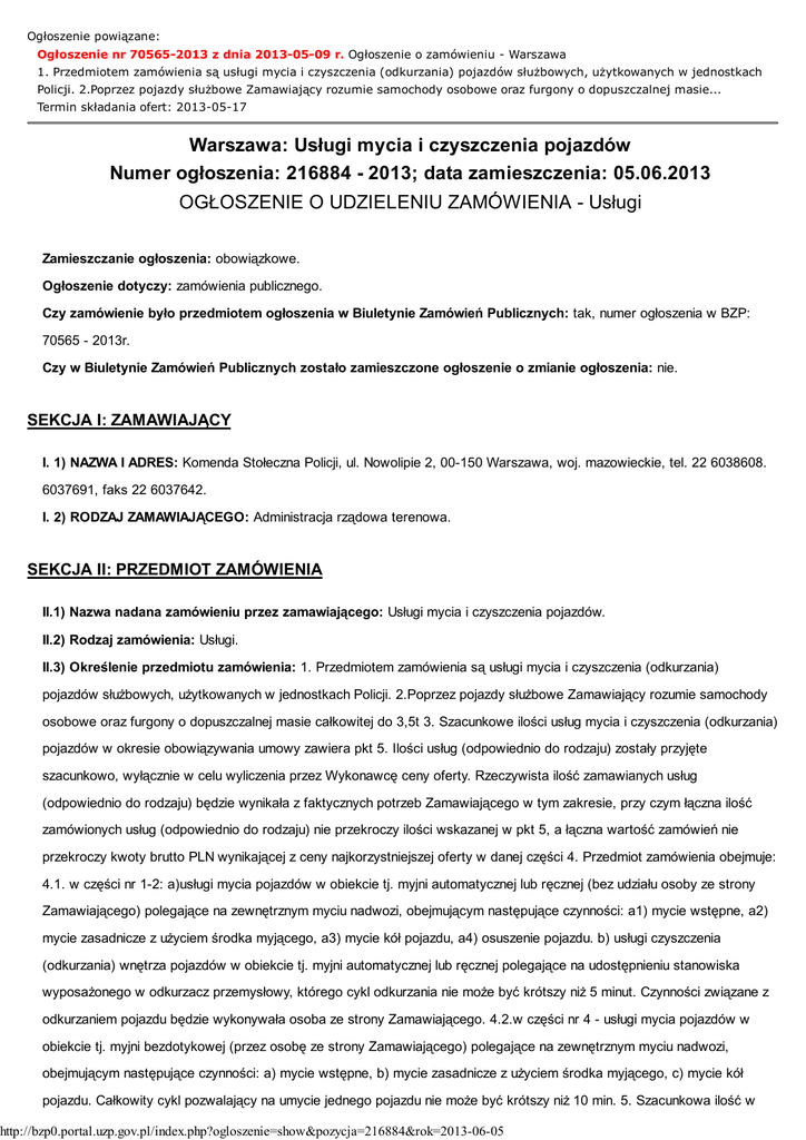 Ogłoszenie powiązane: Ogłoszenie nr 70565-2013 z dnia 2013-05-09 r. Ogłoszenie o zamówieniu - Warszawa 1. Przedmiotem zamówienia są usługi mycia i czyszczenia (odkurzania) pojazdów słuŜbowych, uŜytkowanych w jednostkach Policji. 2.Poprzez pojazdy słuŜbowe Zamawiający rozumie samochody osobowe oraz furgony o dopuszczalnej masie... Termin składania ofert: 2013-05-17 Warszawa: Usługi mycia i czyszczenia pojazdów Numer ogłoszenia: 216884 - 2013; data zamieszczenia: 05.06.2013 OGŁOSZENIE O UDZIELENIU ZAMÓWIENIA - Usługi Zamieszczanie ogłoszenia: obowiązkowe. Ogłoszenie dotyczy: zamówienia publicznego. Czy zamówienie było przedmiotem ogłoszenia w Biuletynie Zamówień Publicznych: tak, numer ogłoszenia w BZP: 70565 - 2013r. Czy w Biuletynie Zamówień Publicznych zostało zamieszczone ogłoszenie o zmianie ogłoszenia: nie. SEKCJA I: ZAMAWIAJĄCY I. 1) NAZWA I ADRES: Komenda Stołeczna Policji, ul. Nowolipie 2, 00-150 Warszawa, woj. mazowieckie, tel. 22 6038608. 6037691, faks 22 6037642. I. 2) RODZAJ ZAMAWIAJĄCEGO: Administracja rządowa terenowa. SEKCJA II: PRZEDMIOT ZAMÓWIENIA II.1) Nazwa nadana zamówieniu przez zamawiającego: Usługi mycia i czyszczenia pojazdów. II.2) Rodzaj zamówienia: Usługi. II.3) Określenie przedmiotu zamówienia: 1. Przedmiotem zamówienia są usługi mycia i czyszczenia (odkurzania) pojazdów słuŜbowych, uŜytkowanych w jednostkach Policji. 2.Poprzez pojazdy słuŜbowe Zamawiający rozumie samochody osobowe oraz furgony o dopuszczalnej masie całkowitej do 3,5t 3. Szacunkowe ilości usług mycia i czyszczenia (odkurzania) pojazdów w okresie obowiązywania umowy zawiera pkt 5. Ilości usług (odpowiednio do rodzaju) zostały przyjęte szacunkowo, wyłącznie w celu wyliczenia przez Wykonawcę ceny oferty. Rzeczywista ilość zamawianych usług (odpowiednio do rodzaju) będzie wynikała z faktycznych potrzeb Zamawiającego w tym zakresie, przy czym łączna ilość zamówionych usług (odpowiednio do rodzaju) nie przekroczy ilości wskazanej w pkt 5, a łączna wartość zamówień nie przekroczy kwoty brutto PLN wynikającej z ceny najkorzystniejszej oferty w danej części 4. Przedmiot zamówienia obejmuje: 4.1. w części nr 1-2: a)usługi mycia pojazdów w obiekcie tj. myjni automatycznej lub ręcznej (bez udziału osoby ze strony Zamawiającego) polegające na zewnętrznym myciu nadwozi, obejmującym następujące czynności: a1) mycie wstępne, a2) mycie zasadnicze z uŜyciem środka myjącego, a3) mycie kół pojazdu, a4) osuszenie pojazdu. b) usługi czyszczenia (odkurzania) wnętrza pojazdów w obiekcie tj. myjni automatycznej lub ręcznej polegające na udostępnieniu stanowiska wyposaŜonego w odkurzacz przemysłowy, którego cykl odkurzania nie moŜe być krótszy niŜ 5 minut. Czynności związane z odkurzaniem pojazdu będzie wykonywała osoba ze strony Zamawiającego. 4.2.w części nr 4 - usługi mycia pojazdów w obiekcie tj. myjni bezdotykowej (przez osobę ze strony Zamawiającego) polegające na zewnętrznym myciu nadwozi, obejmującym następujące czynności: a) mycie wstępne, b) mycie zasadnicze z uŜyciem środka myjącego, c) mycie kół pojazdu. Całkowity cykl pozwalający na umycie jednego pojazdu nie moŜe być krótszy niŜ 10 min. 5. Szacunkowa ilość w http://bzp0.portal.uzp.gov.pl/index.php?ogloszenie=show&pozycja=216884&rok=2013-06-05 okresie obowiązywania umowy: 5.1 w cześci nr 1: a) usług mycia zewnętrznego pojazdów osobowych - 1 664, b) usług mycia zewnętrznego pojazdów typu furgon- 416, c) usług czyszczenia (odkurzania) wnętrza pojazdów osobowych -1 040, d) usług czyszczenia (odkurzania) wnętrza pojazdów typu furgon - 260 5.2 w cześci nr 2: a) usług mycia zewnętrznego pojazdów osobowych - 1 696, b) usług mycia zewnętrznego pojazdów typu furgon - 288, c) usług czyszczenia (odkurzania) wnętrza pojazdów osobowych -1 060, d) usług czyszczenia (odkurzania) wnętrza typu furgon - 180 5.3 w części nr 4: a) usług mycia zewnętrznego pojazdów osobowych - 512, b) usług mycia zewnętrznego pojazdów typu furgon - 4 928. II.4) Wspólny Słownik Zamówień (CPV): 50.11.23.00-6. SEKCJA III: PROCEDURA III.1) TRYB UDZIELENIA ZAMÓWIENIA: Przetarg nieograniczony III.2) INFORMACJE ADMINISTRACYJNE Zamówienie dotyczy projektu/programu finansowanego ze środków Unii Europejskiej: nie SEKCJA IV: UDZIELENIE ZAMÓWIENIA Część NR: 1 Nazwa: Usługi mycia i czyszczenia pojazdów słuŜbowych uŜytkowanych w jednostkach Policji zlokalizowanych na terenie powiatu wołomińskiego IV.1) DATA UDZIELENIA ZAMÓWIENIA: 04.06.2013. IV.2) LICZBA OTRZYMANYCH OFERT: 2. IV.3) LICZBA ODRZUCONYCH OFERT: 0. IV.4) NAZWA I ADRES WYKONAWCY, KTÓREMU UDZIELONO ZAMÓWIENIA: Sławomir Sypuł Myjnia Samochodowa, ul. Kościelna77A, 05-200 Wołomin, kraj/woj. mazowieckie. IV.5) Szacunkowa wartość zamówienia (bez VAT): 41080,00 PLN. IV.6) INFORMACJA O CENIE WYBRANEJ OFERTY ORAZ O OFERTACH Z NAJNIśSZĄ I NAJWYśSZĄ CENĄ Cena wybranej oferty: 53872,00 Oferta z najniŜszą ceną: 53872,00 / Oferta z najwyŜszą ceną: 73580,00 Waluta: PLN. Część NR: 2 Nazwa: Usługi mycia i czyszczenia pojazdów słuŜbowych uŜytkowanych w jednostkach Policji zlokalizowanych na terenie powiatu pruszkowskiego IV.1) DATA UDZIELENIA ZAMÓWIENIA: 03.06.2013. IV.2) LICZBA OTRZYMANYCH OFERT: 2. IV.3) LICZBA ODRZUCONYCH OFERT: 0. IV.4) NAZWA I ADRES WYKONAWCY, KTÓREMU UDZIELONO ZAMÓWIENIA: AKS Sławomir Czuba, Krzysztof Boruta Sp. jawna, ul. Aleje Jerozolimskie nr 313, Reguły, 05-816 Michałowice, kraj/woj. mazowieckie. IV.5) Szacunkowa wartość zamówienia (bez VAT): 39184,00 PLN. IV.6) INFORMACJA O CENIE WYBRANEJ OFERTY ORAZ O OFERTACH Z NAJNIśSZĄ I NAJWYśSZĄ CENĄ Cena wybranej oferty: 59184,00 http://bzp0.portal.uzp.gov.pl/index.php?ogloszenie=show&pozycja=216884&rok=2013-06-05 Oferta z najniŜszą ceną: 59184,00 / Oferta z najwyŜszą ceną: 86432,00 Waluta: PLN. Część NR: 4 Nazwa: Usługi mycia pojazdów s