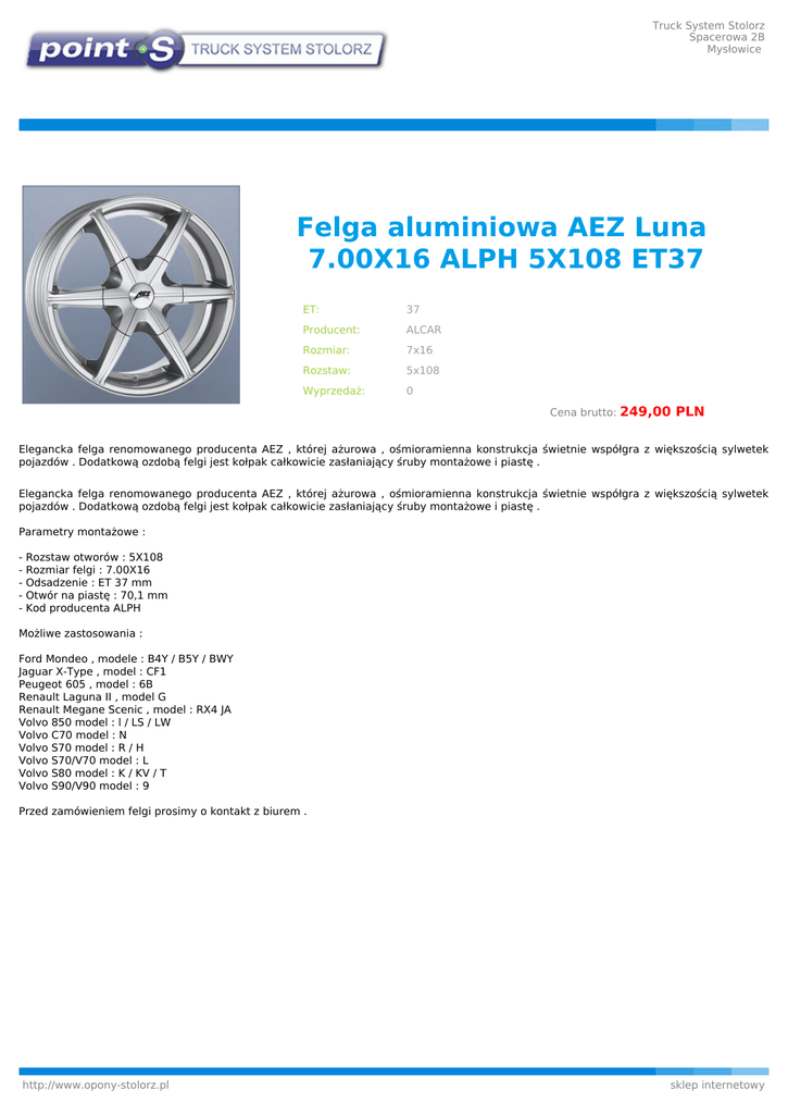 Truck System Stolorz Spacerowa 2B Mysłowice Felga aluminiowa AEZ Luna 7.00X16 ALPH 5X108 ET37 ET: 37 Producent: ALCAR Rozmiar: 7x16 Rozstaw: 5x108 Wyprzedaż: 0 Cena brutto: 249,00 PLN Elegancka felga renomowanego producenta AEZ , której ażurowa , ośmioramienna konstrukcja świetnie współgra z większością sylwetek pojazdów . Dodatkową ozdobą felgi jest kołpak całkowicie zasłaniający śruby montażowe i piastę . Elegancka felga renomowanego producenta AEZ , której ażurowa , ośmioramienna konstrukcja świetnie współgra z większością sylwetek pojazdów . Dodatkową ozdobą felgi jest kołpak całkowicie zasłaniający śruby montażowe i piastę . Parametry montażowe : - Rozstaw otworów : 5X108 Rozmiar felgi : 7.00X16 Odsadzenie : ET 37 mm Otwór na piastę : 70,1 mm Kod producenta ALPH Możliwe zastosowania : Ford Mondeo , modele : B4Y / B5Y / BWY Jaguar X-Type , model : CF1 Peugeot 605 , model : 6B Renault Laguna II , model G Renault Megane Scenic , model : RX4 JA Volvo 850 model : l / LS / LW Volvo C70 model : N Volvo S70 model : R / H Volvo S70/V70 model : L Volvo S80 model : K / KV / T Volvo S90/V90 model : 9 Przed zamówieniem felgi prosimy o kontakt z biurem . http://www.opony-stolorz.pl sklep internetowy