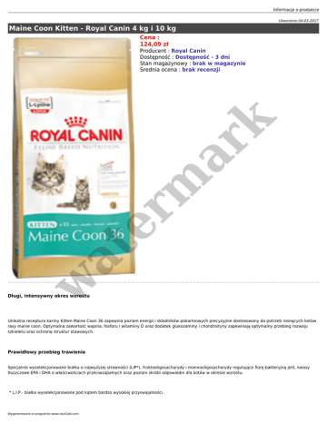 Informacje o produkcie Utworzono 04-03-2017 Maine Coon Kitten - Royal Canin 4 kg i 10 kg Cena : 124,09 zł w at er m ar k Producent : Royal Canin Dostępność : Dostępność - 3 dni Stan magazynowy : brak w magazynie Średnia ocena : brak recenzji Długi, intensywny okres wzrostu Unikalna receptura karmy Kitten Maine Coon 36 zapewnia poziom energii i składników pokarmowych precyzyjnie dostosowany do potrzeb rosnących kotów rasy maine coon. Optymalna zawartość wapnia, fosforu i witaminy D oraz dodatek glukozaminy i chondroityny zapewniają optymalny przebieg rozwoju szkieletu oraz ochronę struktur stawowych. Prawidłowy przebieg trawienia Specjalnie wyselekcjonowane białka o najwyższej strawności (LIP*), fruktooligosacharydy i mannooligosacharydy regulujące florę bakteryjną jelit, kwasy tłuszczowe EPA i DHA o właściwościach przeciwzapalnych oraz poziom skrobi odpowiedni dla kotów w okresie wzrostu. * L.I.P.- białka wyselekcjonowane pod kątem bardzo wysokiej przyswajalności. Wygenerowano w programie www.oscGold.com Wzmocnienie odporności Opatentowany kompleks współdziałających przeciwutleniaczy (witaminy E i C, tauryna, luteina) sprzyja rozwojowi naturalnych mechanizmów obronnych organizmu kocięcia. Specjalnie opracowany krokiet Unikalny krokiet, dostosowany do wielkości szczęk kociąt rasy maine coon, zachęca do rozgryzania karmy i poprawia higienę jamy ustnej. Wiek 4kg er m ar k Zalecane dzienne dawki (g/dzień): Należy zapewnić zwierzęciu stały dostęp do świeżej wody 7kg 10 kg 1 -2 miesiac Babycat 34 3 miesiac 65g 5/8 miarki 85g 6/8 miarki 105g 1 miarka 4 miesiac 65g 5/8 miarki 90g 7/8 miarki 115g 1 miarka 5 miesiac 70g 5/8 miarki 95g 7/8 miarki 120g 1 + 1/8 miarki 5/8 miarki 100g 7/8 miarki 125g 1+ 1/8 miarki 6 - 14 miesiac 70g 15 miesiac Babycat 34 Maine Coon 31 Adult Składniki: Babycat 34 Maine Coon 31 Adult Maine Coon 31 Adult SKŁAD: suszone mięso drobiowe, tłuszcze zwierzęce, ryż, izolat białka roślinnego*, kukurydza, hydrolizat białka zwierzęcego, włókno roślinne, sole mineralne, pulpa buraczana, drożdże, olej rybny, olej sojowy, fruktooligosacharydy, łupiny i nasiona psyllium, wyciąg z drożdży (źródło mannooligosacharydów), olej z ogórecznika, wyciąg z aksamitki wzniesionej (źródło luteiny), hydrolizat skorupiaków (źródło glukozaminy), hydrolizat chrząstki (źródło chondroityny). DODATKI (na 1 kg karmy): Dodatki dietetyczne: Witamina A: 25600 UI, Witamina D3: 800 UI, E1 (Żelazo): 42 mg, E2 (Jod): 2,9 mg, E4 (Miedź): 8 mg, E5 (Mangan): 55 mg, E6 (Cynk): 208 mg, E8 (Selen): 0,1 mg - Konserwanty - Przeciwutleniacze. at SKŁADNIKI ANALITYCZNE: Białko surowe: 36% - Oleje i tłuszcze surowe: 23% - Popiół surowy: 7,7% - Włókno surowe: 3% - Na 1 kg karmy: Wapń: 11,5 g Fosfor: 10,6 g - Mannooligosacharydy: 0,5 g - Fruktooligosacharydy: 3,4 g. *L.I.P.: białko wyselekcjonowane ze względu na bardzo wysoką przyswajalność. Analiza składu 0,1 Sole mineralne (%) 7,6 Włókno surowe (%) 2,9 Włókno pokarmowe (%) 8,1 EPA+DHA (%) 0,41 Tłuszcze (%) 23,0 Kwas linolowy (%) 4,56 w Kwas arachidonowy (%) Energia metaboliczna (obliczona wg NRC85) (kcal/kg) 4037,5 Energia metaboliczna (mierzona) (kcal/kg) 4250,0 Wilgotność (%) 7,0 Bezazotowe substancje wyciągowe (NFE) (%) 23,5 Kwasy tłuszczowe omega 3 (%) 0,9 Kwasy tłuszczowe omega 6 (%) 4,86 Białka (%) 36,0 Skrobia (%) 18,3 Witaminy Zawartość Biotyna (mg/kg) 3,2 Cholina (mg/kg) 2500,0 Kwas foliowy (mg/kg) 16,8 Witamina A (UI/kg) 27000,0 Witamina B1 (tiamina) (mg/kg) 53,4 Zawartość Informacje o produkcie Witamina B12 (kobalamina) (mg/kg) 0,17 Witamina B2 (ryboflawina) (mg/kg) 53,4 Witamina B3 (niacyna) (mg/kg) 530,0 Witamina B5 (kwas pantotenowy) (mg/kg) 159,4 Witamina B6 (pirydoksyna) (mg/kg) 83,1 Witamina C (mg/kg) 300,0 Witamina D3 (UI/kg) 800,0 Witamina E (mg/kg) 600,0 Sole mineralne Zawartość Wapń (%) 1,15 Chlor (%) 1,0 Miedź (mg/kg) 25,0 Jod (mg/kg) 2,8 Żelazo (mg/kg) 212,0 Magnez (%) 0,08 Fosfor (%) 1,06 Potas (%) 0,6 Selen (mg/kg) 0,2 Sód (%) 0,6 Cynk (mg/kg) 243,0 Inne er m ar k Mangan (mg/kg) 66,0 Zawartość Arginina (%) 1,92 DL-metionina (%) 1,15 Chlorek glukozaminy (mg/kg) 495,0 L-karnityna (mg/kg) 50,0 L-lizyna (%) 3,01 Luteina (mg/kg) 5,0 Metionina - cystyna (%) 1,66 Tauryna (mg/kg) 3100,0 at Dostępne opcje Maine Coon Kitten - Royal Canin 4 kg i 10 kg w » waga: 4 kg, 10 kg (+105,90 zł). Wygenerowano w programie www.oscGold.com