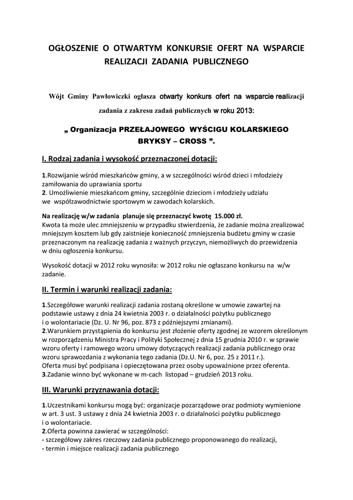 OGŁOSZENIE O OTWARTYM KONKURSIE OFERT NA WSPARCIE REALIZACJI ZADANIA PUBLICZNEGO Wójt Gminy Pawłowiczki ogłasza otwarty konkurs ofert na wsparcie realizacji rea zadania z zakresu zadań publicznych w roku 2013 2013: 013: „ Organizacja PRZEŁAJOWEGO WYŚCIGU KOLARSKIEGO BRYKSY – CROSS ”. I. Rodzaj zadania i wysokość przeznaczonej dotacji: 1.Rozwijanie wśród mieszkańców gminy, a w szczególności wśród dzieci i młodzieży zamiłowania do uprawiania sportu 2. Umożliwienie mieszkańcom gminy, szczególnie dzieciom i młodzieży udziału we współzawodnictwie sportowym w zawodach kolarskich. Na realizację w/w zadania planuje się przeznaczyć kwotę 15.000 zł. Kwota ta może ulec zmniejszeniu w przypadku stwierdzenia, że zadanie można zrealizować mniejszym kosztem lub gdy zaistnieje konieczność zmniejszenia budżetu gminy w czasie przeznaczonym na realizację zadania z ważnych przyczyn, niemożliwych do przewidzenia w dniu ogłoszenia konkursu. Wysokość dotacji w 2012 roku wynosiła: w 2012 roku nie ogłaszano konkursu na w/w zadanie. II. Termin i warunki realizacji zadania: 1.Szczegółowe warunki realizacji zadania zostaną określone w umowie zawartej na podstawie ustawy z dnia 24 kwietnia 2003 r. o działalności pożytku publicznego i o wolontariacie (Dz. U. Nr 96, poz. 873 z późniejszymi zmianami). 2.Warunkiem przystąpienia do konkursu jest złożenie oferty zgodnej ze wzorem określonym w rozporządzeniu Ministra Pracy i Polityki Społecznej z dnia 15 grudnia 2010 r. w sprawie wzoru oferty i ramowego wzoru umowy dotyczących realizacji zadania publicznego oraz wzoru sprawozdania z wykonania tego zadania (Dz.U. Nr 6, poz. 25 z 2011 r.). Oferta musi być podpisana i opieczętowana przez osoby upoważnione przez oferenta. 3.Zadanie winno być wykonane w m-cach listopad – grudzień 2013 roku. III. Warunki przyznawania dotacji: 1.Uczestnikami konkursu mogą być: organizacje pozarządowe oraz podmioty wymienione w art. 3 ust. 3 ustawy z dnia 24 kwietnia 2003 r. o działalności pożytku publicznego i o wolontariacie. 2.Oferta powinna zawierać w szczególności: - szczegółowy zakres rzeczowy zadania publicznego proponowanego do realizacji, - termin i miejsce realizacji zadania publicznego - kalkulację przewidywanych kosztów realizacji zadania publicznego - informację o wcześniejszej działalności organizacji pozarządowej lub podmiotu składającego ofertę w zakresie, którego dotyczy zadanie publiczne, - informację o posiadanych zasobach rzeczowych i kadrowych zapewniających wykonanie zadania publicznego, - deklarację o zamiarze odpłatnego lub nieodpłatnego wykonania zadania publicznego 3.Wójt Gminy Pawłowiczki może odmówić podmiotowi wyłonionemu w konkursie przyznania dotacji i podpisania umowy w przypadku, gdy okaże się, że: - rzeczywisty zakres realizowanego zadania znacząco odbiega od opisanego w ofercie, - podmiot lub jego reprezentanci utracą zdolność do czynności prawnych, - zostaną ujawnione nieznane wcześniej okoliczności podważające wiarygodność merytoryczną i finansową. 4.Złożenie oferty nie jest równoznaczne z zapewnieniem przyznania dotacji w oczekiwanej wysokości. Kwota przyznanej dotacji może być niższa od określonej w ofercie. IV. Termin składania ofert: Oferty należy składać w sekretariacie Urzędu Gminy w Pawłowiczkach, ul. Plac Jedności Narodu 1 w nieprzekraczalnym terminie do dnia 31 października 2013 r. w formie pisemnej pod rygorem nieważności z adnotacją: „Otwarty konkurs ofert na wspieranie realizacji zadania z zakresu zadań publicznych w roku 2013: „Organizacja PRZEŁAJOWEGO WYŚCIGU KOLARSKIEGO BRYKSY-CROSS”. Do oferty należy dołączyć: - kopię aktualnego odpisu z Krajowego Rejestru Sądowego, innego rejestru lub ewidencji, zgodną z aktualnym stanem faktycznym i prawnym V. Termin, tryb i kryteria stosowane przy wyborze ofert: 1. Rozpatrzenie ofert oraz ostateczne rozstrzygnięcie konkursu nastąpi w ciągu 7 dni od ostatecznego terminu składania ofert. 2. Komisja powołana przez Wójta Gminy dokona analizy złożonych ofert i przedstawi Wójtowi Gminy do zatwierdzenia swoją propozycję. 3.Akceptacja oferty jest podstawą do zawarcia umowy na wykonanie zadania i otrzymania dotacji. VI. Wybór oferty nastąpi w oparciu o następujące kryteria: 1.Wartość merytoryczna oferty. 2.Koszt realizacji zadania. 3.Ocena realizacji wcześniejszych projektów. 4.Posiadanie przez oferenta odpowiedniego doświadczenia oraz potencjału kadrowego. 5.Dotychczasowa współpraca z samorządem. 6.Rzetelność i terminowość wykonania i rozliczania dotychczasowych zadań finansowanych z budżetu gminy. 7.Posiadanie niezbędnych pozwoleń, upoważnień i decyzji, jeżeli są wymagane przepisami prawa lub innymi przepisami dotyczącymi proponowanego zadania publicznego. 8.Oferty sporządzone wadliwie albo niekompletne, co do wymaganego zestawu dokumentów lub informacji, sporządzone na niewłaściwym wzorze oferty, a także oferty złożone po terminie pozostaną bez rozpatrzenia. VII. Postanowienia końcowe: 1.Szczegółowe i ostateczne warunki realizacji finansowania i rozliczania zadania reguluje umowa zawierana pomiędzy Wójtem Gminy a wyłonionym w konkursie podmiotem. 2.Dotacje nie będą przyznawane na wydatki nie związane bezpośrednio z realizacją danego zadania. 3.Podmiot, który otrzyma dotację z budżetu Gminy Pawłowiczki jest zobowiązany do: - poddania się okresowej kontroli i ocenie realizacji zadania - wyodrębnienie w ewidencji księgowej środków otrzymanych na realizację umowy - dostarczenia na wezwanie oryginałów dokumentów (faktur, rachunków) oraz dokumentacji, o których mowa wyżej, celem kontroli prawidłowości wydatkowania dotacji oraz kontroli prowadzenia właściwej dokumentacji z nią związaną - w rozliczeniu dotacji nie będą uwzględniane dokumenty finansowe wystawione przed datą zawarcia umowy. 4. Informacja o rozstrzygnięciu konkursu